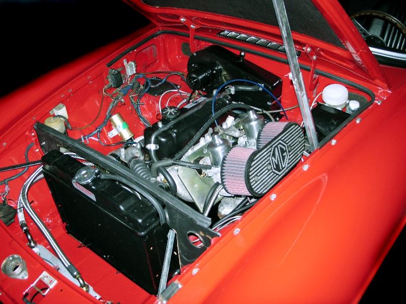 Le moteur de la MG B est extrapolé du rustique 1600 cm3 de la MG A, qui a subi un ré-alésage portant la cylindrée à 1798 cm3 et la puissance à 95 ch à 5500 tr/mn.