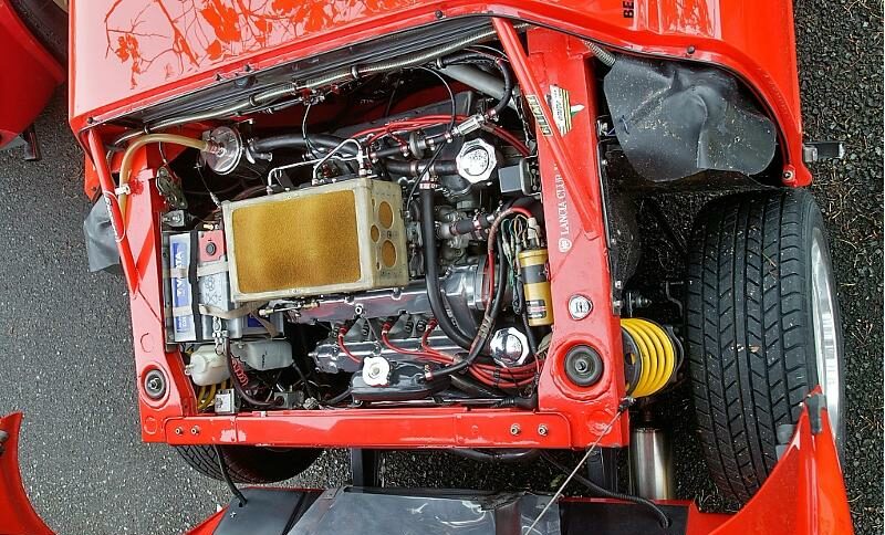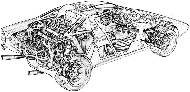 Il est intéressant de noter à ce propos le contraste existant entre la robustesse de la structure et la grande légèreté des revêtements, l’ensemble n’était pourtant pas spécialement léger : il frôlait la tonne et donnait l’impression d’avoir été plus conçu pour courir le cas échéant sur mauvais terrains plutôt que de se battre sur circuit, où la légèreté est un atout primordial. Le moteur était emprunté à la Dino, un six cylindres en V 92.5 x 6, de 2418cc, développant 180ch DIN à 7000 t/min, avec un couple maximal de 22 mkg à 4500 t/min. Né au milieu des années ’60, ce groupe pouvait développer une puissance plus importante, mais ses prestations et son architecture n’en étaient pas moins séduisantes. Ses quatre arbres à cames en tête, ses trois carburateurs double-corps Weber, son radiateur d’huile, sa boîte cinq vitesses et son pont auto-bloquant plaisaient aux amateurs italiens, tout comme les quatre roues indépendantes suspendues par ressorts hélicoïdaux et barres stabilisatrices transversales, les disques ventilés et les larges jantes en alliage de 7 1/2 sur lesquelles étaient montés des 205/70-14. A noter également, les multiples possibilités de réglage de la suspension : garde au sol ( /- 35mm), rigidité des barres, carrossage et pincement.