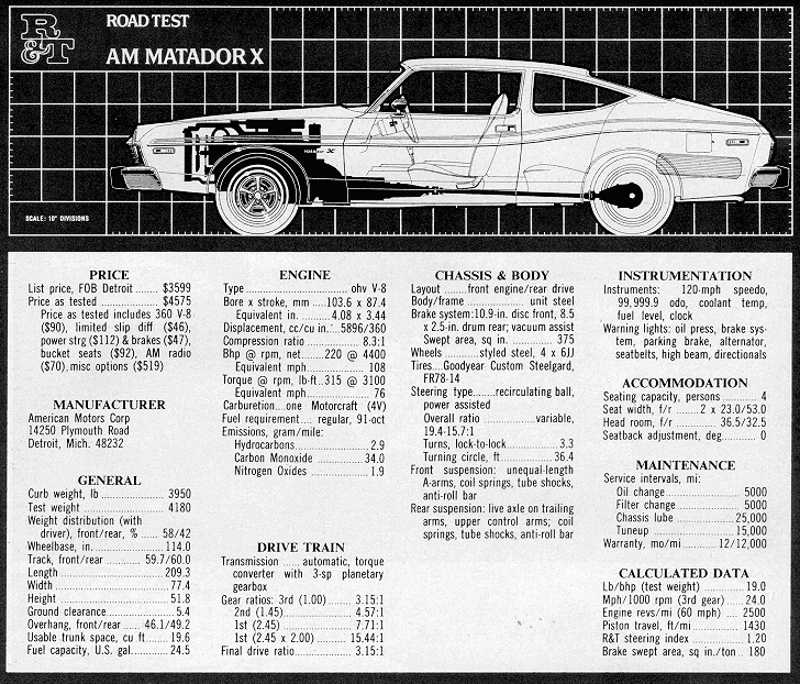 À la différence des autres voitures dans le “lineup” d’AMC, il n’y avait aucun plan pour créer une version 4 portes, bien qu’il ait y eu, apparemment, au moins un “concept de construction” d’un véhicule 4 portes…, en outre, le nouveau modèle Matador, était conçu avec des aspirations de gloire dans le circuit du NASCAR, piloté par Mark Donohue qui se positionnait au pinacle de la gloire…
