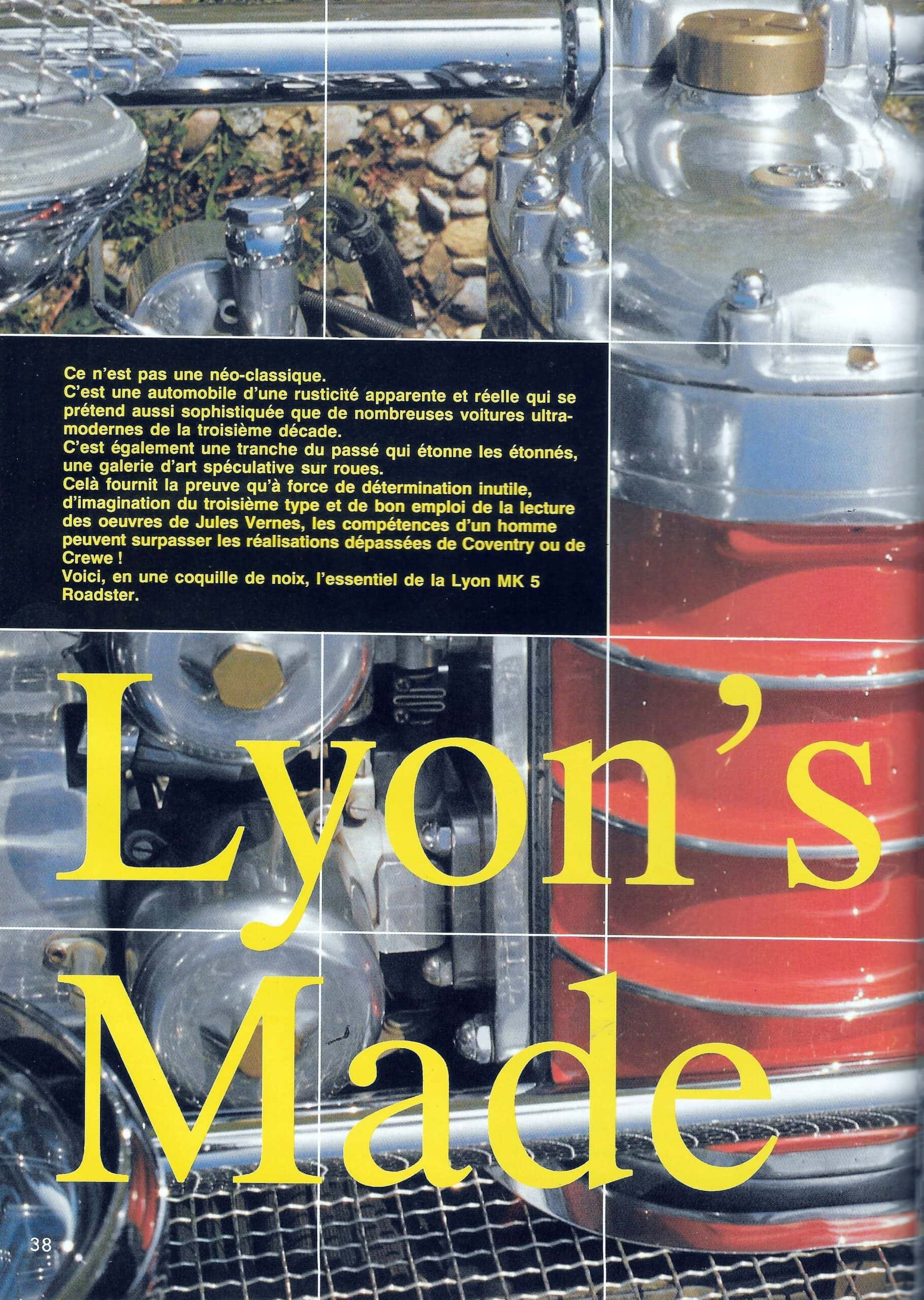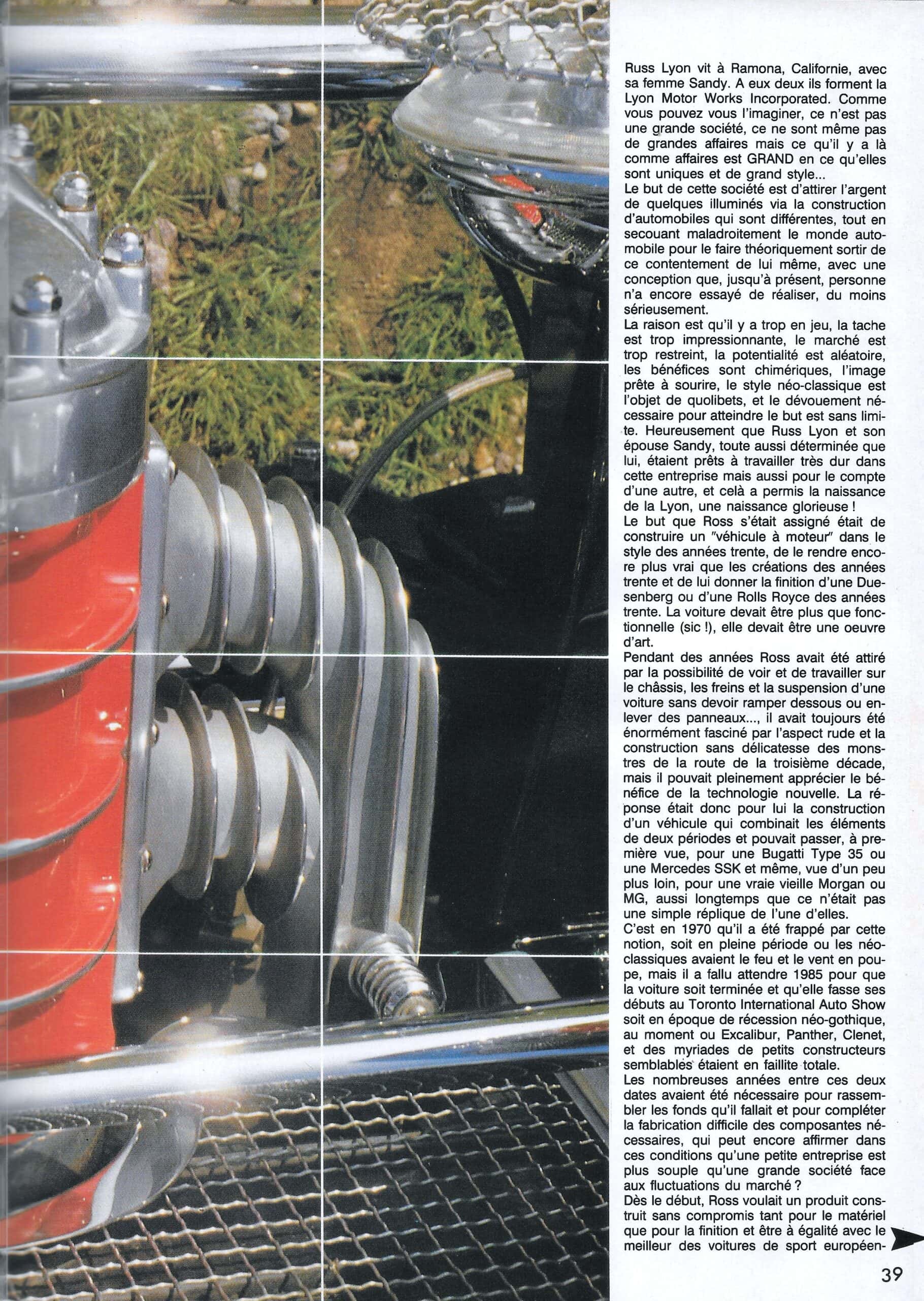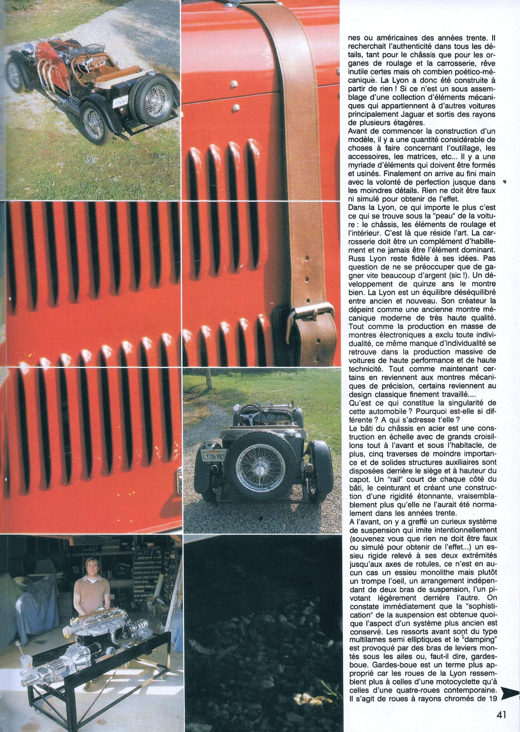 Russ Lyon vivait à Ramona/Californie, avec sa femme Sandy, à eux deux ils formaient la Lyon Motor Works Incorporated. Comme vous pouvez vous l’imaginer, ce n’était pas une grande société, ce n’étaient même pas de grandes affaires, mais ce qu’il y avait là comme affaires était GRAND, en ce qu’elles étaient uniques et de grand style…, mais ne vous méprenez pas, ce n’était pas une œuvre philanthropique…, le but de cette société était d’attirer l’argent de quelques illuminés via la construction d’automobiles différentes, tout en secouant maladroitement le monde pour le faire théoriquement sortir de ce contentement de lui même, avec une conception que, jusqu’à présent, personne n’avait encore essayé de réaliser, du moins sérieusement. L’affaire n’a pas fonctionné longtemps…, la raison étant qu’il y avait trop en jeu, la tache était trop impressionnante, le marché était trop restreint, la potentialité était aléatoire, les bénéfices chimériques…, l’image prête à sourire avec 25 ans de distance…, le style néo-classique est maintenant l’objet de quolibets… et le dévouement nécessaire pour atteindre quelconque but est resté sans limite… Heureusement que Russ Lyon et son épouse Sandy, toute aussi déterminée que lui…, étaient prêts à travailler très dur dans cette entreprise, mais aussi pour le compte d’une autre… et cela a permis la naissance en 1985 de “LA” Lyon, une naissance glorieuse !