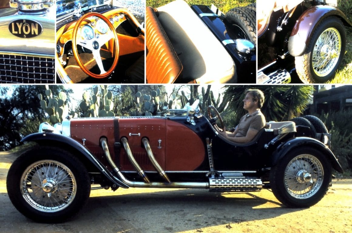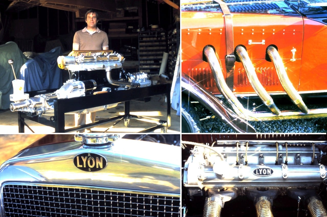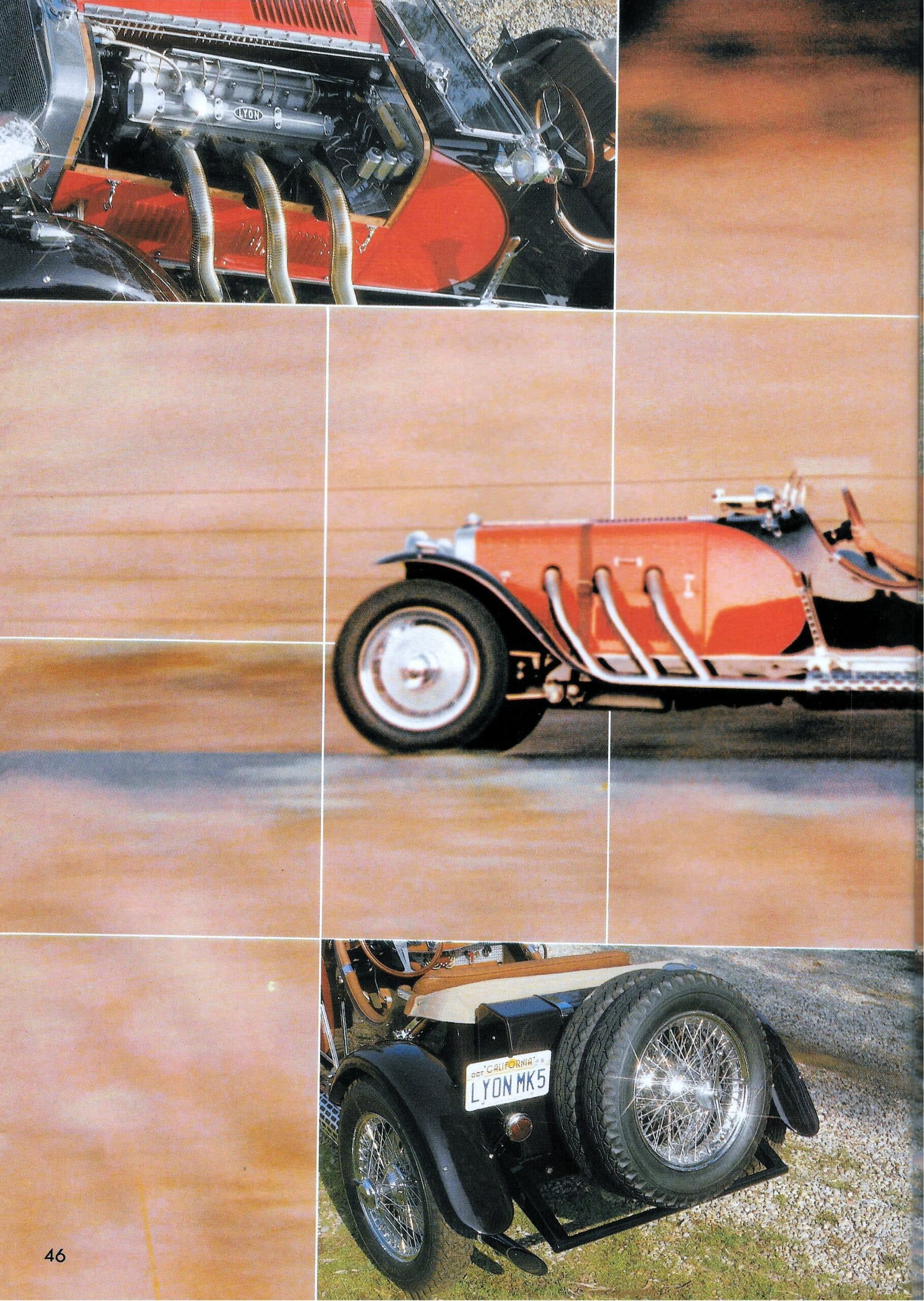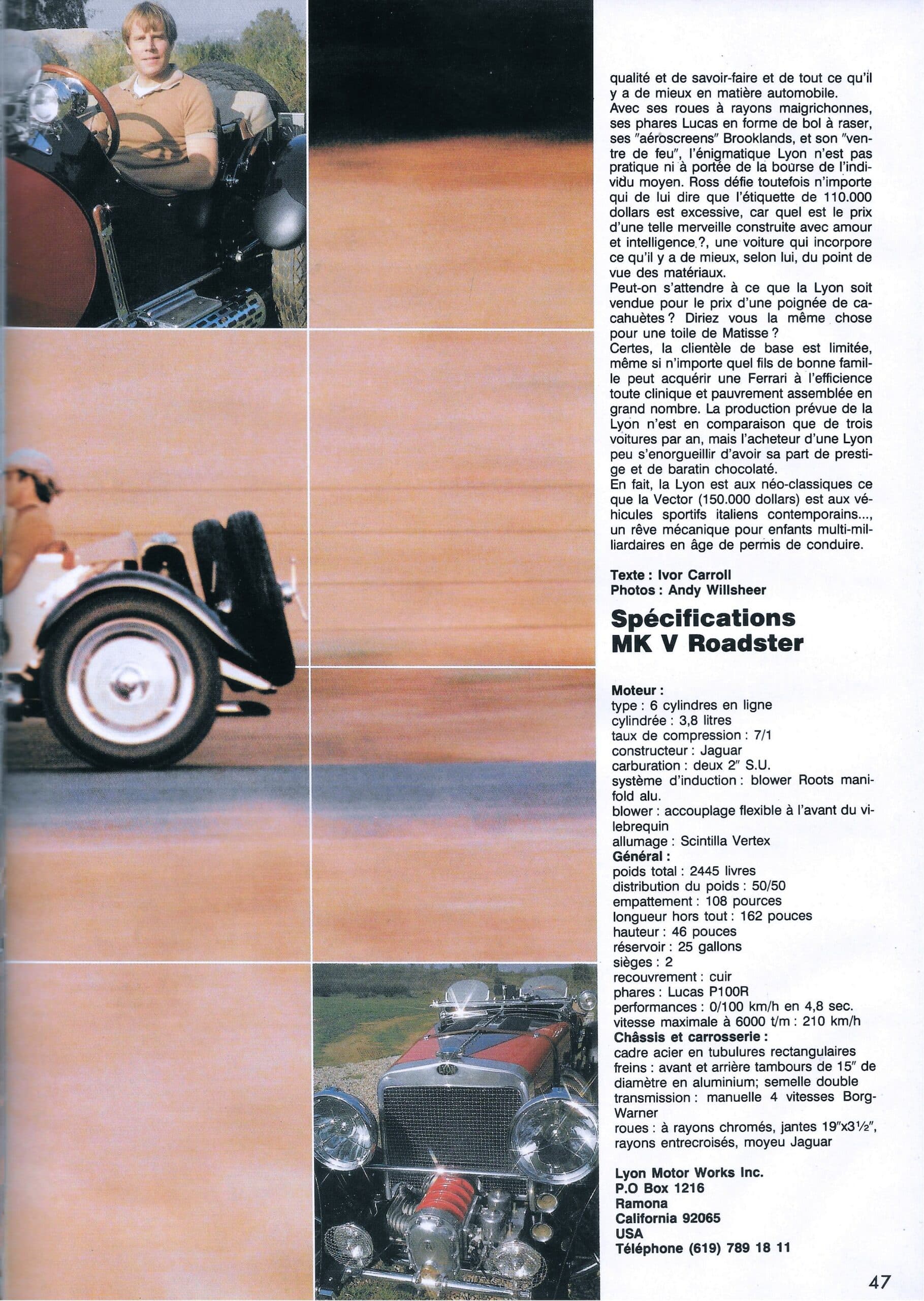 Russ Lyon vivait à Ramona/Californie, avec sa femme Sandy, à eux deux ils formaient la Lyon Motor Works Incorporated. Comme vous pouvez vous l’imaginer, ce n’était pas une grande société, ce n’étaient même pas de grandes affaires, mais ce qu’il y avait là comme affaires était GRAND, en ce qu’elles étaient uniques et de grand style…, mais ne vous méprenez pas, ce n’était pas une œuvre philanthropique…, le but de cette société était d’attirer l’argent de quelques illuminés via la construction d’automobiles différentes, tout en secouant maladroitement le monde pour le faire théoriquement sortir de ce contentement de lui même, avec une conception que, jusqu’à présent, personne n’avait encore essayé de réaliser, du moins sérieusement. L’affaire n’a pas fonctionné longtemps…, la raison étant qu’il y avait trop en jeu, la tache était trop impressionnante, le marché était trop restreint, la potentialité était aléatoire, les bénéfices chimériques…, l’image prête à sourire avec 25 ans de distance…, le style néo-classique est maintenant l’objet de quolibets… et le dévouement nécessaire pour atteindre quelconque but est resté sans limite… Heureusement que Russ Lyon et son épouse Sandy, toute aussi déterminée que lui…, étaient prêts à travailler très dur dans cette entreprise, mais aussi pour le compte d’une autre… et cela a permis la naissance en 1985 de “LA” Lyon, une naissance glorieuse !