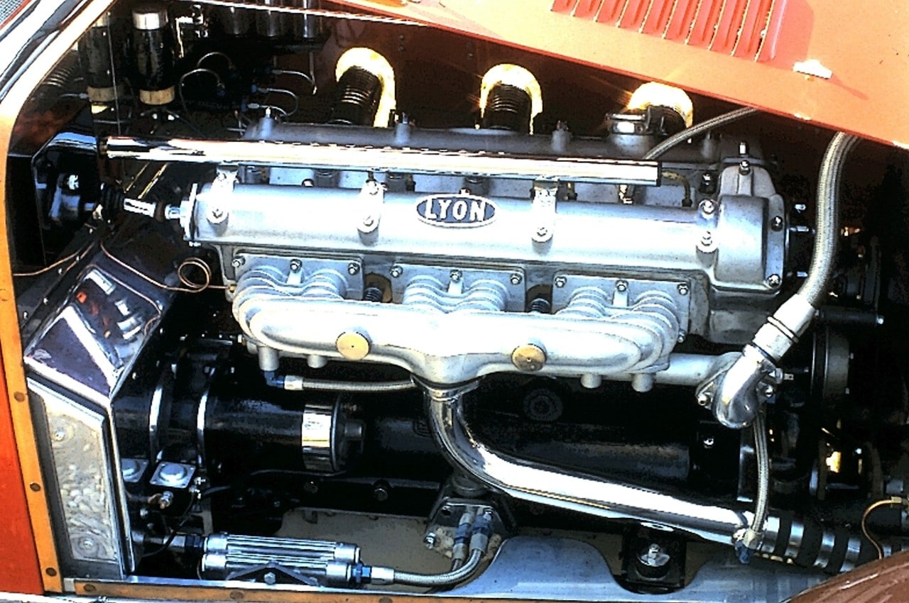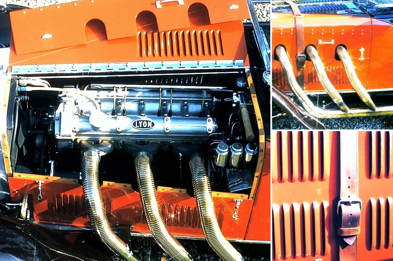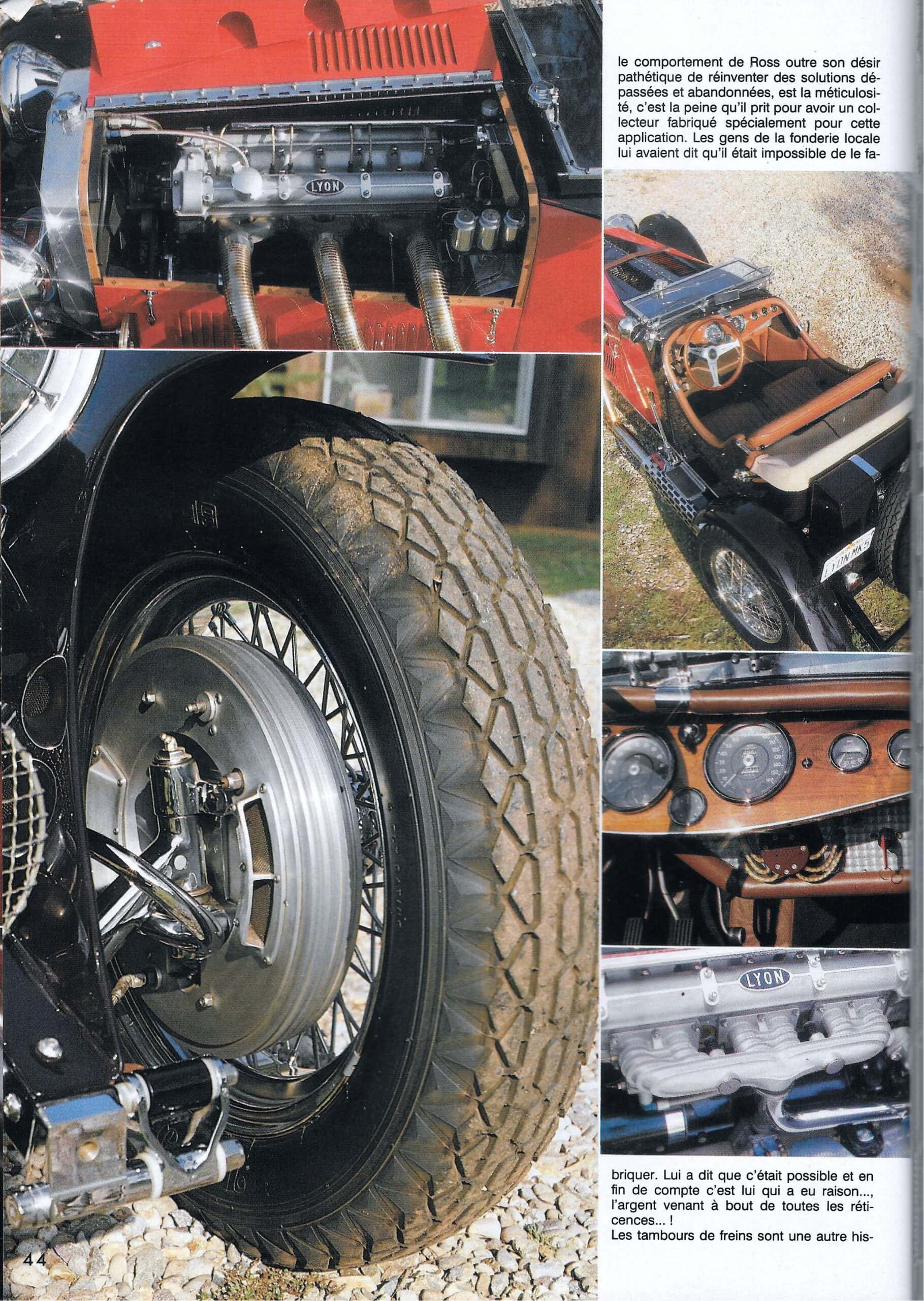 C’étaient de grosses affaires monstrueuses de quinze pouces en aluminium et les patins de frein qui s’y trouvaient enfermés étaient aussi une création de Ross…, il n’aurait pas hésité à usiner son propre moteur à soupapes latérales pour la Lyon si le temps et l’argent le lui avaient permis ! Une chose charmante mais curieuse de la Lyon était la magnéto d’allumage Scintilla Vertex, comme dans les Bugatti, qui remplaçait le distributeur standard…, un tel détail absurdement rétrograde n’était pas nécessaire, mais c’étaient justement ces petits détails qui pouvaient dérouter quelqu’un qui ne s’y connaissait pas trop en matière automobile, qui amusait Ross…, mais ou était l’utilité de dérouter un public qui s’en moquait totalement ? La voiture démarrait facilement malgré tout le fatras de solutions anciennes, et atteignait “aisément” une vitesse appréciable…! Son échappement deux fois trois-en-un, émettait un grognement sonore qui n’était jamais offensant…, en mouvement, la Lyon rugissait comme son nom l’indique…, l’expérience était physique et totale : le son, le vent et les forts accès de mouvement combinés, donnaient le frisson au puritain le plus endurci.