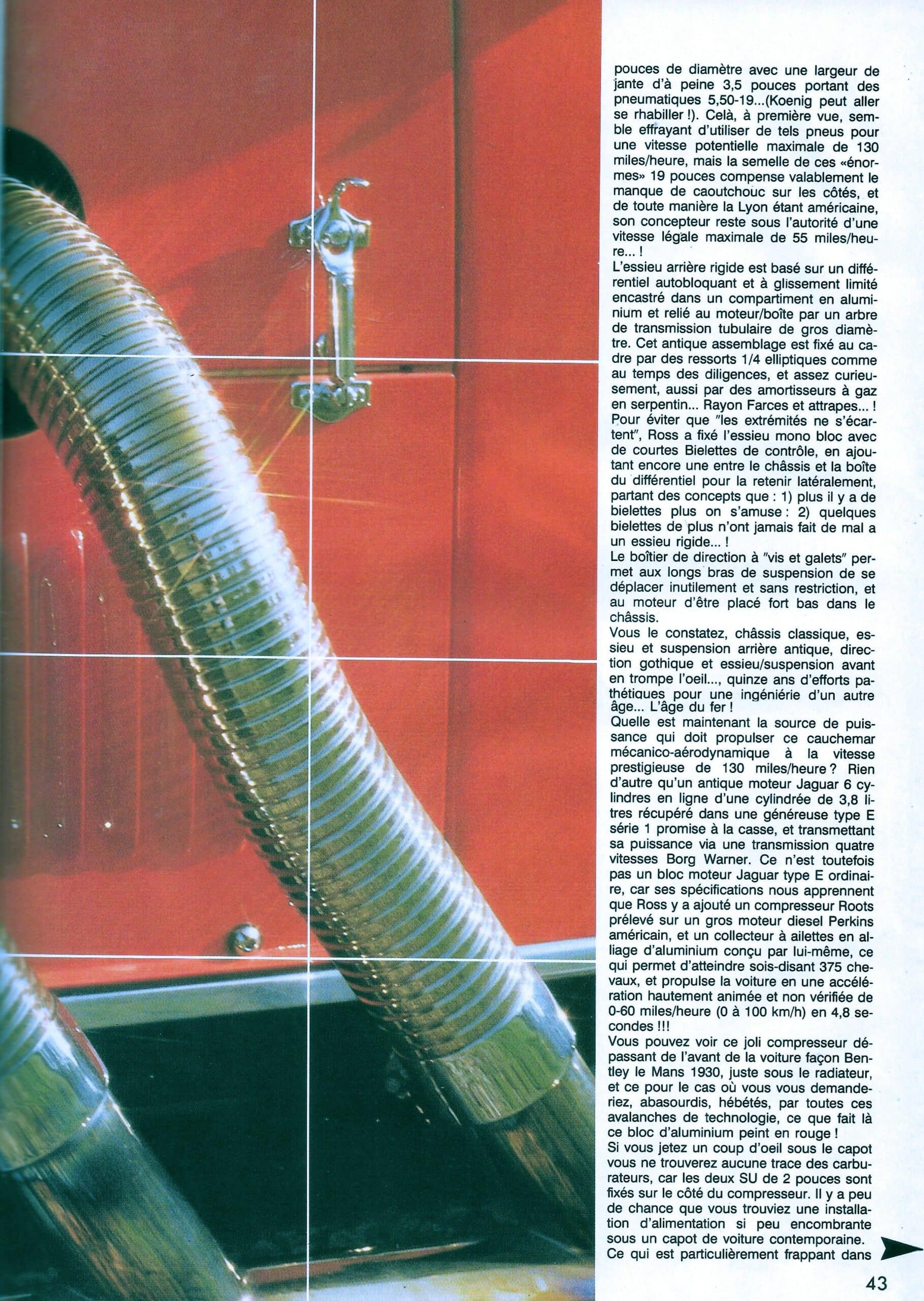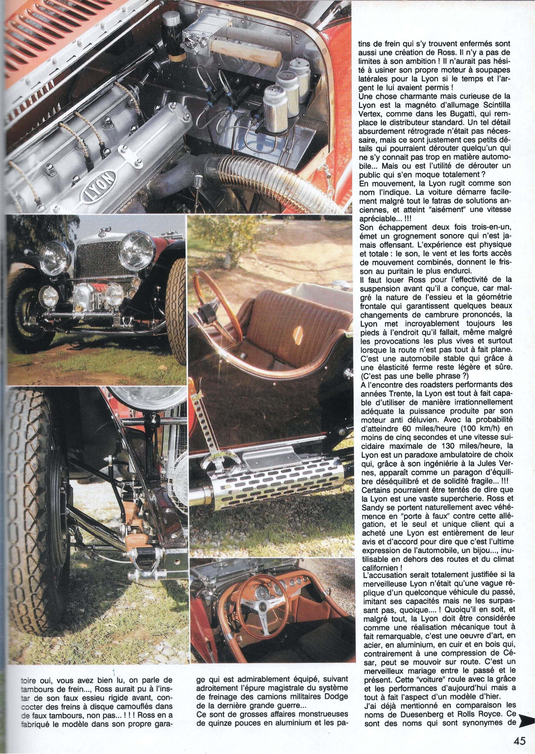 Certains pouvaient être tentés de dire que la Lyon était une vaste supercherie…, Ross et Sandy se portaient naturellement avec véhémence en “porte à faux” contre cette allégation… et le seul et unique client qui a acheté une Lyon était entièrement de leur avis et d’accord pour dire que c’était l’ultime expression de l’automobile, un bijou… Mais, elle était en réalité inutilisable en dehors des routes et du climat californien… une accusation/constatation totalement justifiée quoique la merveilleuse Lyon n’était quand même qu’une vague réplique d’un quelconque véhicule du passé, imitant ses capacités, mais ne les surpassant pas vraiment, quoique… ! Oui…, il eut mieux valu restaurer une véritable sportive des années ’30…, quoiqu’il en soit… et malgré tout, la Lyon doit être encore actuellement considérée comme une réalisation mécanique tout à fait remarquable, c’était et c’est toujours une œuvre d’art, en acier, en aluminium, en cuir et en bois qui, contrairement à une compression de César, peut encore se mouvoir sur route, un mariage entre le passé et un présent d’il y a 25 ans !