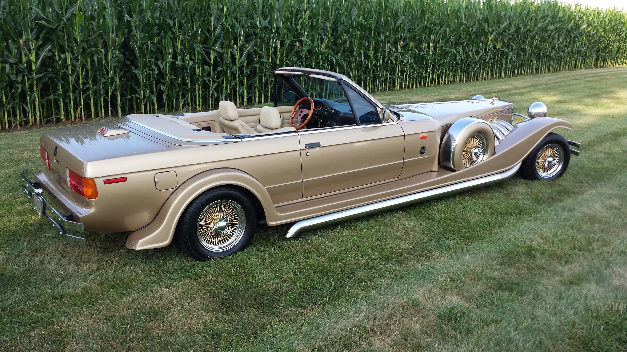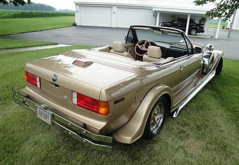 Les décisions prises dans la conception de cette voiture sont fascinantes : à l’avant, c’est très criard, voire surfait, il n’y a pratiquement aucune trace de l’existence d’une BMW 325i là-dedans…, de côté, cependant, ça commence à être plus bizarre, le capot est absurdement allongé et vient se fondre dans la carrosserie originale intouchée (évitant de se compliquer la vie dans des adaptations sans fins)…, quatre ailes à l’ancienne, façon années ’30, entourent le tout jusque vers l’arrière, ou le cul intouché s’avère austère, donnant à l’aspect global de la voiture une triste vision d’inachevé…, tout cela en couleur champagne…, pour 38.000 $, ça passe…, c’est même donné compte tenu du travail, mais qui va l’acheter ?