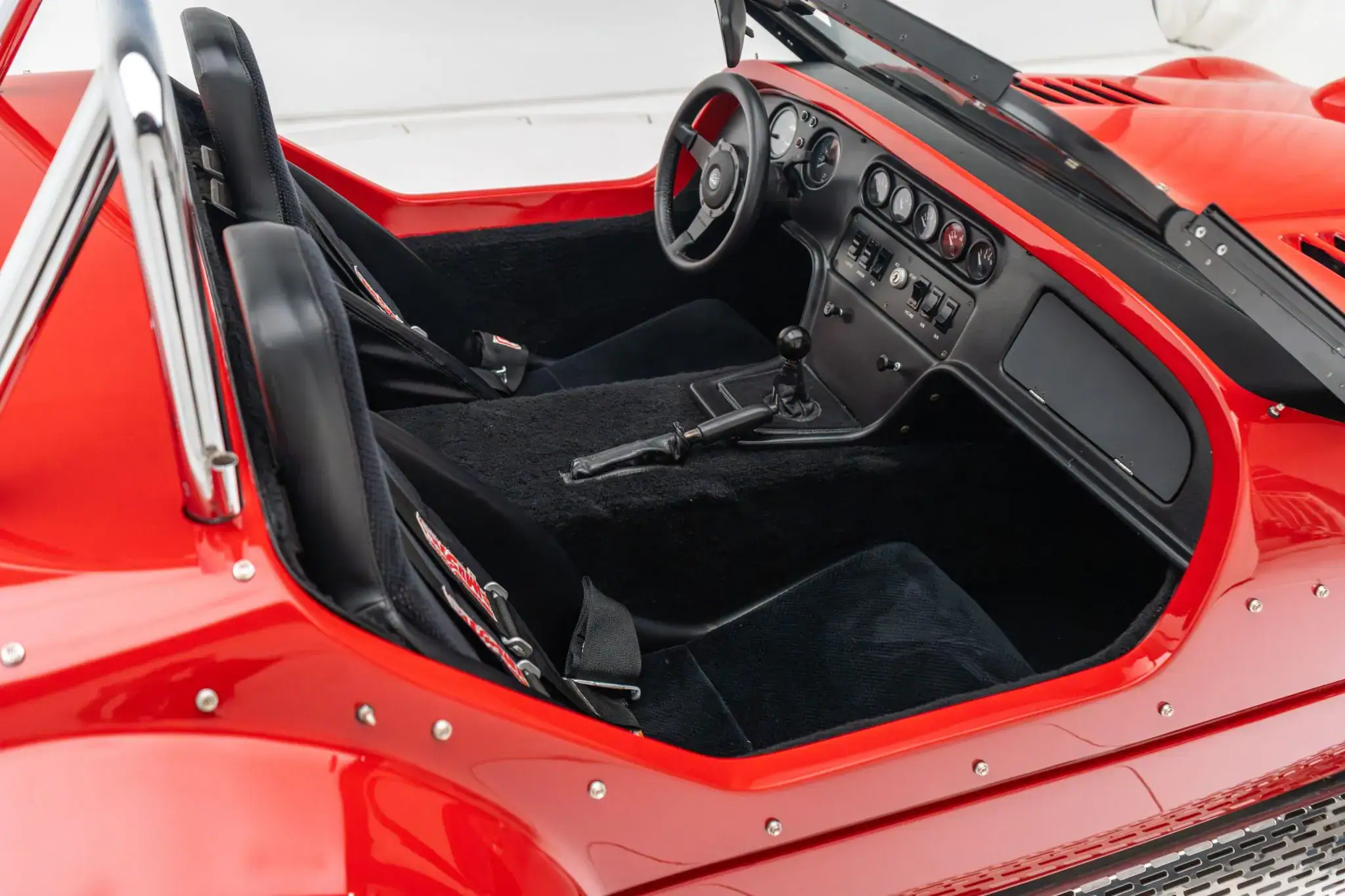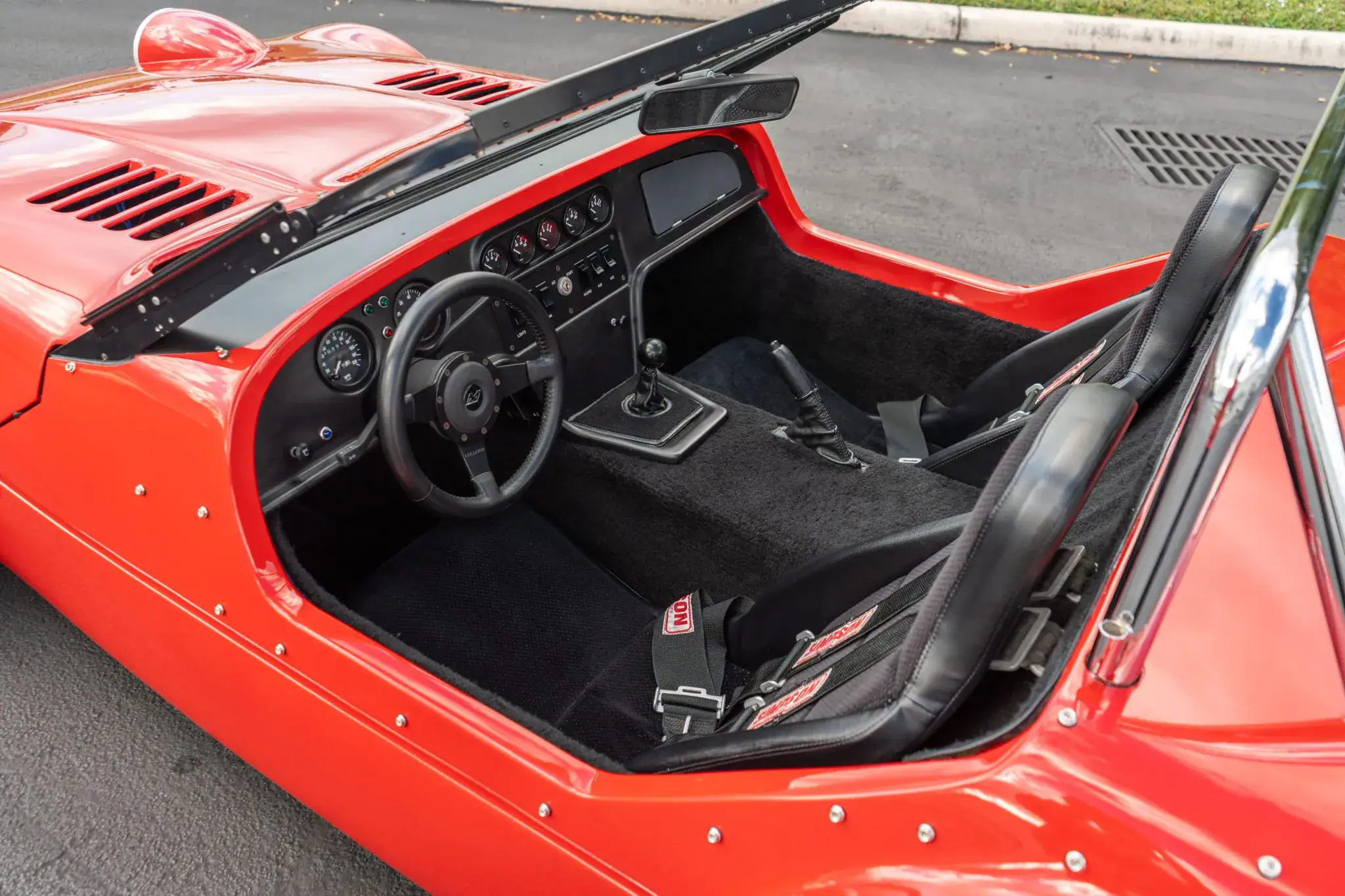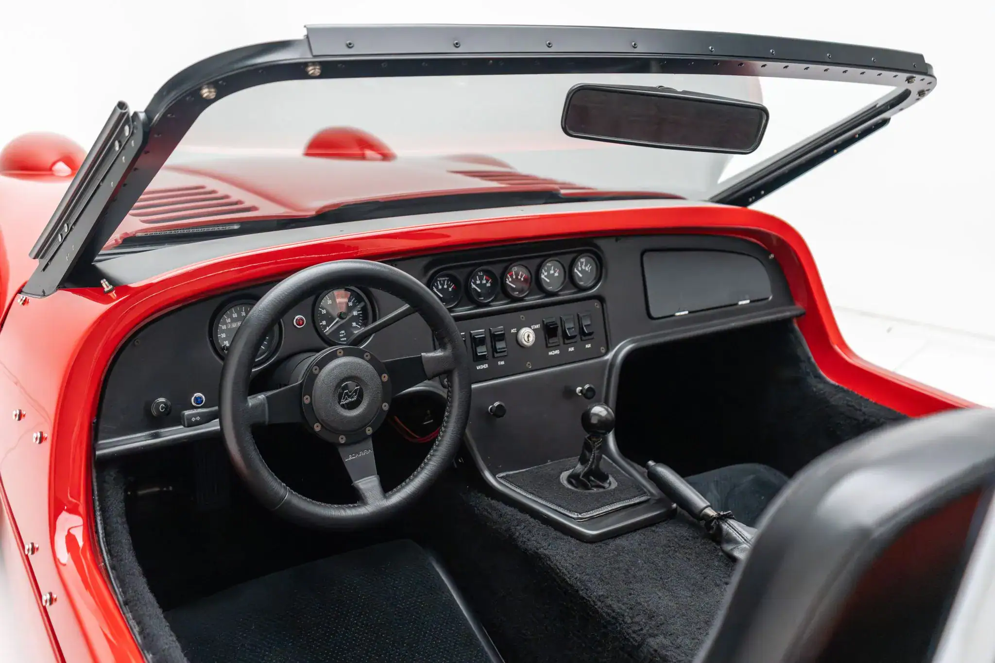 Une capote noire spermet de se protéger des intempéries. La suspension comprend des triangles de suspension supérieurs et inférieurs et une crémaillère de direction ainsi qu’un essieu rigide Mazda avec bras tirés inférieurs, bras semi-tirés supérieurs et barre Panhard à l’arrière. Une roue de secours de taille normale se trouve dans le coffre. L’habitacle est équipé de deux sièges baquets revêtus de tissu et de vinyle noirs. On y trouve également des harnais multipoints, des interrupteurs à bascule pour les fonctions du véhicule et de la moquette noire.