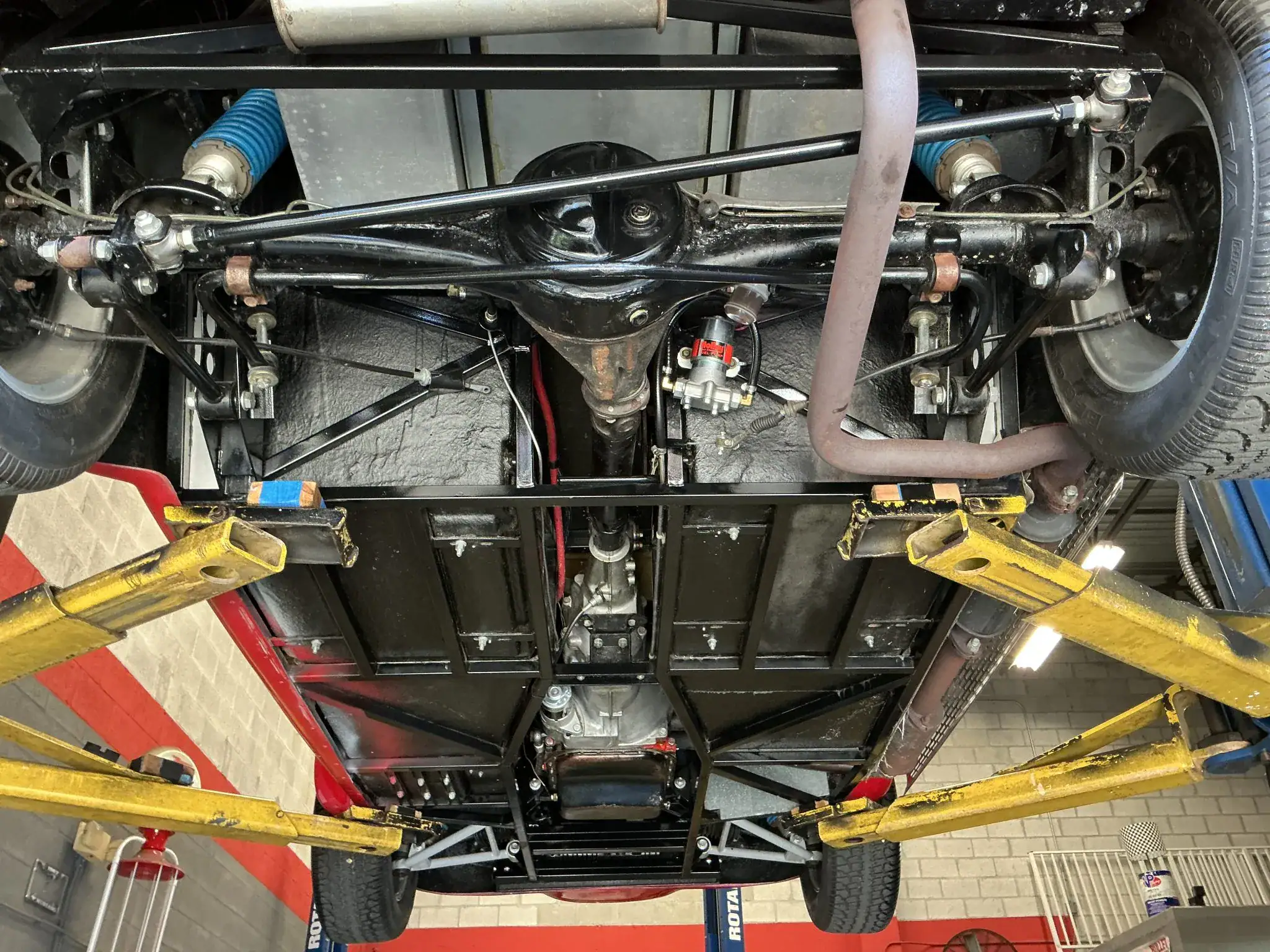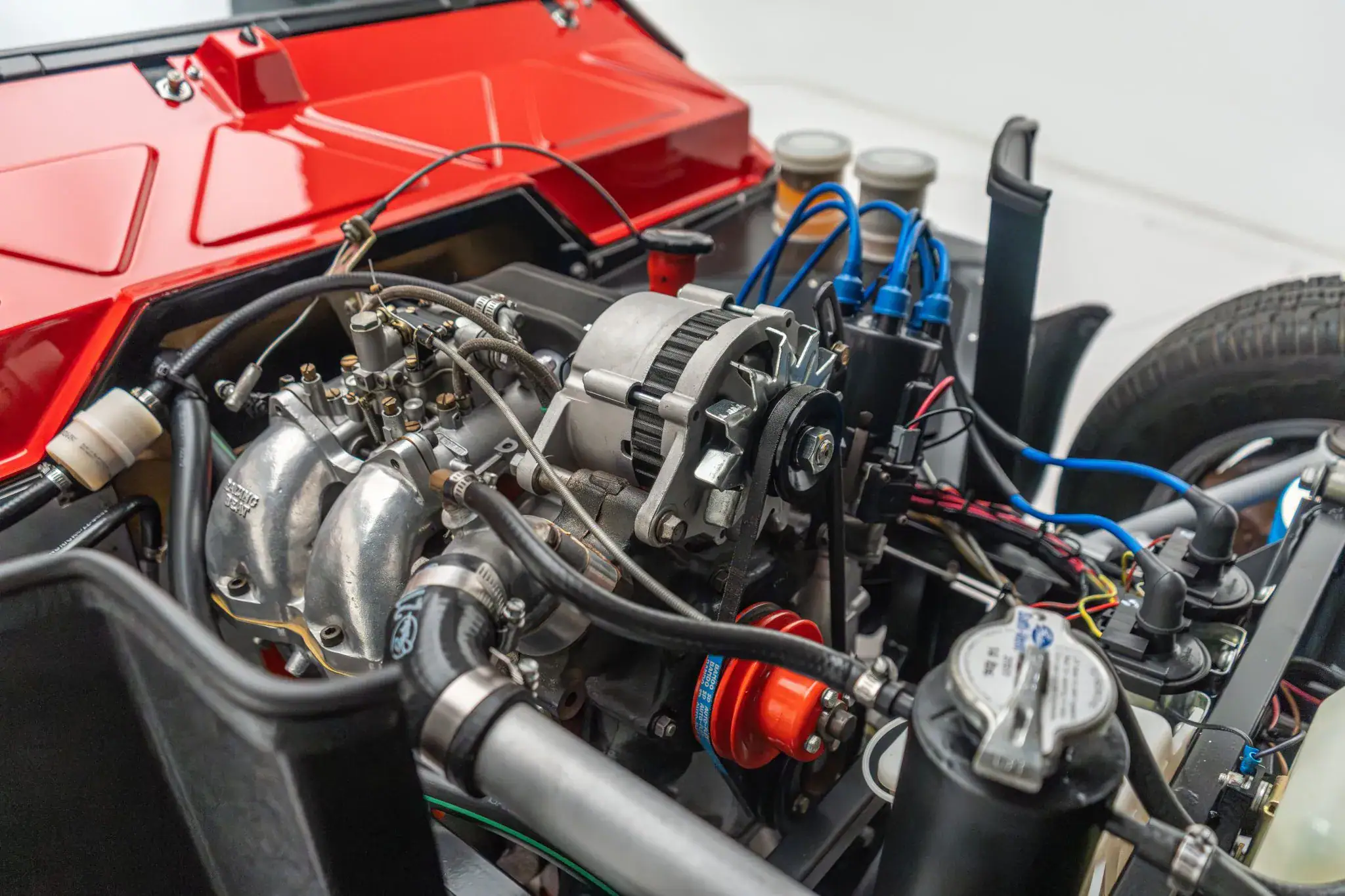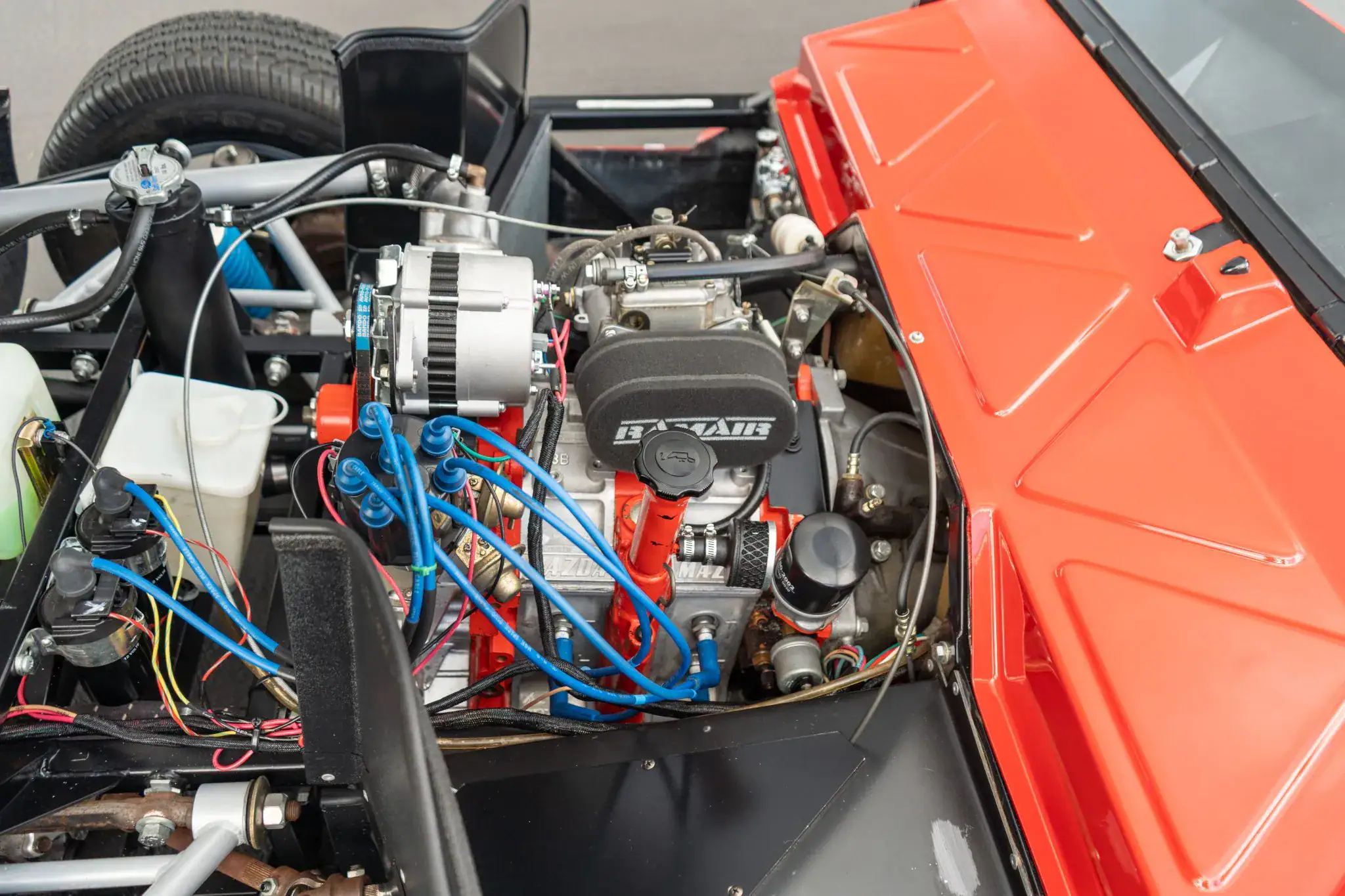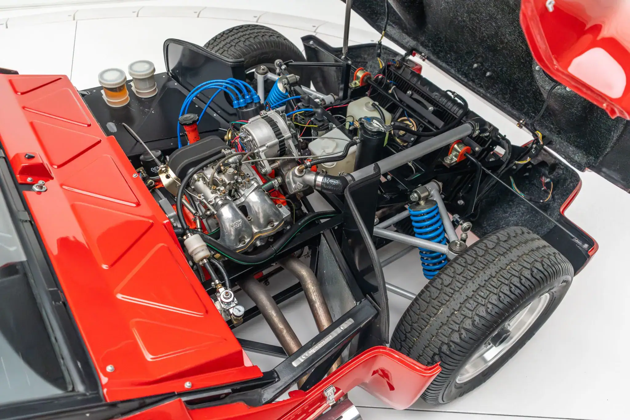 Une capote noire spermet de se protéger des intempéries. La suspension comprend des triangles de suspension supérieurs et inférieurs et une crémaillère de direction ainsi qu’un essieu rigide Mazda avec bras tirés inférieurs, bras semi-tirés supérieurs et barre Panhard à l’arrière. Une roue de secours de taille normale se trouve dans le coffre. L’habitacle est équipé de deux sièges baquets revêtus de tissu et de vinyle noirs. On y trouve également des harnais multipoints, des interrupteurs à bascule pour les fonctions du véhicule et de la moquette noire.
