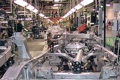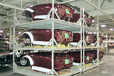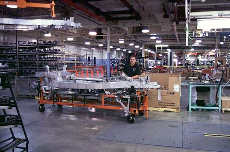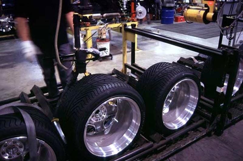 – No Comment… Un V10 Viper n’est pas prévu ! Tous les panneaux de carrosserie du Prowler, y compris l’habitacle, sont en aluminium pré-peint, sauf le quart arrière, qui est en fibre de carbone.. et la calandre qui est en plastique, couleur de la carrosserie. Les portes sont assemblées avant leur installation. Une fois que la carrosserie est fixée sur le châssis, le Prowler est présenté sur une machine d’alignement “state-of-the-art”, unique, que je vous demande de ne pas photographier. Chaque véhicule est ensuite vérifié avant l’installation des jantes déjà équipées des pneus, jantes entièrement équilibrées par Michelin avant que le tout ne soit livré à l’usine.