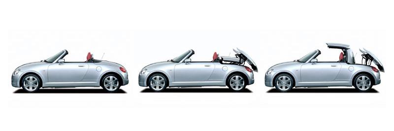 L’adjonction d’optiques rondes lui fait toutefois perdre le sérieux germanique pour le coté ‘kawai’ qu’affectionne la jeunesse nipponne…, la ligne du toit n’est certes pas des plus harmonieuses mais elle ne fait que souligner le tour de force du pool d’ingénieurs chargé de sa conception…, la Copen est tout simplement le plus petit coupé-cabriolet de la production, et parvenir à contenir le complexe système dans un espace si contenu tient réellement de l’exploit.