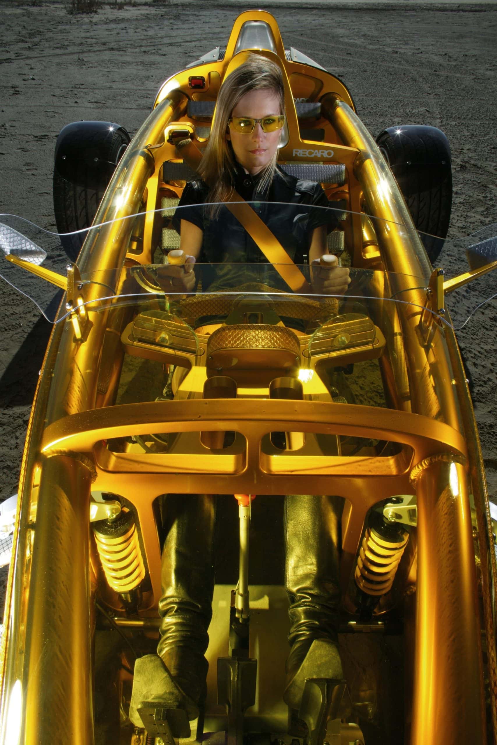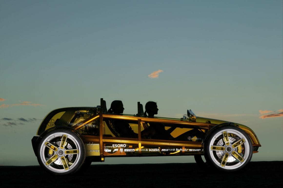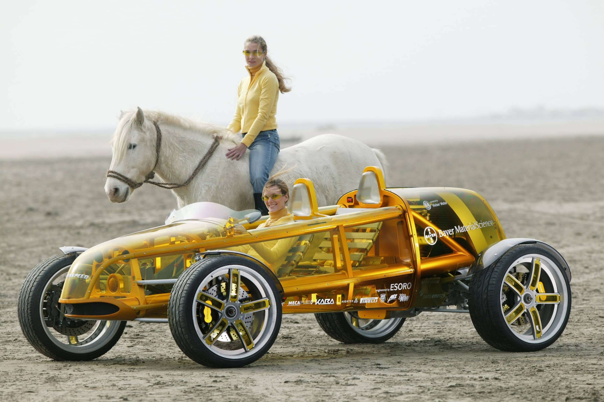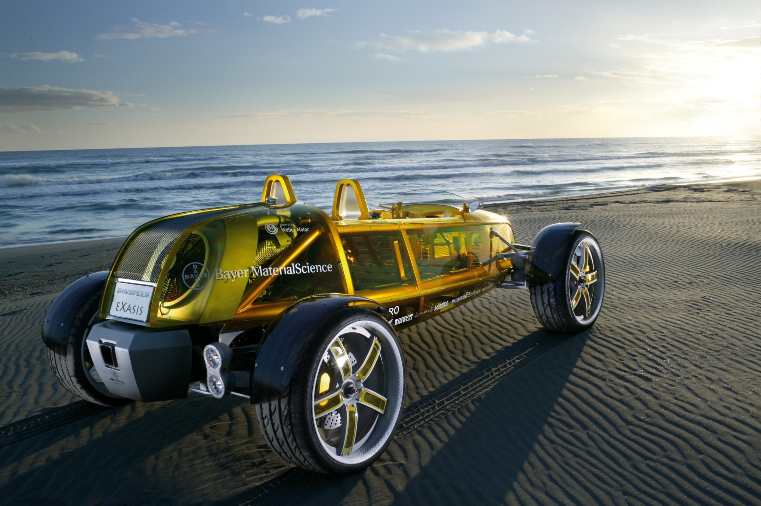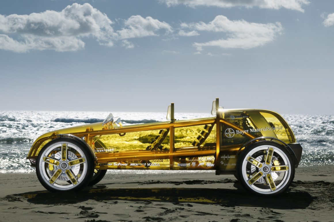 On avait l’impression ici que tout avait été découpé à partir d’une seule pièce, et c’était d’ailleurs vraiment le cas pour les cloisons…, l’eXasis attirait donc les regards à plus d’un titre : l’enveloppe extérieure en Makrolon® moulée par la société suisse Mecaplex et parée d’un zeste de jaune par KRD, le spécialiste allemand de la nouvelle technologie Hard Coating, dévoilant le châssis en aluminium du véhicule…, et pourtant, l’ensemble de la construction donnait l’impression d’être aussi léger que le bambou : cette légèreté étant accentuée par une mise en peinture à effets spéciaux de Lesonal, à base des matières premières pour peintures et vernis Desmodur® et Desmophen® de Bayer MaterialScience.