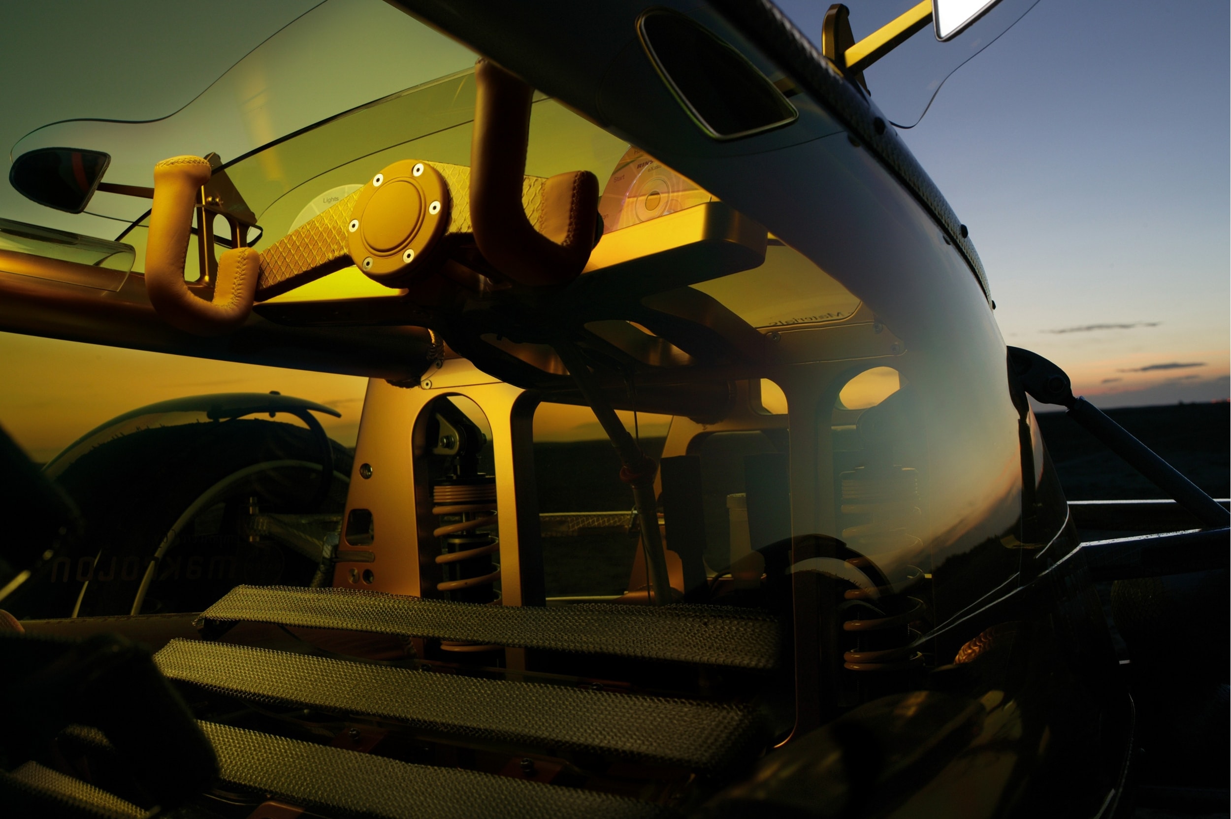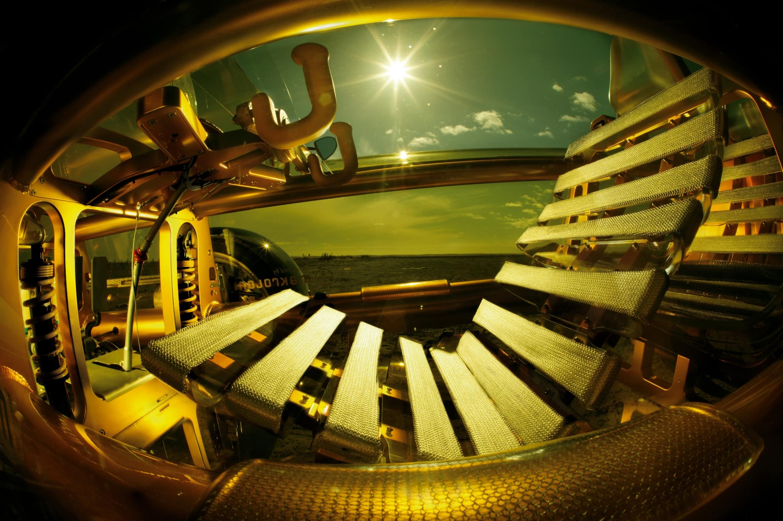 Chaque siège était constitué de douze bandes transparentes en Makrolon® rappelant les douze paires de côtes des passagers (sic !), ainsi que d’un appuie-tête et d’un accoudoir en Technogel® translucide…, les deux passagers prenaient place sur des sièges spéciaux créés en collaboration avec Recaro.