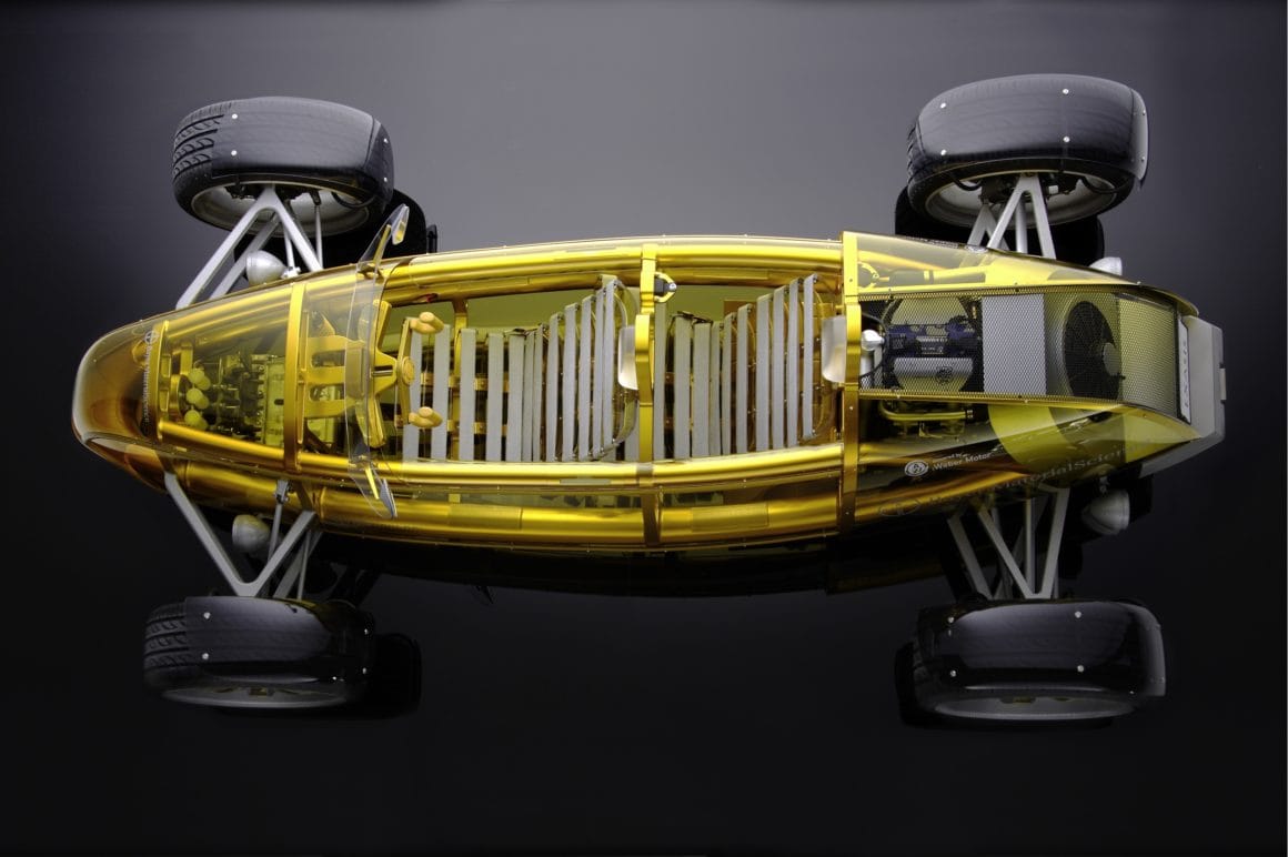L’idée est quand même de démontrer qu’une auto ne se résume pas à son physique mais que la somme des compétences nécessaires à “faire une voiture” s’exprime plus dessous que dessus…. en conséquence, pour le coup, le moteur de la bête, est un étonnant bi-cylindres de 750 cc de 150 cv qui fonctionne au bio-éthanol…, un moteur 4 temps qui est l’oeuvre de Weber motors avec qui Rinspeed a travaillé plusieurs fois…, avec ses 750 kgs, l’eXasis est loin d’être une limace et question frissons, le plancher translucide apporte son lot de sensations inconnues pour une auto !