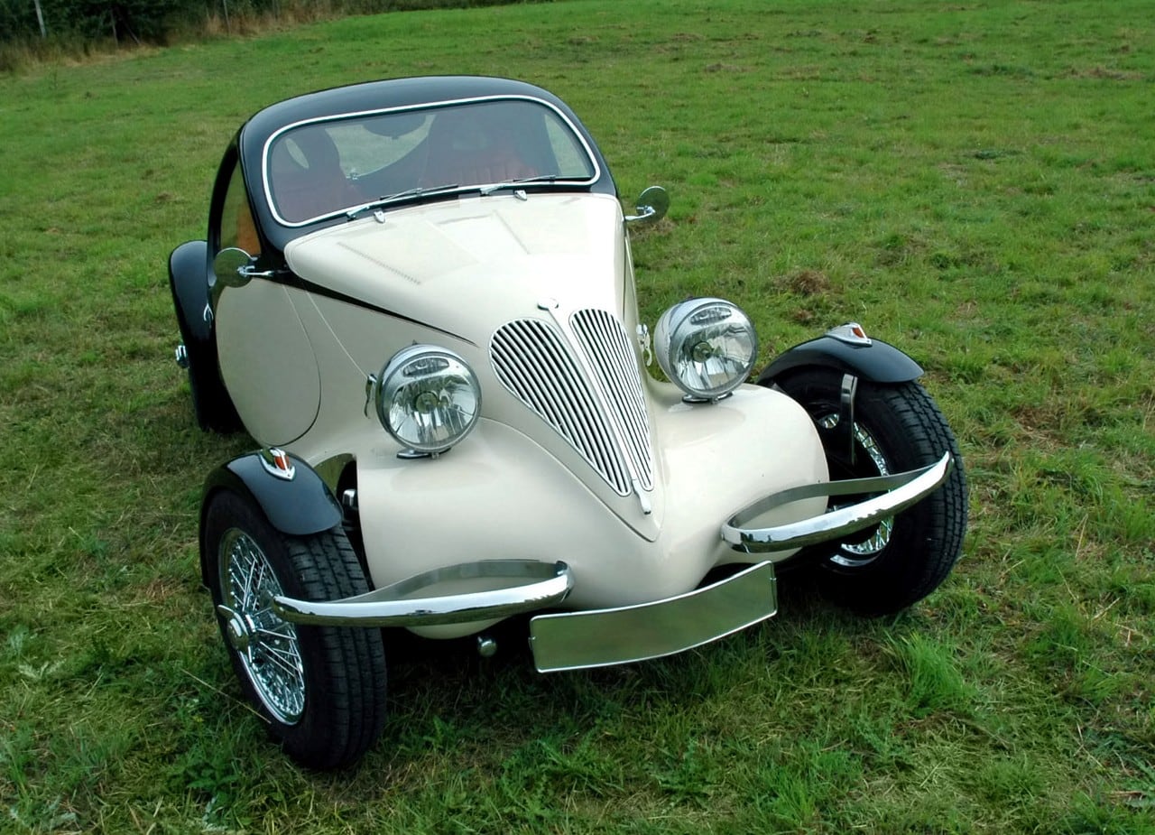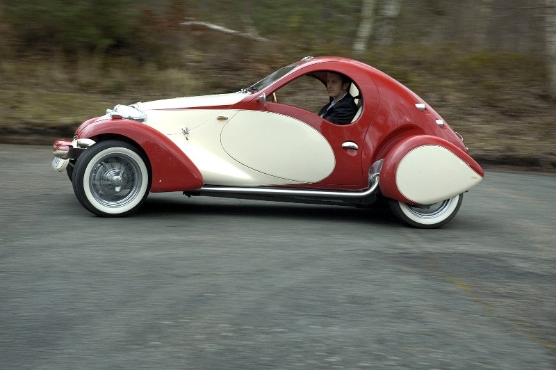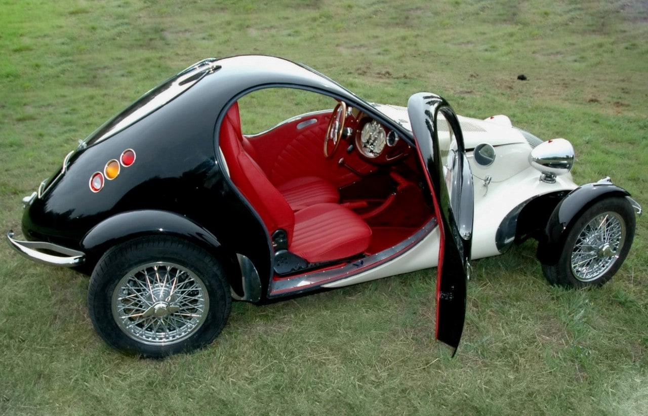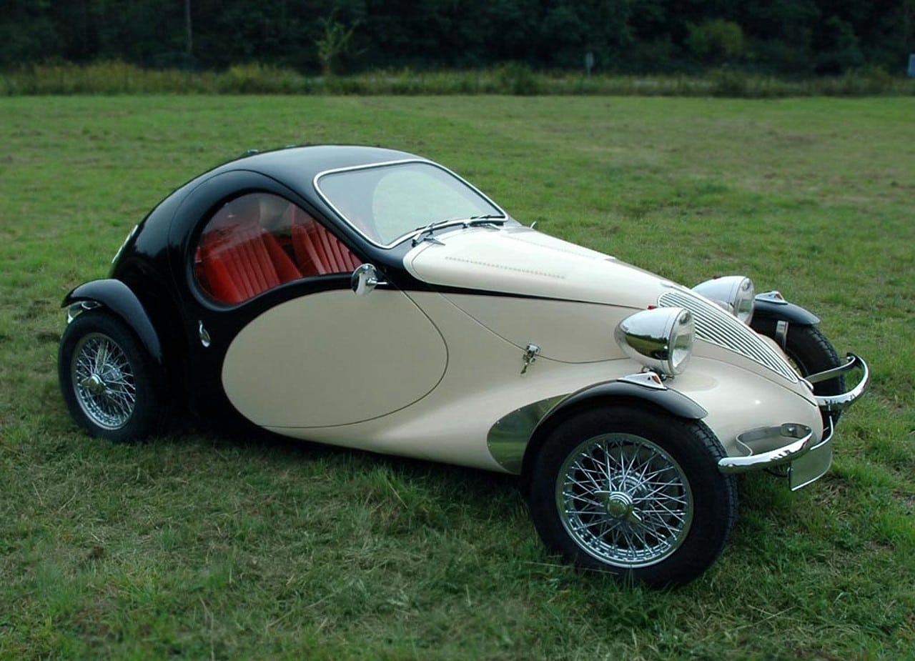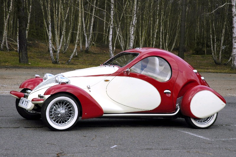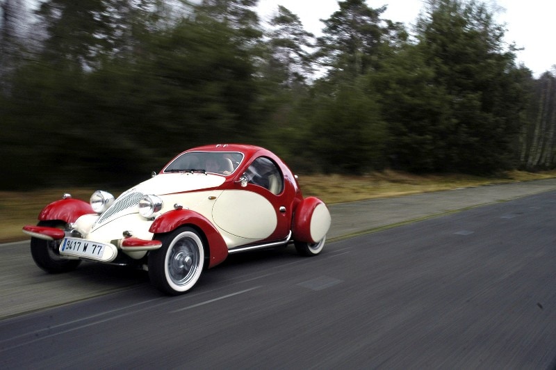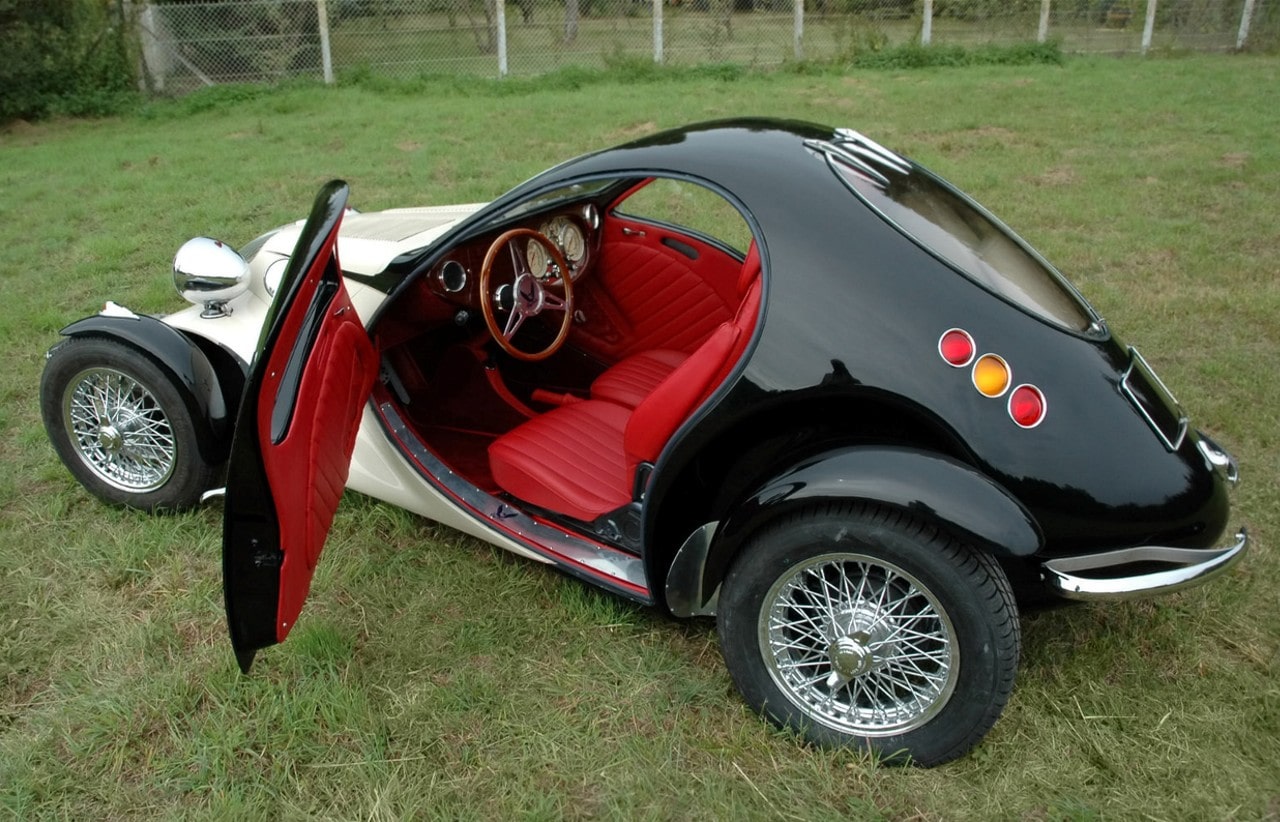 Courbes baroques, vitres latérales en gouttes d’eau, jantes à rayons en option (jantes en tôle peintes, avec des trous-trous en version standard), la 4Stroke Rumen est sans doute inspirée d’une interprétation fantaisiste de la Bugatti type 57, mais les proportions n’y sont pas plus que la taille de la voiture qui flirte avec les microcars baroques, si bien qu’elle semble sortir tout droit d’un musée dédié aux folies en réduction d’une autre époque…