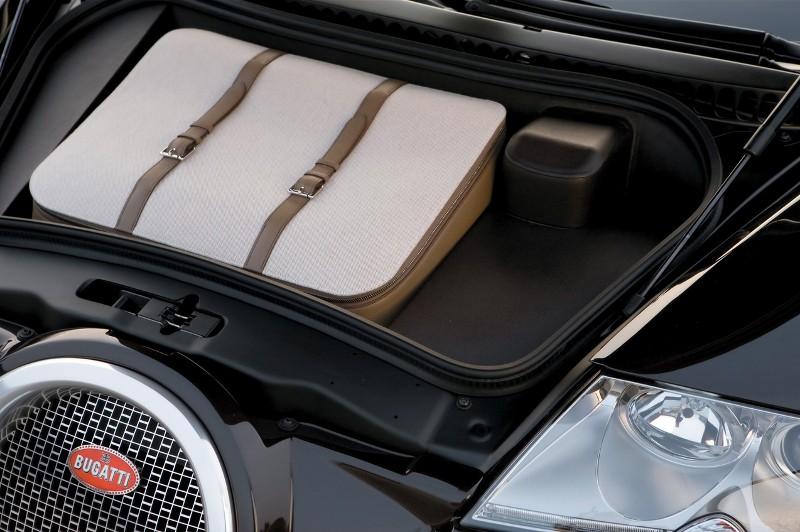 L’habitacle est entièrement garni de cuir de taurillon (petit taureau) et le coffre à bagages accueille une valise en toile H et cuir, conçue spécialement pour la Veyron et dont l’aspect est franchement à pleurer.