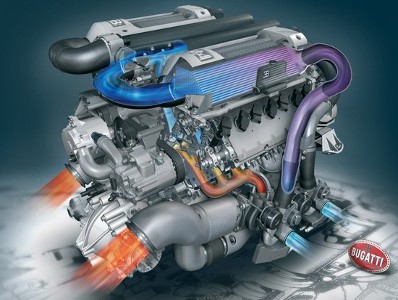 Le W16 est coiffé par deux culasses à quatre soupapes par cylindres (une par VR8), soit 64 soupapes au total et l’ensemble est suralimenté par quatre turbocompresseurs, dont la pression de suralimentation n’est pas connue.