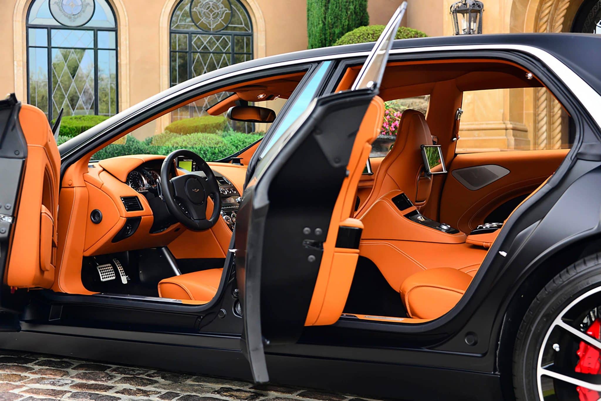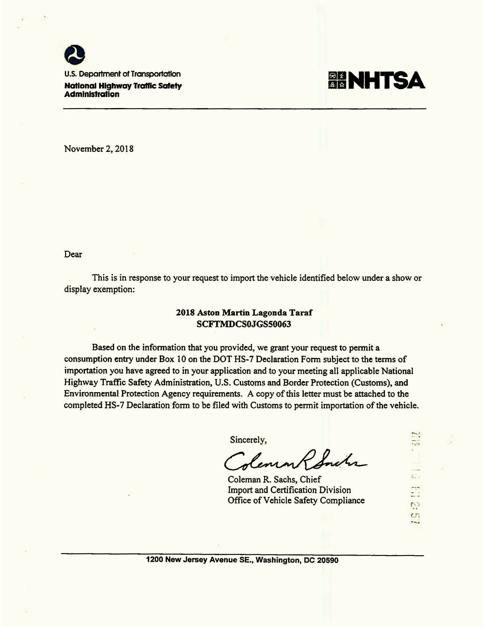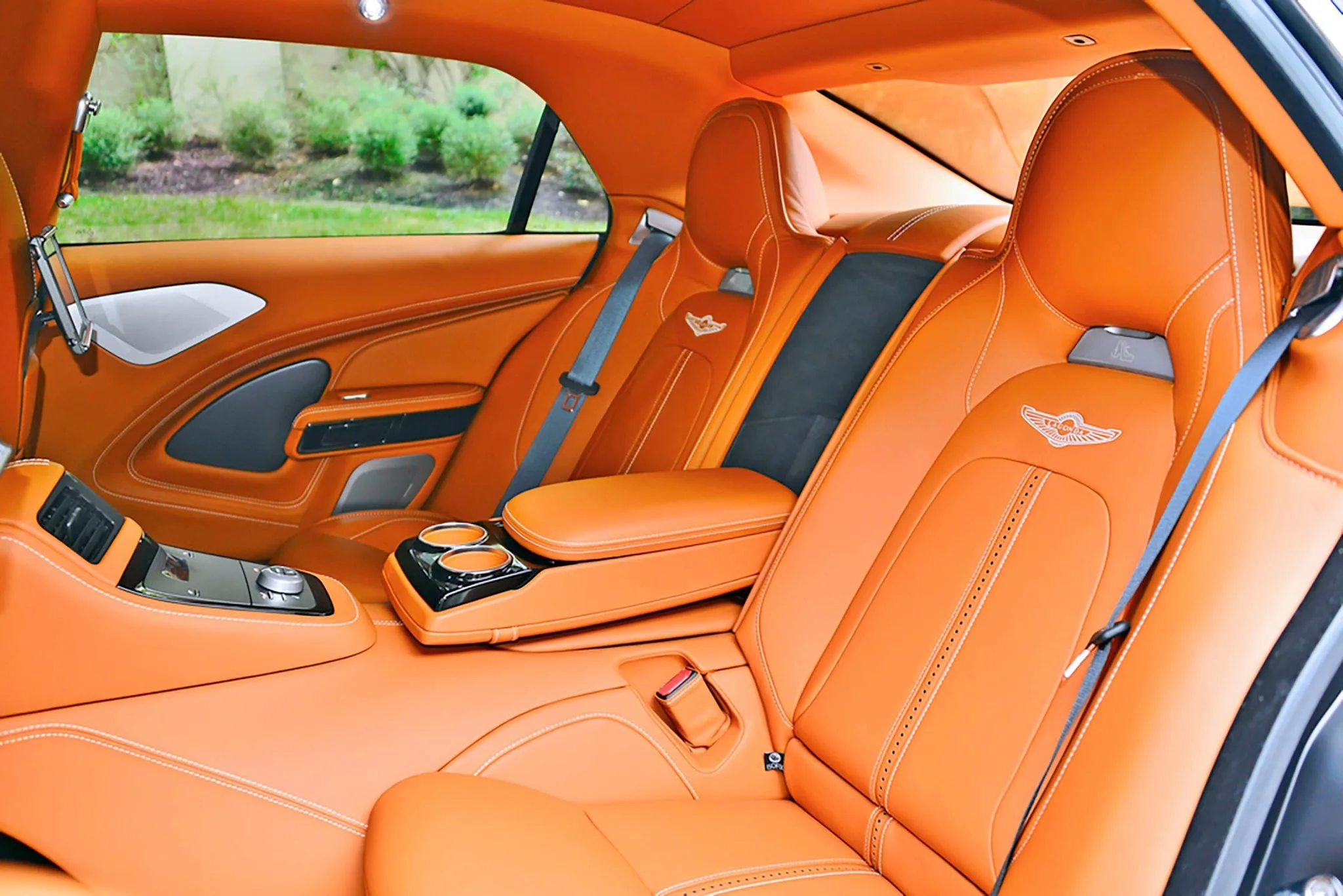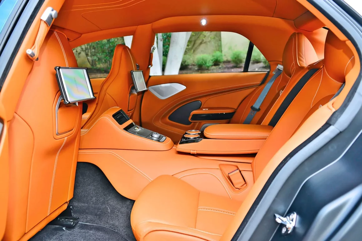 Les sièges sont en cuir “Kestrel Tan Caithness” accentué par des coutures de couleur ivoire, à l’arrière se trouve un réfrigérateur et un système d’info-divertissement. Cette Lagonda Taraf à conduite à gauche n’affiche 151 miles en 3 ans (1 mile de trop par rapport à l’obligation de 50 miles maximum par an sur 3 ans) Pour ce mile, la Taraf a été saisie et mise en vente forcée avec des documents NHSTA “Show or Display” pour avoir “Gravement désobéi aux normes US imposées de 50 miles/an, en dépassant la limite autorisée de 1 mile, vérifié parla NHSTA”... La voiture doit être vendue au plus offrant dans une vente NHSTA avec ses documents d’importation, les factures de mises aux normes par J.K. Technologies, de la documentation et des rendus de construction d’usine, un parapluie de marque Lagonda, un manuel du propriétaire, un rapport Carfax et le titre de propriété de l’Oregon répertoriant la voiture comme une Aston Martin Taraf 2018. Conformément à l’acceptation du propriétaire importateur des normes NHSTA, le montant de la vente forcée ira à la NHSTA…