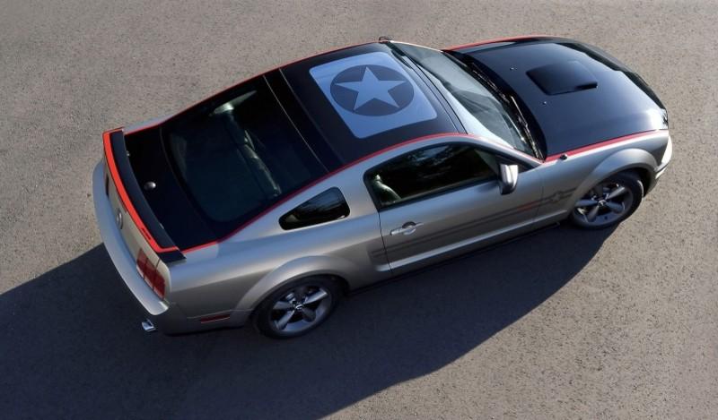Pour “aider” à donner une image “vitalisante” de la Mustang… et ce en même temps qu’était présentée la nouvelle version (en réalité un re-looking), les pontifes de Ford ont réalisé au départ d’une Ford Mustang GT 2008, une unique version se parant aux couleurs de l’aviation militaire, en l’honneur du fameux avion de chasse P51 Mustang figther ayant joué un rôle majeur durant la Deuxième Guerre Mondiale.