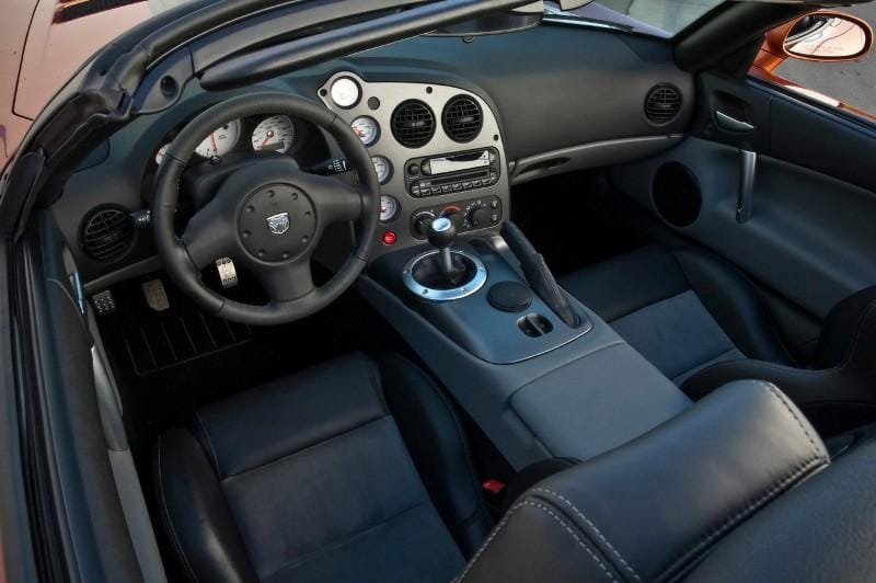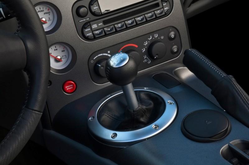 – Les options de couleur pour l’intérieur comprennent : standard noir…, bicolore noir et rouge avec surpiqûres rouges…, bicolore noir et bleu avec couture bleues…, deux tons ardoise noir et gris moyen avec surpiqûres gris ardoise moyen accentué. Sur le modèle Roadster, la capote peut être de n’importe quelle couleur…. La Dodge Viper V10 SRT ACR reçoit un nouveau levier de vitesses à course réduite pour une expérience de conduite améliorée et de meilleures performances. Le profil d’aile arrière et est remanié pour optimiser l’aérodynamisme et améliorer l’appui. Les suspensions à quatre roues indépendantes sont caractérisées par des bras en aluminium haute performance. Le package aérodynamique doté d’un répartiteur réglable à l’avant est en fibre de carbone…