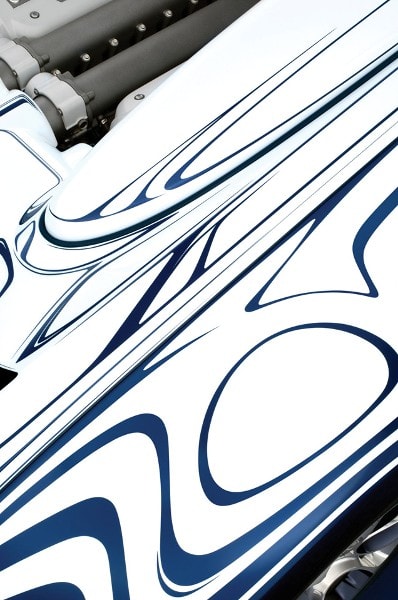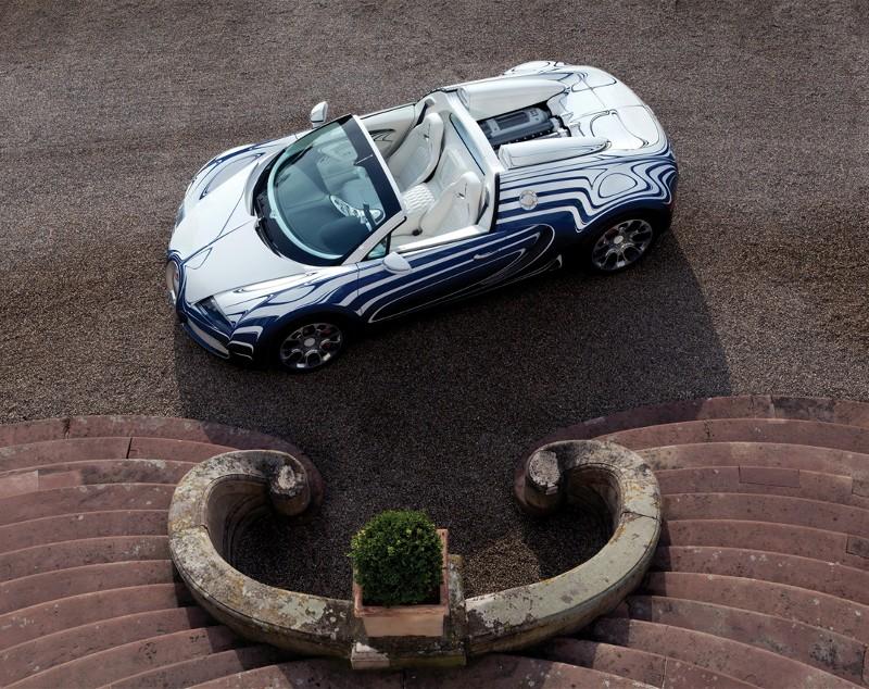 “Les designers de Bugatti”… m’a ensuite expliqué Achim Anscheidt…, “ont dessiné chaque ligne sur la carrosserie pré-peinte en blanc éblouissant avec du ruban adhésif de précision en papier de soie japonais, qui adhère non seulement très bien sur la plastiline contenant du soufre mais peut également être déchiré à la main. Des rubans adhésifs, dont la longueur peut atteindre cinq mètres, ont ainsi été lignés avec la tension requise sur toute la surface du véhicule. Lorsque les designers n’étaient pas satisfaits à 100 %, ils plaçaient des rubans de correction sur la ligne d‘origine, jusqu’à ce que celle-ci présente la tension requise et le caractère souhaité. C‘était la seule façon permettant de guider avec précision les lignes. Il ne faut pas oublier qu‘une précision maximale était requise. Au final, les lignes ont été tendues comme un réseau de reflets lumineux sur la caisse de la Bugatti. L‘équipe de designers a travaillé au total plusieurs semaines sur les courbes élancées et les lignes filigranes, qui courent sur ce chef-d‘oeuvre automobile comme les virages menant au col du Stelvio… Nous donnons avec L’Or Blanc, un aperçu des arts artisanaux des deux marques, dévoilant une parenté de lignes imputable à la fois au dessin artistique de la porcelaine et au processus de mathématisation automobile. Lors de l‘étape suivante, les spécialistes de la peinture de Bugatti ont pris possession du véhicule préparé avec le ruban adhésif. Au cours d‘un processus prenant environ trois semaines, le dessin des lignes apposées a été remplacé, millimètre par millimètre, à la main par une peinture d‘un bleu soutenu et l‘ensemble du véhicule a été doté de cinq couches de vernis. Comme l‘équipe de design avait apposé des rubans de largeurs différentes sur la carrosserie, un dessin chatoyant aux courbes variées est apparu. Tandis que, dans la partie inférieure de la décapotable, les lignes bleues ont pris le pas sur les espaces blancs, le rapport s‘est inversé au fur et à mesure que l‘on approchait du toit. Là, c‘est le blanc à l‘éclat intense qui devait dominer. Douze éléments en porcelaine d‘une finesse extrême, réalisés par la manufacture berlinoise, ont finalement parachevé le caractère artistique de cette édition spéciale de la Grand Sport” …