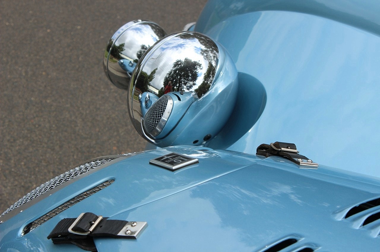 La suspension avant à double bras triangulés en acier, est entièrement réglable… et l’essieu arrière est maintenu à l’aide de 4 bras oscillants et des barres Panhard…, toutes les pièces d’accastillage, phares et écussons, sont en aluminium poli, faisant écho au thème d’une grande routière pour promenades du dimanche !