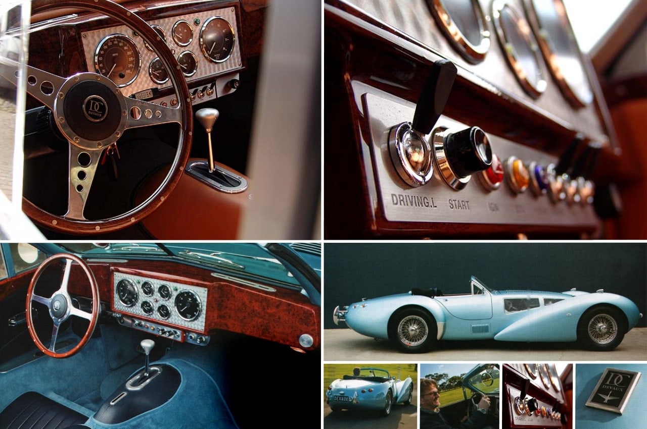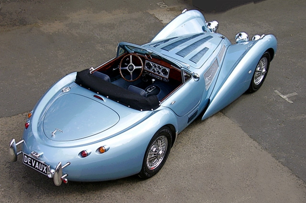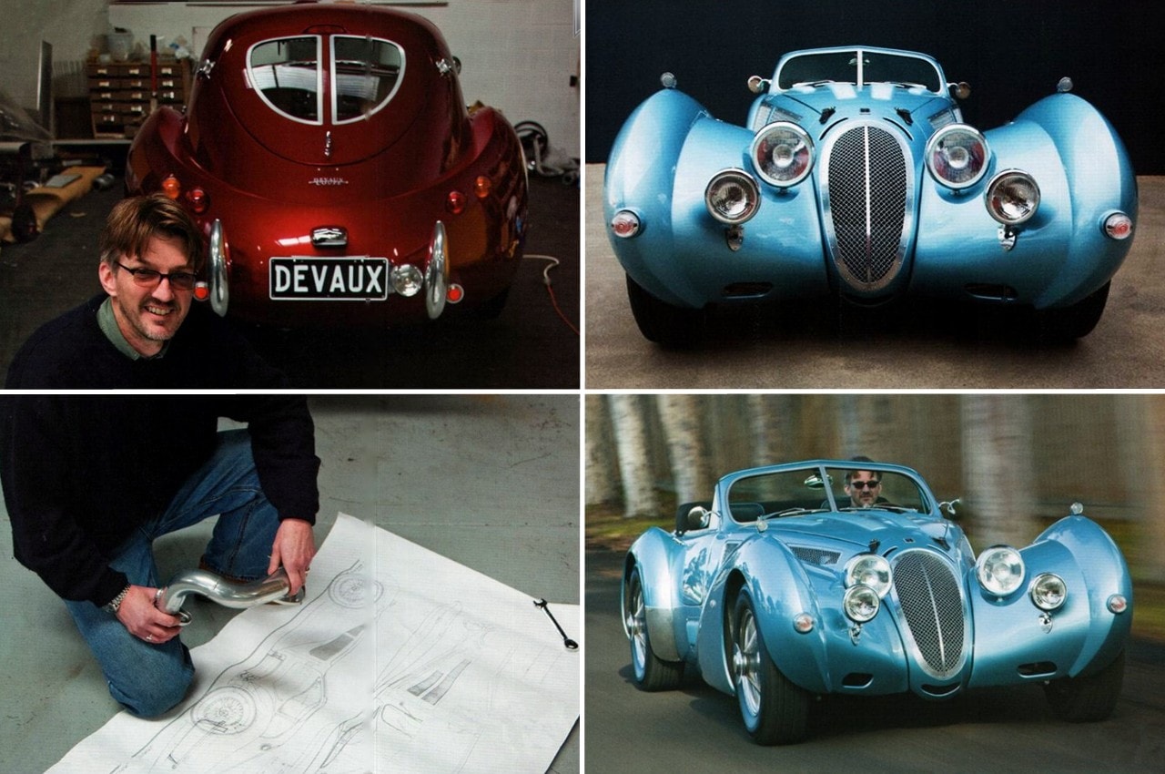 Pour la DeVaux Numéro un, prototype de son devenir…, il récupère un châssis de Riley 2.5 raccourci, re-motorisé par un 6 cylindres 3L4 Jaguar de 1956, équipé d’une boîte Moss…, ensuite, avec sa future épouse Lynn, il édifie une carrosserie en platre à taille réelle, à partir de laquelle il fabrique des moulages pour les panneaux de carrosserie en fibres de verre.