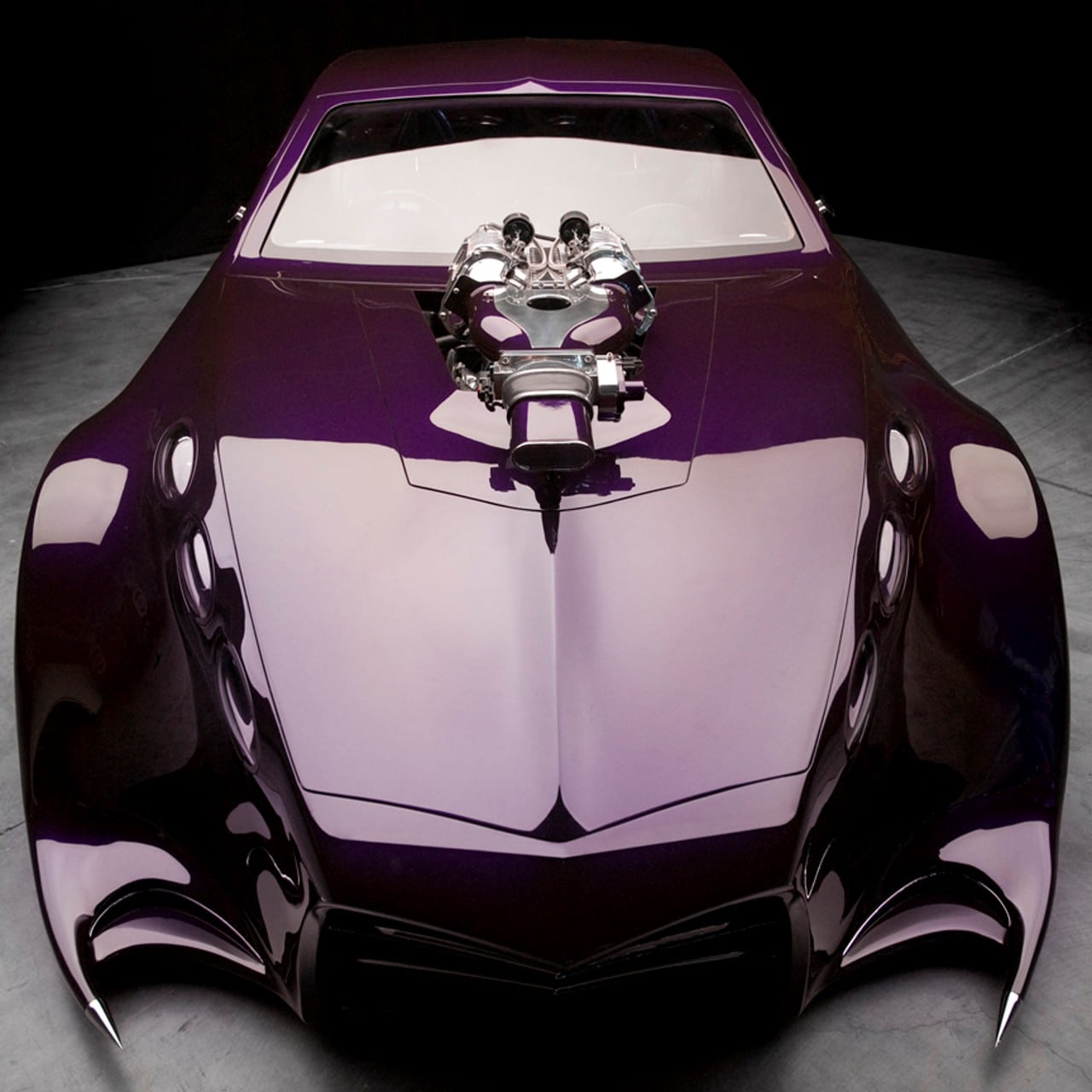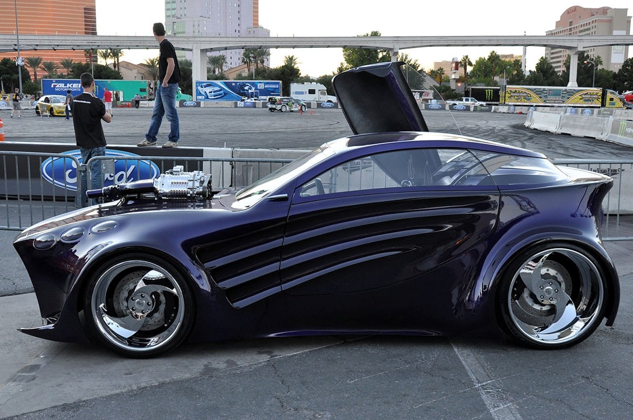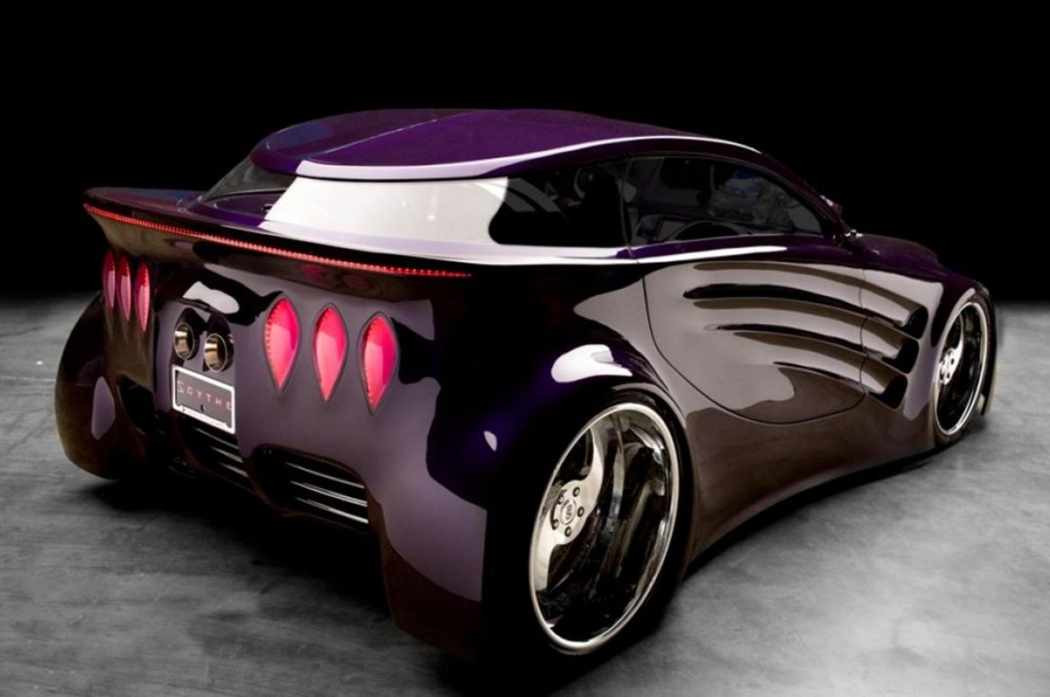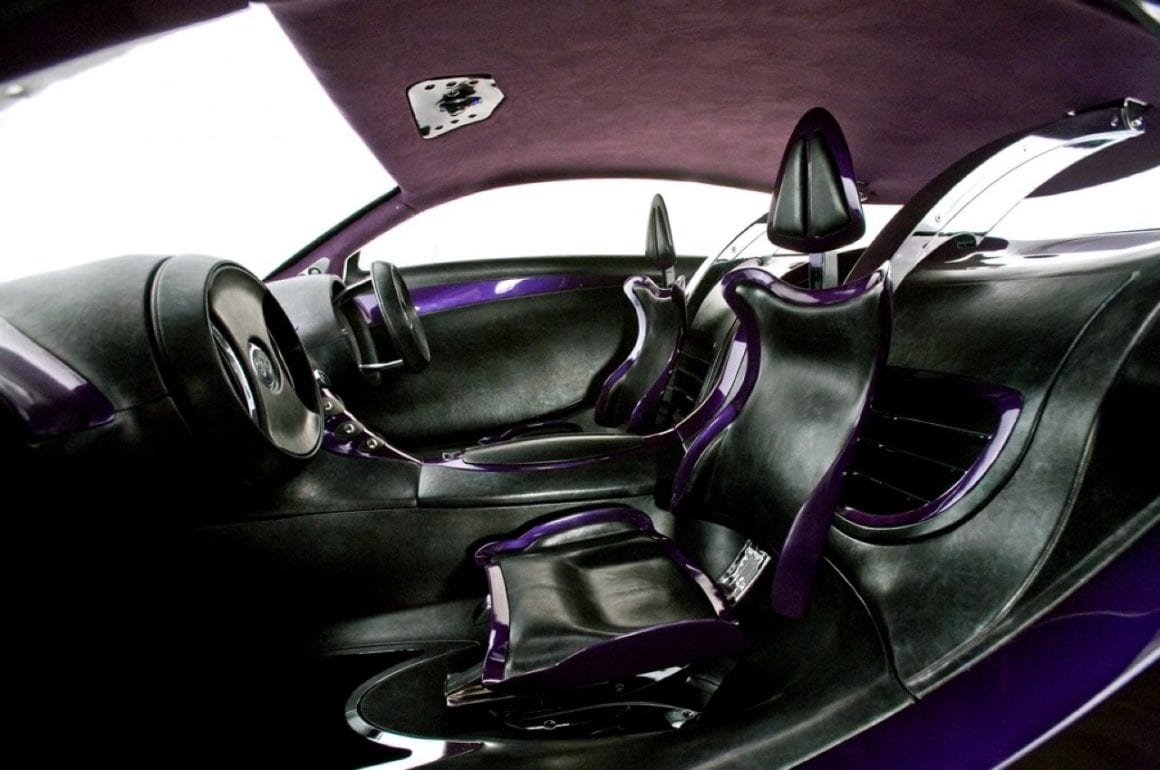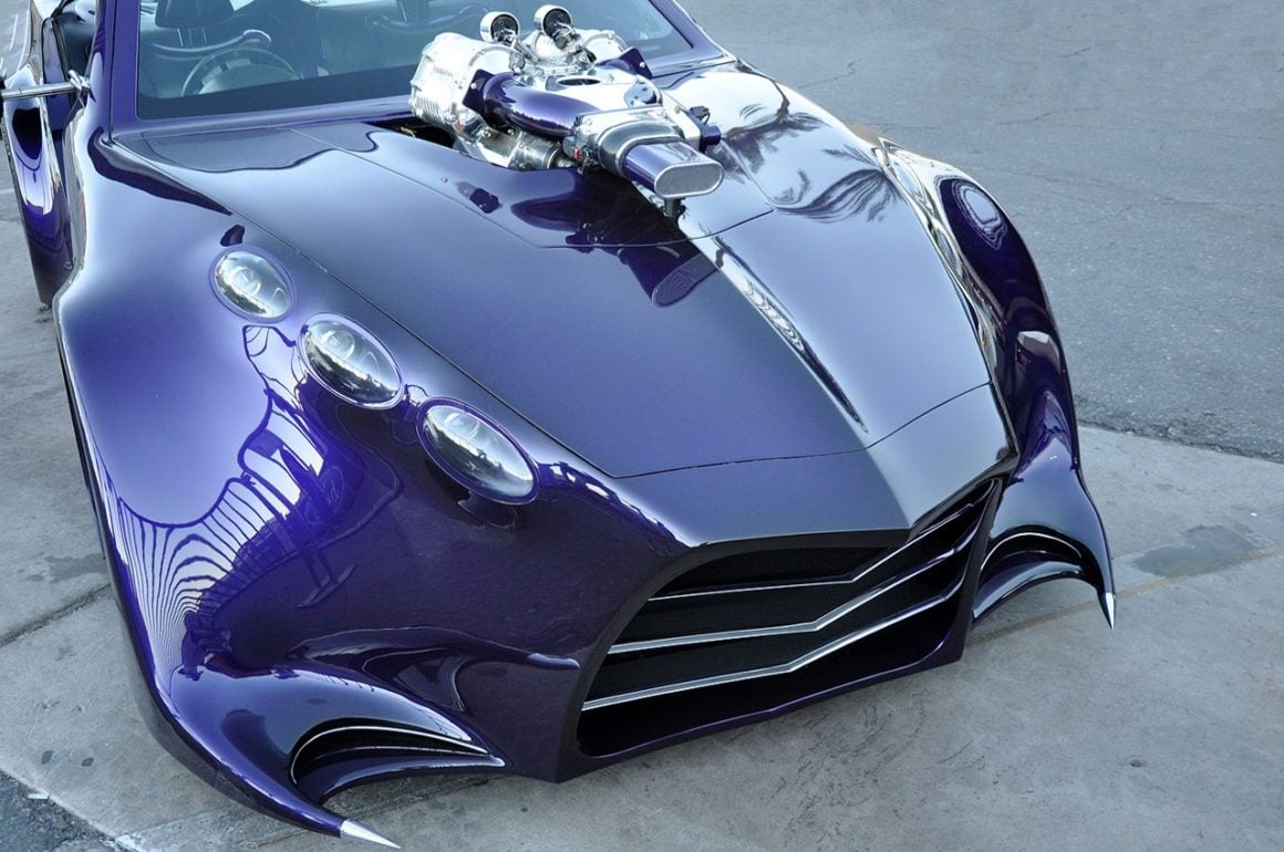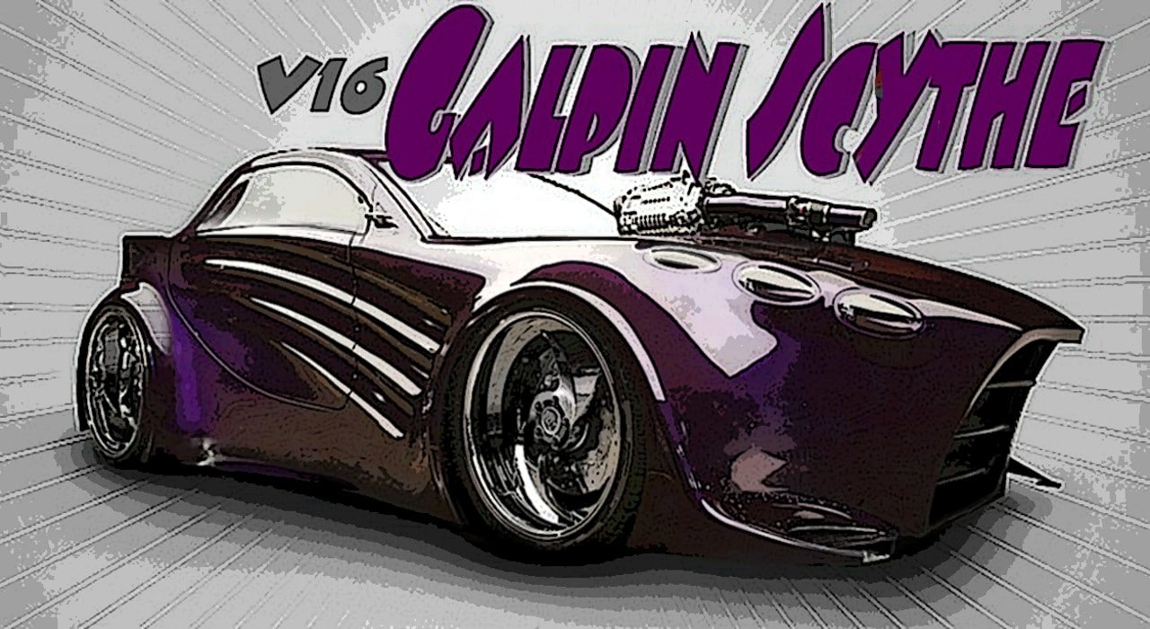 – Nous sommes l’équipe du garage Galpin qui a créé et réalisé cette Scythe V16…, nous avons démonté complètement une Mustang GT décapotable de 2008 pour n’en conserver que le châssis et les trains roulant modifiés avec l’apport d’un système de suspension Air Ride et de freins Wilwood de 16″5. Le moteur est l’assemblage de deux moteurs V8 5.0L suralimentés utilisant du méthanol, générant une puissance légèrement supérieure à 1000 chevaux. Une carrosserie en fibre de verre a ensuite été façonnée… Le maître d’œuvre de cette folie sur roues, est notre BIG-BOSS, Beau Boeckmann du garage Galpin Motors en Californie; il a délibérément créé les lignes de cette Scythe de manière à ce que la voiture terminée soit très controversée !