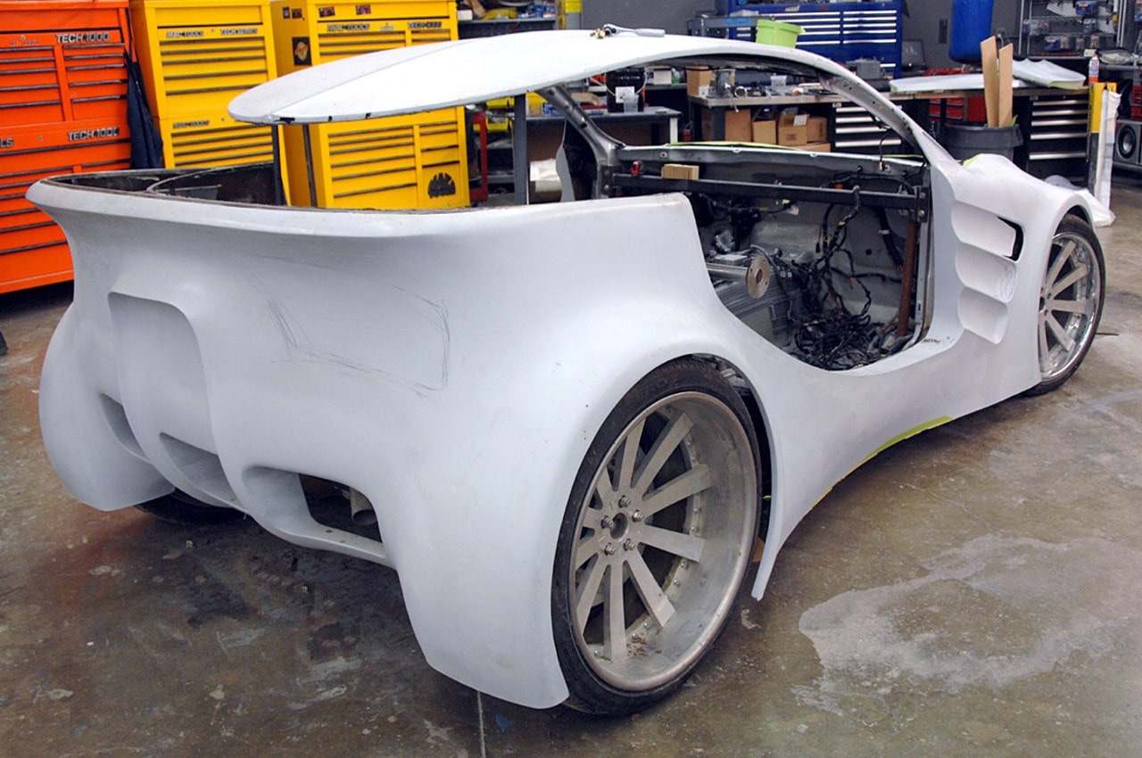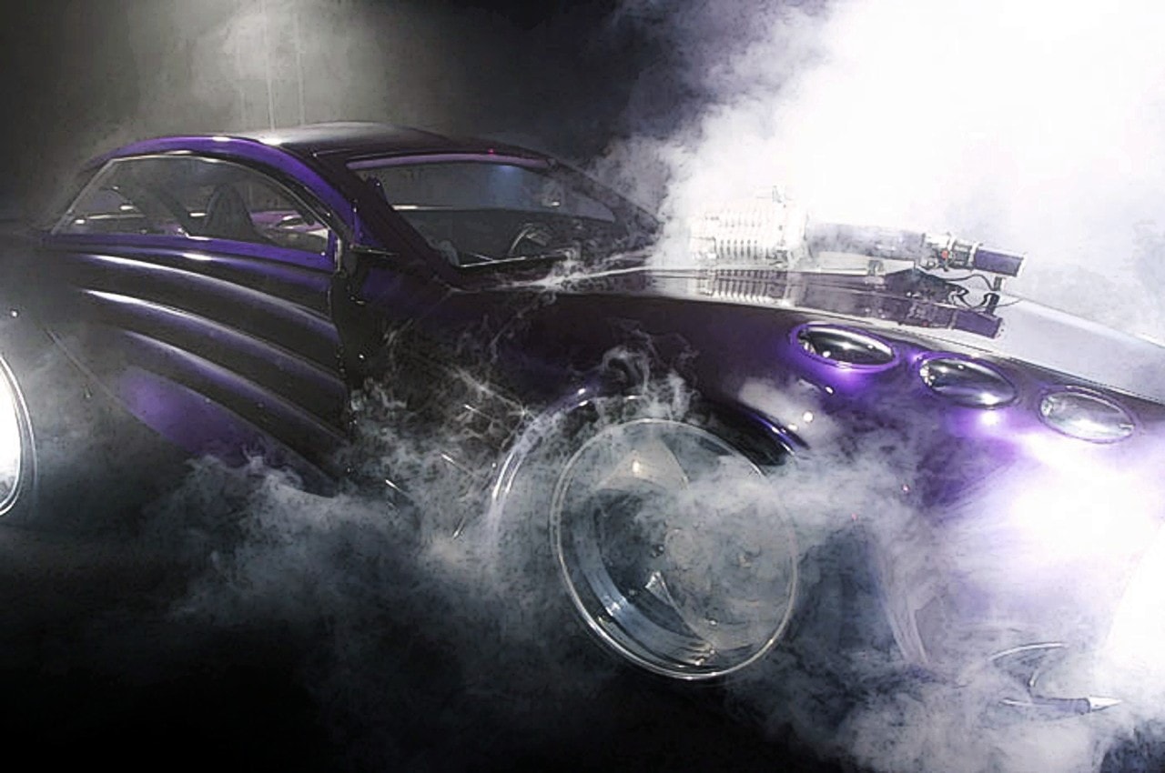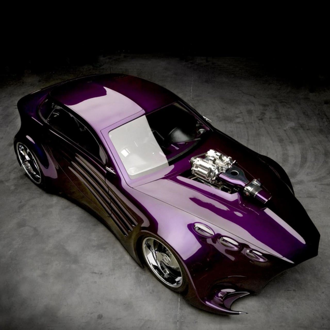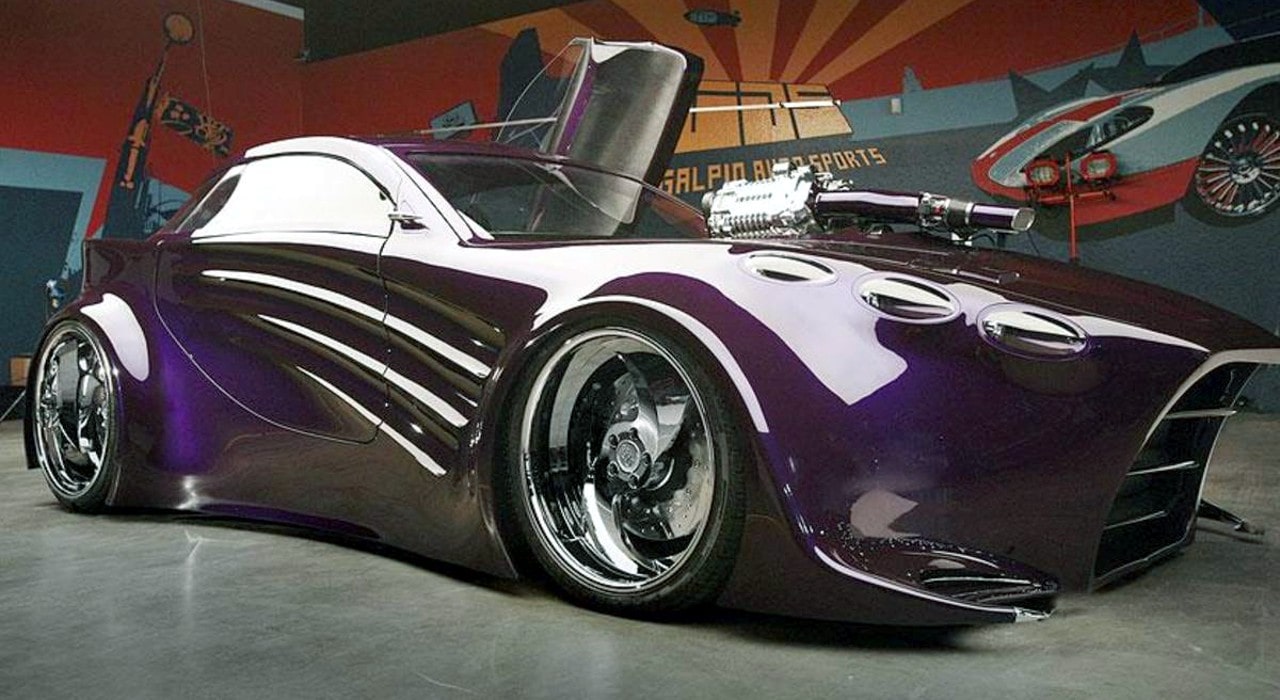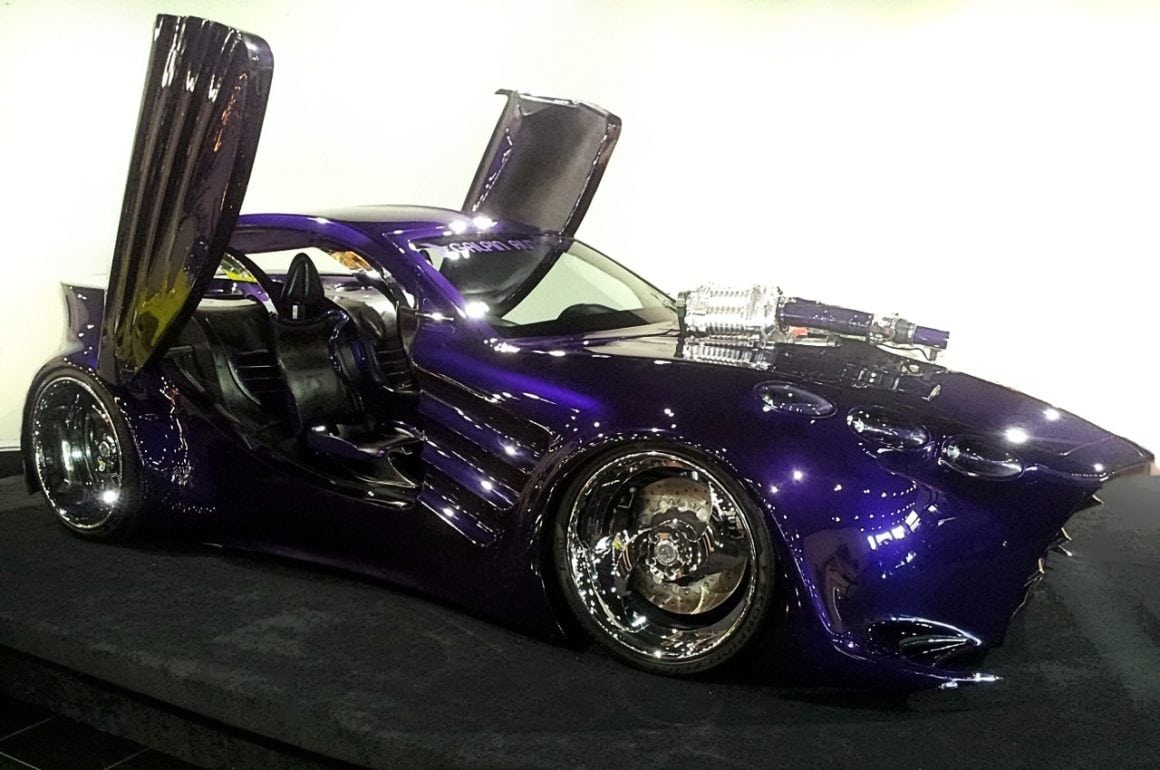 – Nous sommes l’équipe du garage Galpin qui a créé et réalisé cette Scythe V16…, nous avons démonté complètement une Mustang GT décapotable de 2008 pour n’en conserver que le châssis et les trains roulant modifiés avec l’apport d’un système de suspension Air Ride et de freins Wilwood de 16″5. Le moteur est l’assemblage de deux moteurs V8 5.0L suralimentés utilisant du méthanol, générant une puissance légèrement supérieure à 1000 chevaux. Une carrosserie en fibre de verre a ensuite été façonnée… Le maître d’œuvre de cette folie sur roues, est notre BIG-BOSS, Beau Boeckmann du garage Galpin Motors en Californie; il a délibérément créé les lignes de cette Scythe de manière à ce que la voiture terminée soit très controversée !