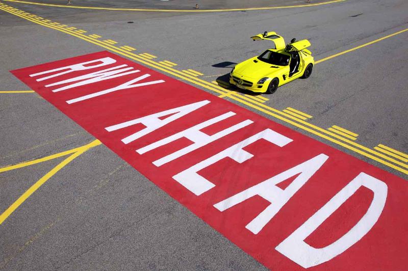 Cette SLS AMG E-Cell arbore une livrée d’un jaune brillant, baptisé AMG Lumilectric magno (sic !) et se contente de modifications esthétiques limitées.