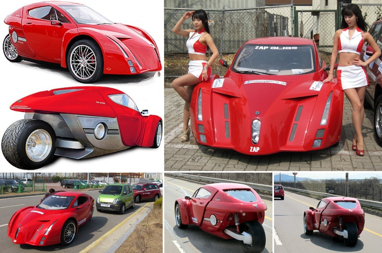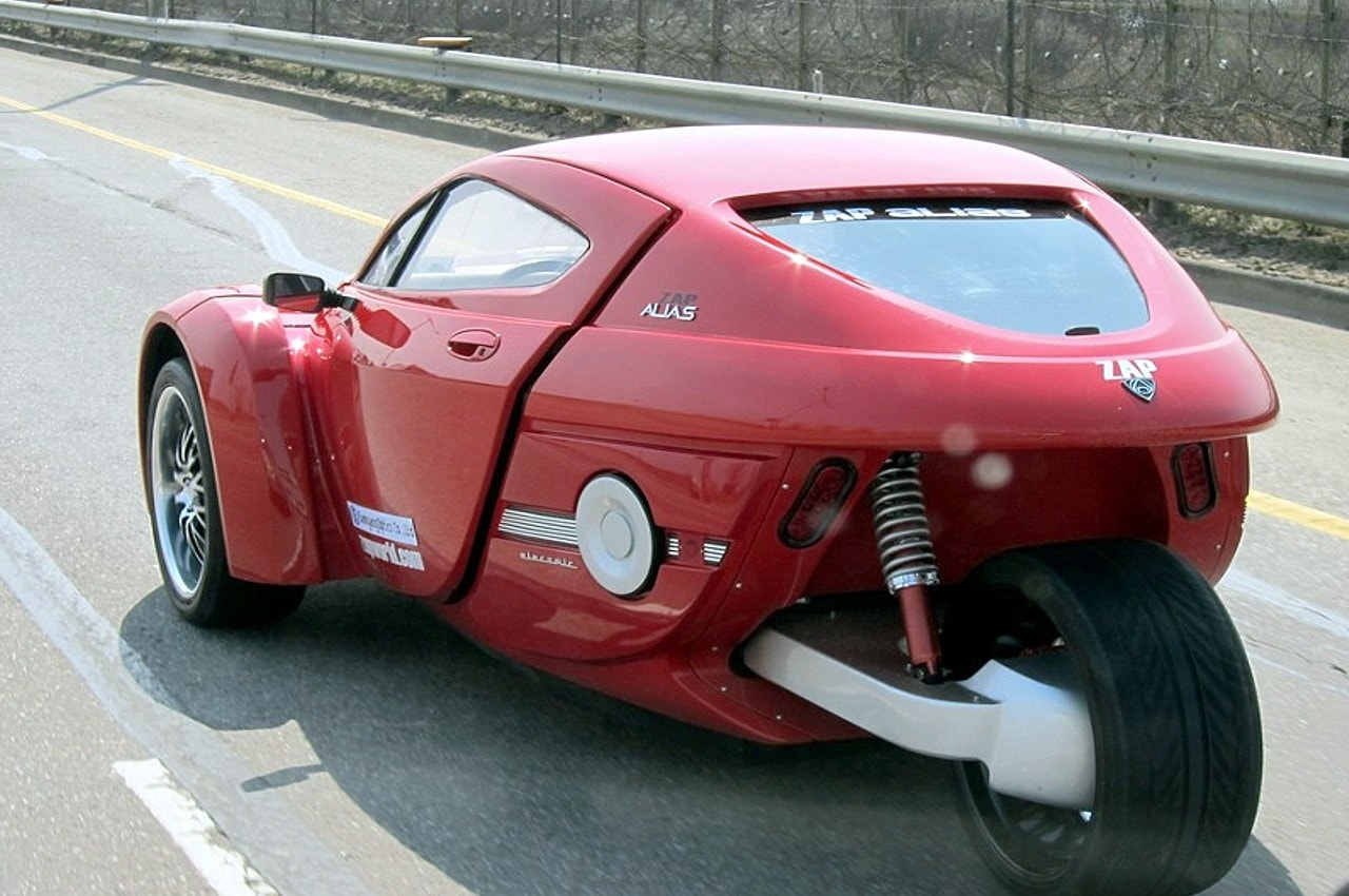 La ZAP Alias est en effet un engin étrange et insolite tant au niveau technique qu’au niveau de son design…. et, croyez-moi ou non, tout ce que cette folie à de sportif, c’est la quatrième roue manquante… et ce n’est pas rien…, car c’est une traction avant à 3 roues (2 à l’avant et 1 à l’arrière), un mélange d’auto et de moto…, un peu comme la Bombardier Can-Am Spyder, mais avec une cabine fermée par des portes qui ne se ferment jamais parfaitement (preuve en est, via les photos et vidéos qui illustrent cet article)…