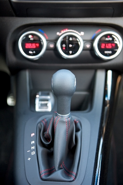 Avec cette boîte TCT, on note bien évidemment la présence d’un levier de sélection au plancher d’un genre un peu particulier, comportant deux grilles de sélection, automatique et séquentielle, ainsi que la présence de petites palettes solidaires du volant.