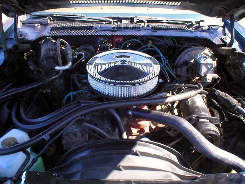 Un V8 bien de circonstance, un véritable moteur de camion avec arbre à cames central commandant d’immenses tiges de culbuteurs, surmonté par un énorme filtre à air du type soucoupe volante, alimenté par un carburateur quadruple corps.