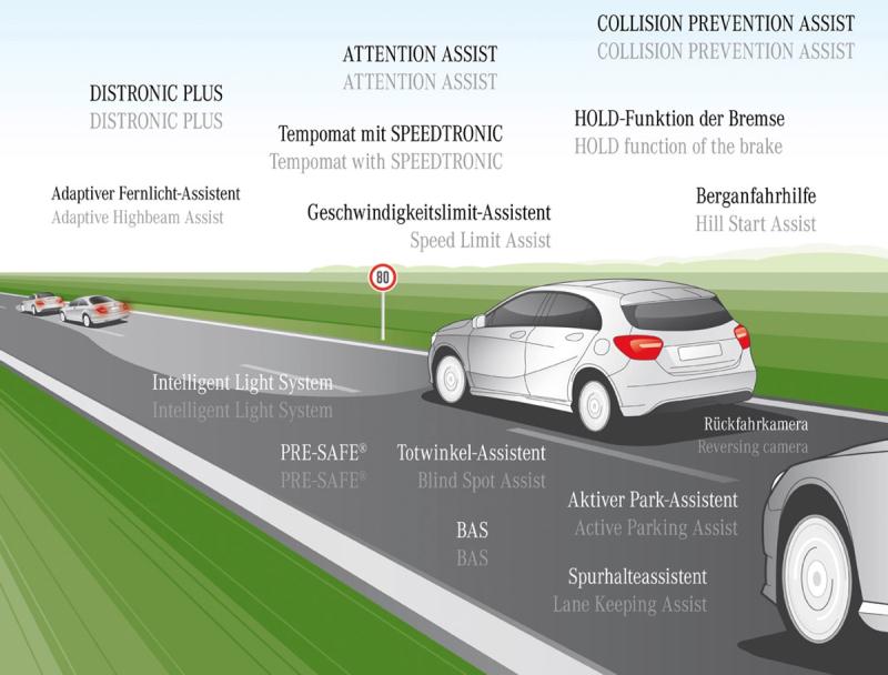 Avec quatre roues indépendantes, un châssis ayant fait ses preuves sur la dernière “classe B” ainsi que de nombreuses aides à la conduite, ABS, ESP sans oublier de série “l’Attention Assist” qui veille à vous garder éveillé…, ainsi que le “Collision Prevention Assist” (créant une alerte auditive et visuelle en cas de risque de collision)…, le conducteur est surprotégé…, quoiqu’il doive toujours freiner lui-même !