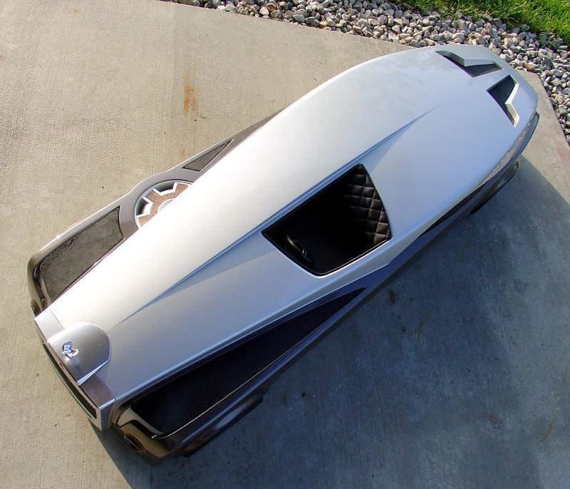 Jeremy Westerlund (c’est lui), a ici mélangé des éléments classiques et futuriste, avec des jantes de roues en acajou… la forme “Torpédo” de l’egin diaboliquement explosif, placant le chauffeur à l’air libre, comme dans les voitures de course vintage (Jaguar Type D, Mercedes SLR), ou comme sur une torpille kamikaze…, tandis que la place alors dévolue aux explosifs ne manque pas pour des passagers recroquevillés sur eux-mêmes… ou placés volontairement dans des positions scabreuses et sexuelles…