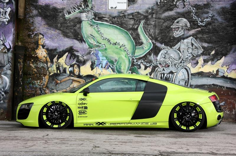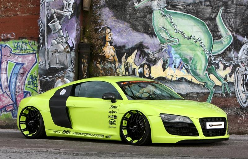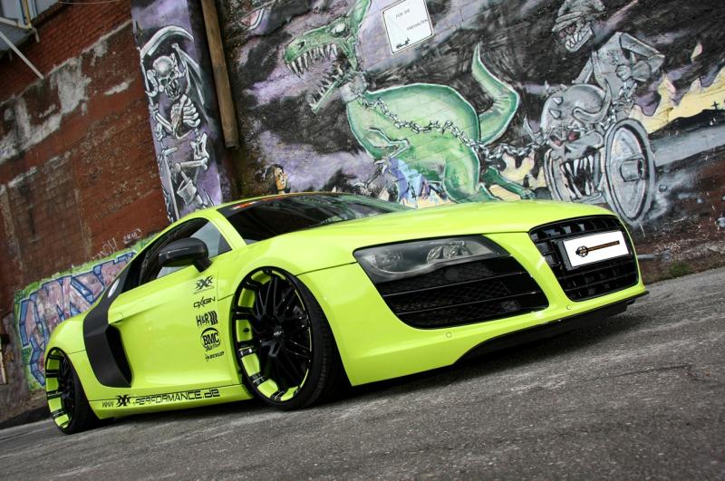 Saugrenue avant tout, l’Audi R8 V10 modifiée/tunée par XXX-performance reste à part dans le monde, puisqu’il s’agit également de la seule proposition futuristico-hippie de cette société…, à ce jour. Présentée comme une contre-utopie dérisoire et chaleureuse, elle aurait pu prétendre à symboliser la science-fiction automobile : une farce grossière de mauvais goût qui tombe résolument à plat, embarrassée d’une esthétique tout à fait tarte et d’effets visuels surannés. Comme il n’y a rien de plus ridicule qu’une automobile débilitante qui ne fait pas rire, il va sans dire qu’il n’y a rien de plus ringard qu’une voiture tunée… et sa couleur pomme confirme cette terrible vérité : elle se regarde, l’air ahuri…, dans la plus constante des indifférences. En effet, dans l’opinion publique, l’image des voitures modifiées est de plus en plus négative, les gens sachant de plus en plus que les prétendus outils technologiques des tuners basiques ne sont que des sottises qui, dans leur idée… leur permettraient de vainement sortir du lot des voitures avec des balais-brosses en guise d’amortisseurs… et des freins automatiques électroniques robotisés. Au solde de cet essai, j’ai pensé à Jacques Tati pour le design fait d’abstractions géométriques…