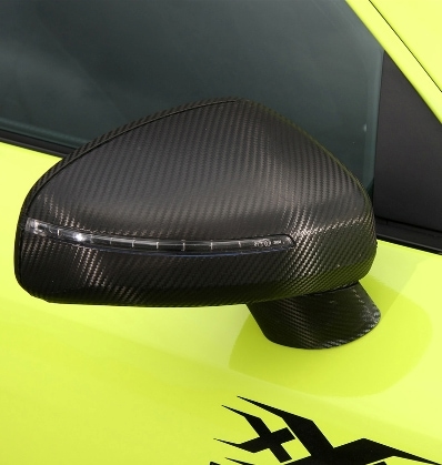 Les lames latérales et les rétroviseurs extérieurs ont été affinés et réalisés en feuille de carbone pour créer un contraste avec le vert bilieux de la carrosserie.