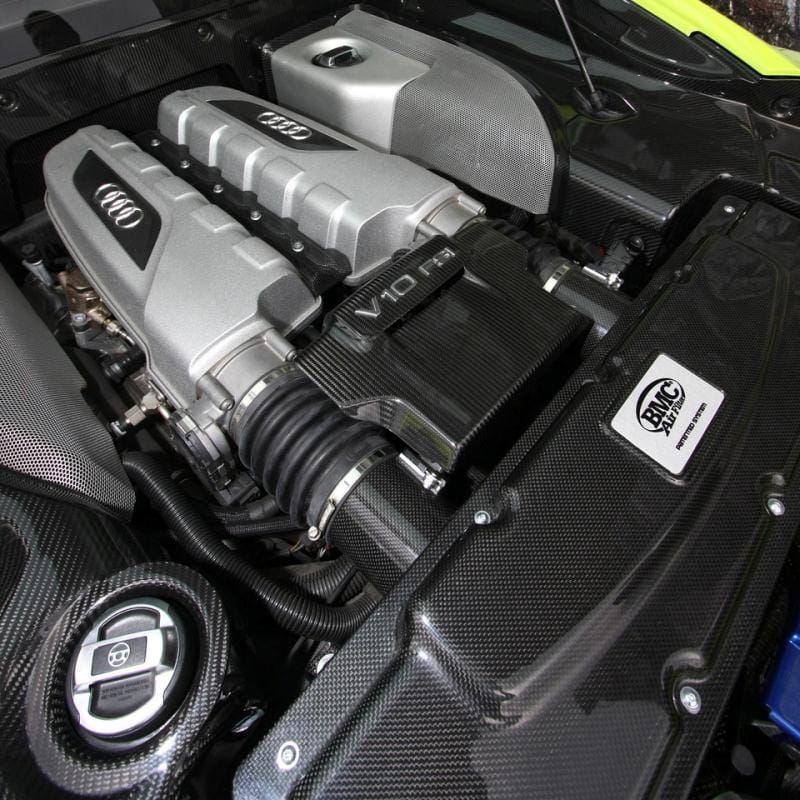 A bas régimes, le V10 martèle un peu à la manière d’un V8, mais surtout il grogne comme les dernières générations de Flat Six Porsche. Une sonorité atypique sans doute due à l’injection directe. Souple et disponible à bas régimes, ce bloc reprend de manière plus tonique que le V8, mais sa puissance, impressionnante dans l’absolu, déçoit de la part d’une telle mécanique. Une franche pression sur l’accélérateur suffit toutefois pour se rassurer sur le potentiel de la bête fauve ! Le V10 s’éclaircit alors la voix en émettant un cri rauque caractéristique, puis donne un premier coup de collier vers 3.500 tr/min. L’ascension du compte-tours se poursuit avec une poussée vigoureuse jusqu’à 6.000 tr/min. Au dessus de ce régime, il en rajoute une couche : les dix pistons deviennent alors hystériques, se déchaînent dans un concerto bien plus aigu et vous plaquent littéralement contre les sièges. Avec un seul but en tête : aller chercher la coupure d’injection fixée à 8.700 tr/min !