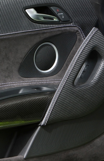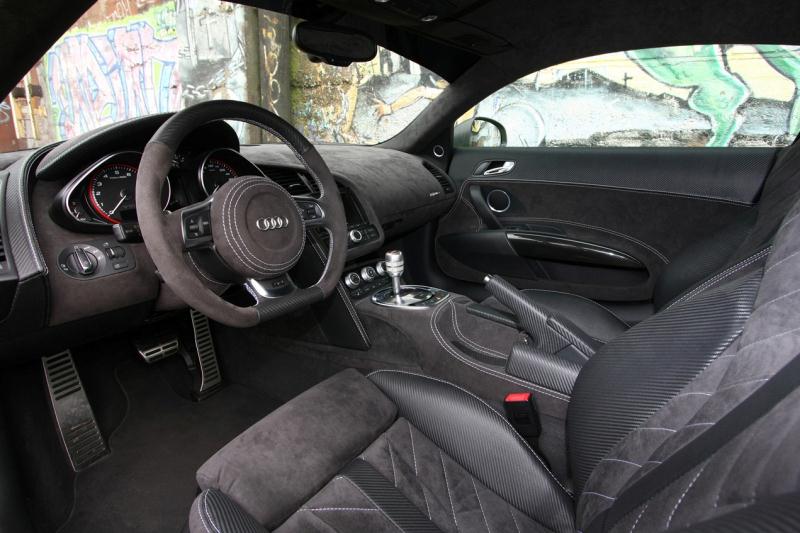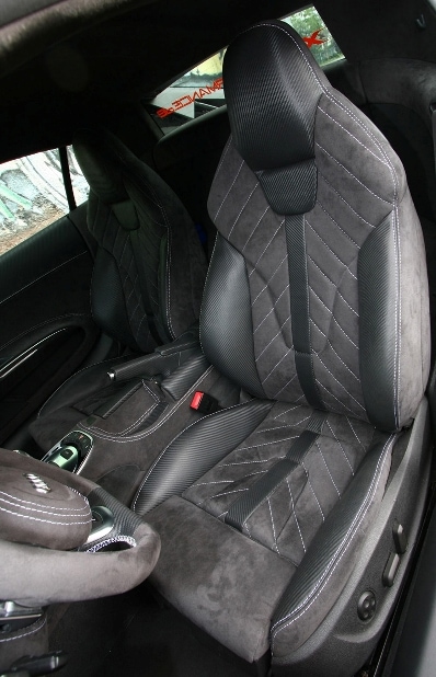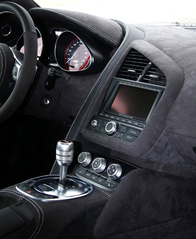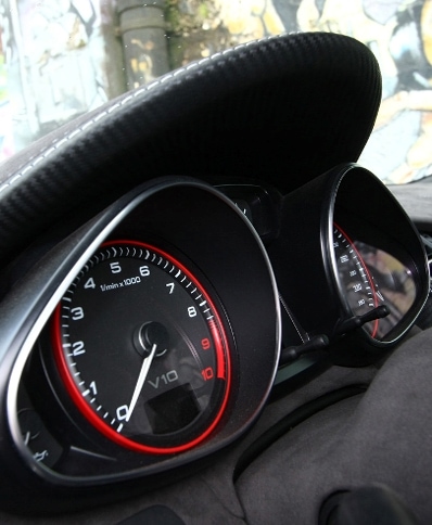 L’entreprise de Bochum a en outre réalisé un nouvel intérieur pour la R8 V10, en Alcantara et en cuir avec coutures blanches. Un petit coup de première avec un tintement bien connu des “Ferraristes” grâce à la grille de sélection en aluminium… et la R8 V10 s’élance en souplesse. Hormis une largeur imposante en ville, cette GT se caractérise par une étonnante douceur de conduite : embrayage doux à la course un peu longue, direction légère à basse vitesse et suspension étonnement conciliante. Certaines familiales sont moins confortables…