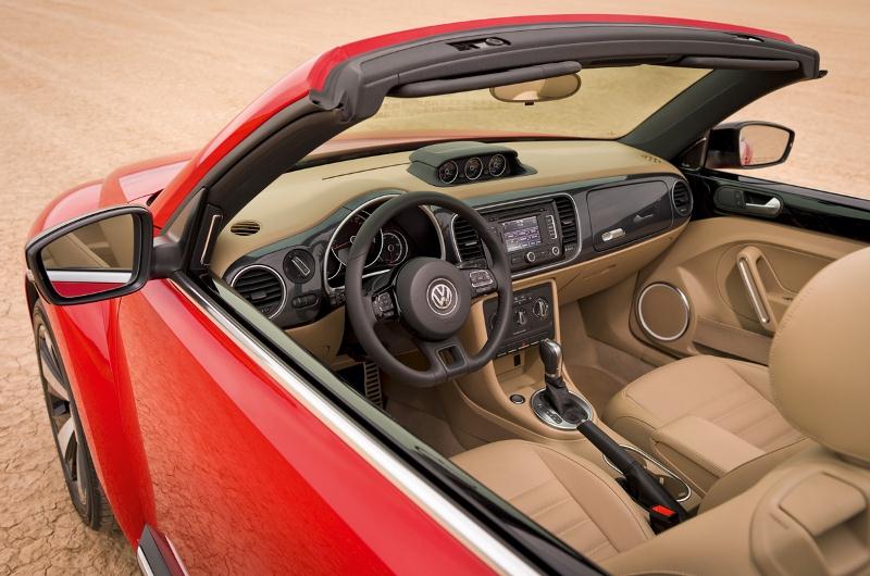A l’intérieur, la nouvelle Beetle cabriolet conserve les éléments de design qui ont eu un franc succès auprès des consommateurs de la série précédente, tels que le tableau de bord de même couleur que la carrosserie et les instruments désuets de style et de finition, ici ravigorés d’étincelles…