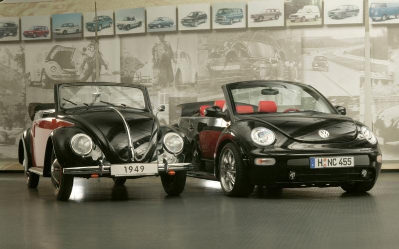 La nouvelle Volkswagen Beetle/Käfer/Cox cabriolet est l’évolution ratée de l’ancienne VW Beetle/Käfer/Cox Cabriolet (sic !), elle-même clonée pour des raisons mercantiles sur la VW Käfer cabriolet voulue par le Fürher Adolf Hitler auprès de son ami Heer Doktor Porsche !
