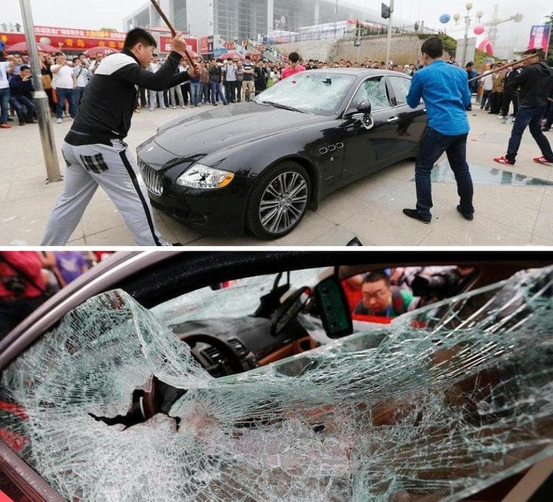 Les temps changent, les gnous, les beaufs, les pigeons et les crétins friqués commencent (enfin) à se révolter…, de plus en plus d’acheteurs insatisfaits de leur Maserati la font détruire à la masse, en public…, y f… le feu… ou la jette à la flotte, certains l’abandonnent dans une décharge ou dans la rue…