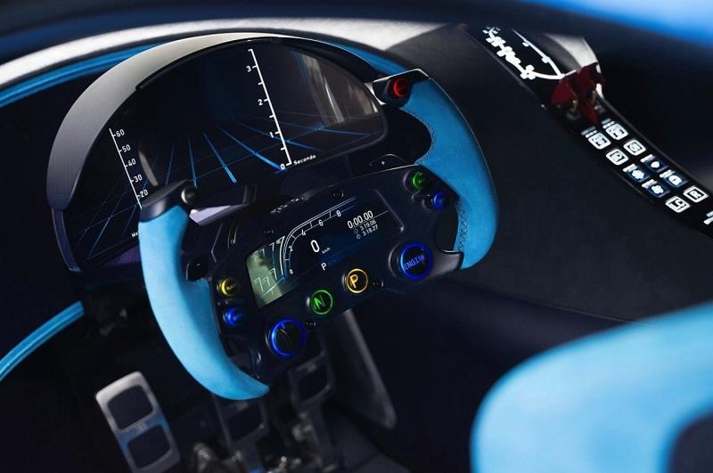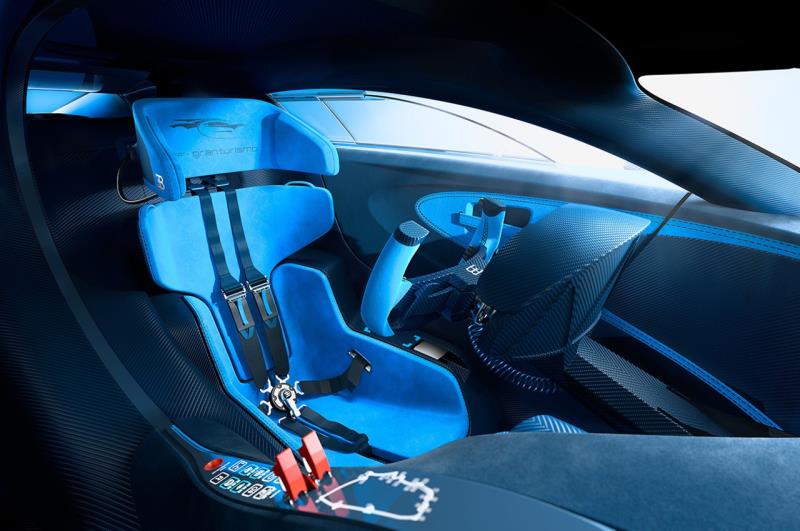 “La conception de l’habitacle du véhicule n’a pas été davantage fait dans la demi-mesure que le design extérieur. C’est une voiture sans compromis. Ce véhicule demeure une authentique Bugatti. L’architecture de l’habitacle est dans la continuité du tracé clair des lignes extérieures. L’aileron central qui orne de manière si marquante le pavillon apparaît ainsi également dans l’habitacle, où il démarque le compartiment conducteur du reste de l’habitacle et se prolonge dans la console centrale au niveau de sa partie inférieure. Le rendu bicolore de la robe extérieure constitue également le thème de l’intérieur. L’habitacle est conçu pour répondre aux exigences du sport automobile. Tous les cadrans, les afficheurs et les éléments de commande se situent à l’emplacement où un pilote de course s’attendrait à les trouver – bien visibles et accessibles en une fraction de seconde. Le conducteur dispose de deux afficheurs ; tous deux sont convexes pour offrir une meilleure lisibilité, conformément aux dernières avancées du design. Un afficheur est installé sur le volant et fournit toutes les informations relatives au véhicule. Le second afficheur se trouve sur la colonne de direction et présente l’image panoramique des trois caméras montées à l’extérieur du véhicule : le conducteur dispose d’une meilleure vue d’ensemble, e par conséquent de davantage de sécurité. Tous les indicateurs du cockpit sont rétroéclairés, de sorte que le conducteur peut avoir accès sans problème à toutes les informations dont il a besoin. Concernant les matériaux utilisés dans l’habitacle, Bugatti reste fidèle à ses valeurs. Authenticité et qualité sont les deux maîtres mots qui ont guidé le travail des designers. La Bugatti Vision Gran-Turismo est notamment parée de carbone, habituellement utilisé dans le sport automobile pour des raisons de poids. Il s’agit ici de carbone apparent bleu, en version brillante sur l’extérieur du véhicule. Dans l’habitacle, c’est en revanche la version matte qui est utilisée afin d’éviter les reflets gênants. Les designers de Bugatti ont également franchi un nouveau pas dans le traitement du cuir. Pour les pièces du cockpit qui doivent permettre une bonne prise et être résistantes, comme le volant, le tableau de bord et la tête du siège, ils ont utilisé un cuir velours particulièrement léger et résistant, qui n’était jusqu’à présent utilisé que pour les chaussures de course de Formule-1. La Bugatti Vision Gran-Turismo est le premier véhicule dans lequel ce type de cuir est intégré. Que ce soit dans le monde virtuel ou dans le monde réel, une Bugatti doit faire rayonner sans restriction, à tous points de vue, les valeurs de la marque. Le show car présenté à Francfort est de ce point de vue une parfaite transposition de l’idée virtuelle dans la réalité. Il a été réalisé avec l’amour du détail typique de Bugatti et la plus haute exigence de qualité quant aux matériaux et à leur traitement artisanal”…
