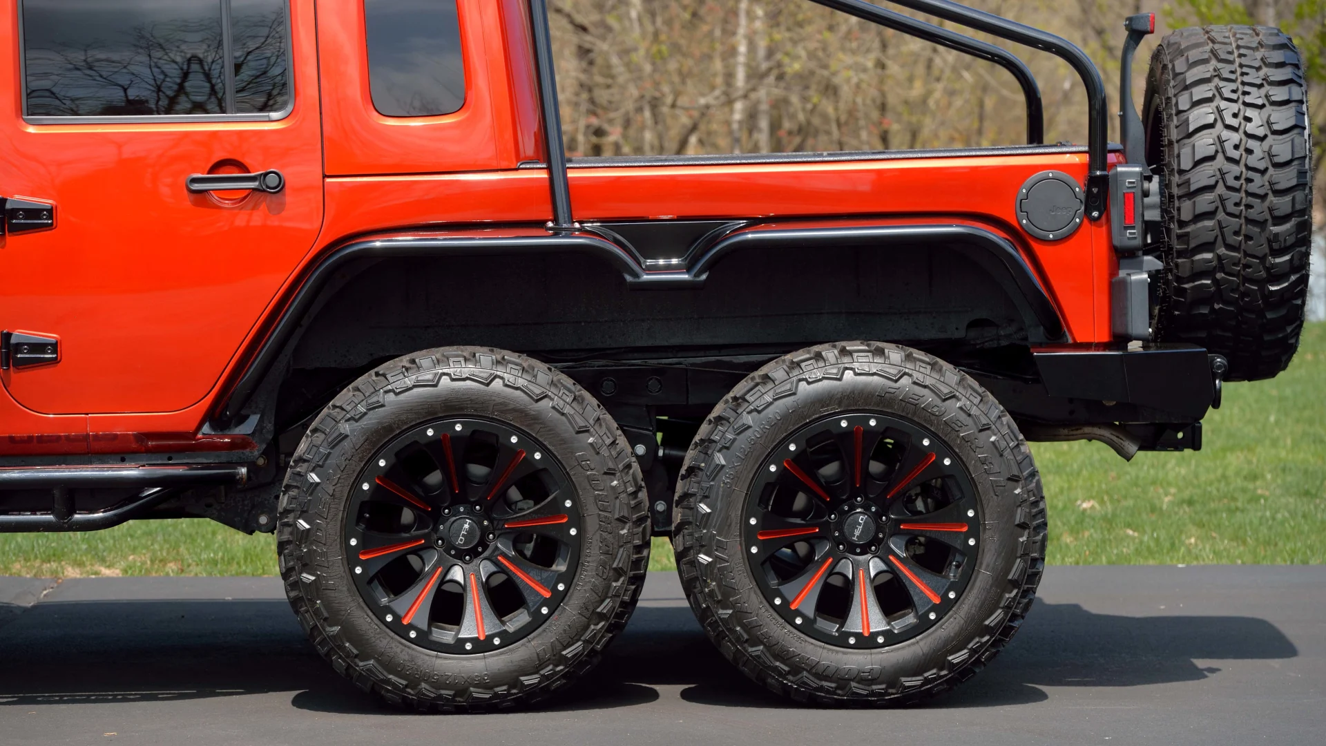 A ce stade, 47% de la puissance va à l’avant, les 53 autres % étant répartis également entre les quatre roues arrière. Avec 6.223 millimètres, ce 6X6 est non seulement nettement plus long qu’un Gladiator/Rubicon de base (5.537 mm), mais aussi que le Mercedes G63 AMG 6×6 (5.875 mm). Son empattement est trapu de 4,5 mètres tandis que son poids est également en hausse, passant de 2,1 tonnes pour le Gladiator/Rubicon à 2,5 tonnes.