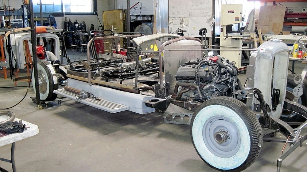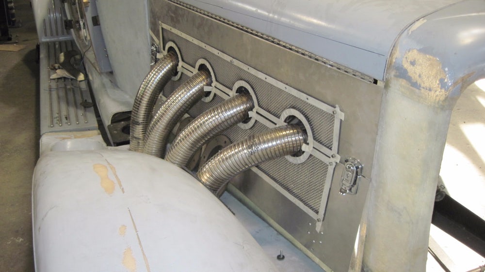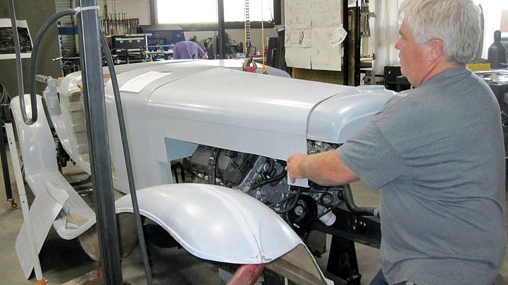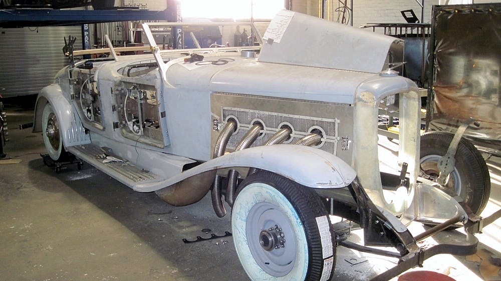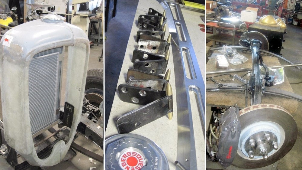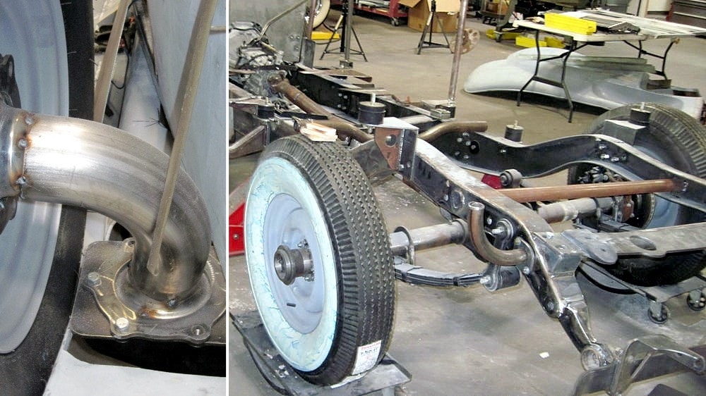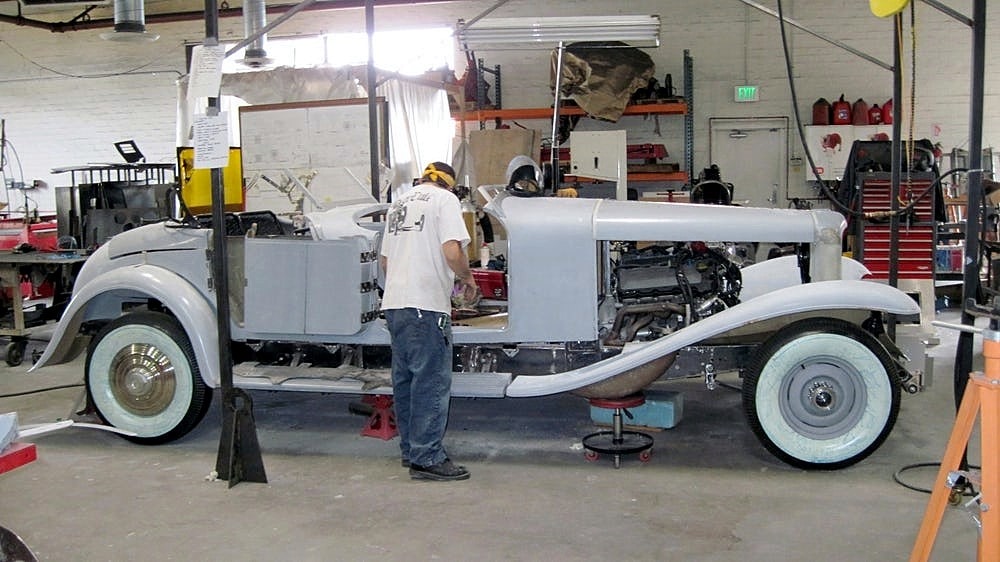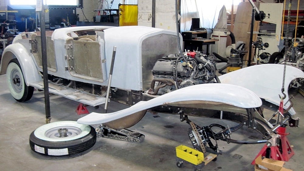 Dave Hartje a ensuite dit : “Jay Leno’s possède six “Duesenberg’s” là-bas dans son garage, il est un de mes amis. J’ai été là-bas, chez lui, dans son garage-musée et il m’a laissé mesurer les châssis de ses “Duesenberg’s” afin que j’obtienne toutes les dimensions dont j’avais besoin. Mais le Top convertible, restait un vrai défi, parce que personne n’a aucune information sur la façon dont ils l’ont construit. Ces voitures sont très rares, Jay n’en a même pas. Il a les hauts fixes. Ainsi, une grande partie de la nouvelle “Duesenberg II”, est due à l’ingéniosité de Paul, il est génial pour le détail et l’ingéniosité. Tout, du volant à l’ornementation de l’habitacle, chaque panneau, ainsi que les garde-boues, le tableau de bord, les pare-chocs incurvés, les side-pipes, les feux arrière qui s’allument et disent stop… même la signature “Duesenberg” a du être re-conçue et re-construite à partir de zéro. Les fenêtres de la vieille voiture, par exemple, étaient à manivelle…, la nouvelle “Duesenberg II” a des vitres électriques, et les manivelles pour vieilles mains se ressemblent, mais actionnent des interrupteurs électriques pour lever et abaisser les fenêtres. Il y a une chaîne stéréo cachée sous le tableau de bord, et la carrosserie est plus large afin que les passagers ne soient pas mal assis. La transmission est automatique”.