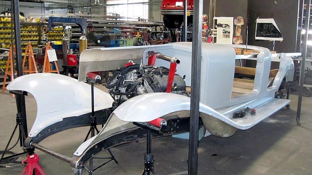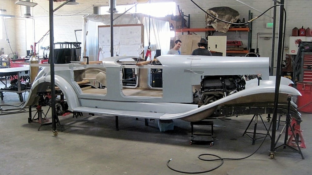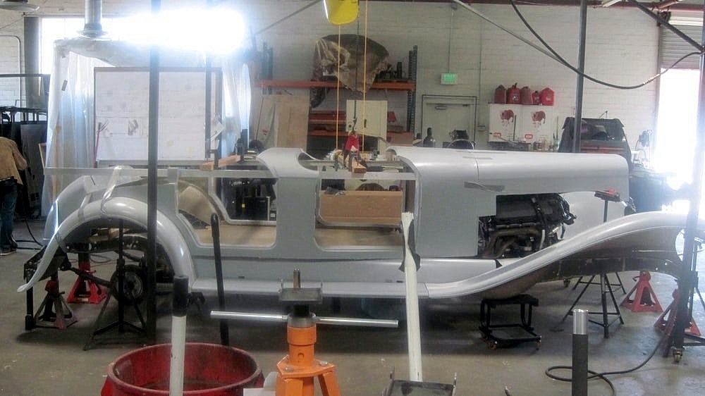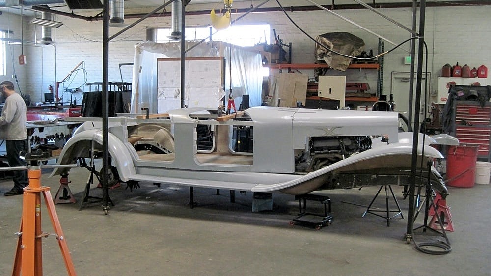 Eddie Paul m’a dit, alors que j’avais été invité à son domicile d’El Segundo, en Californie (une maison, qu’il a construit lui-même, bien sûr) : “Le projet “Duesenberg II Revival”, est totalement différent du précédent. Je suis vraiment impatient de vivre cela, c’est un projet avec lequel nous pouvons prendre notre temps et lui donner l’air parfait d’une entreprise honnête. Ce sera un changement agréable. La 2017 “Duesenberg Torpedo Phaeton” sera la première de la nouvelle ligne de production, toujours avec le style 1933. Un sommet unique. Je l’appelle “Project top six-Man”, parce qu’il a fallu six personnes pour construire la voiture. Le prototype précédent de la réplique “Duesenberg” était exact jusque dans le châssis. Nous avions utilisé un moteur Ford Mustang, mais on aurait pu mettre un moteur “Duesenberg” là-dedans qu’il serait bien adapté. Mais le nouveau design est construit sur un châssis de camion GM, le même utilisé pour les Chevrolet Tahoe et Silverado, en utilisant un 6,2-litres V8 LS3 Corvette de 430 chevaux et 424 ft-lbs de couple… c’est garanti par Chevrolet, et c’est fiable”…