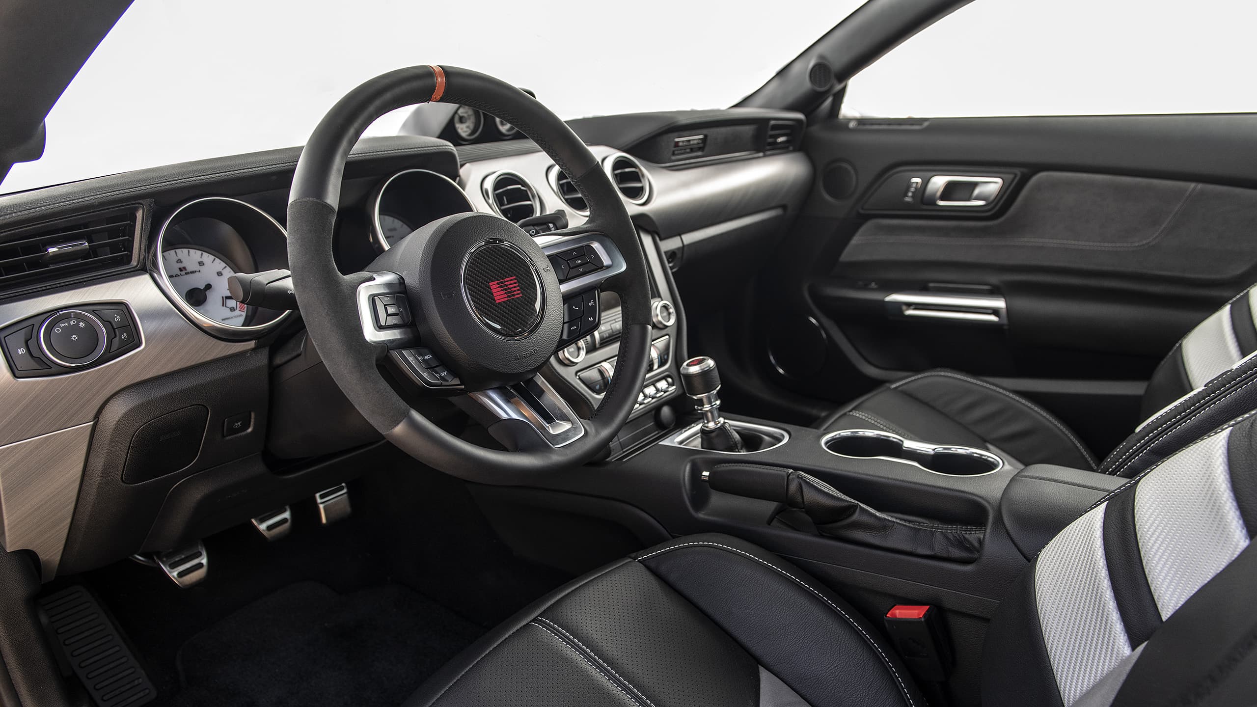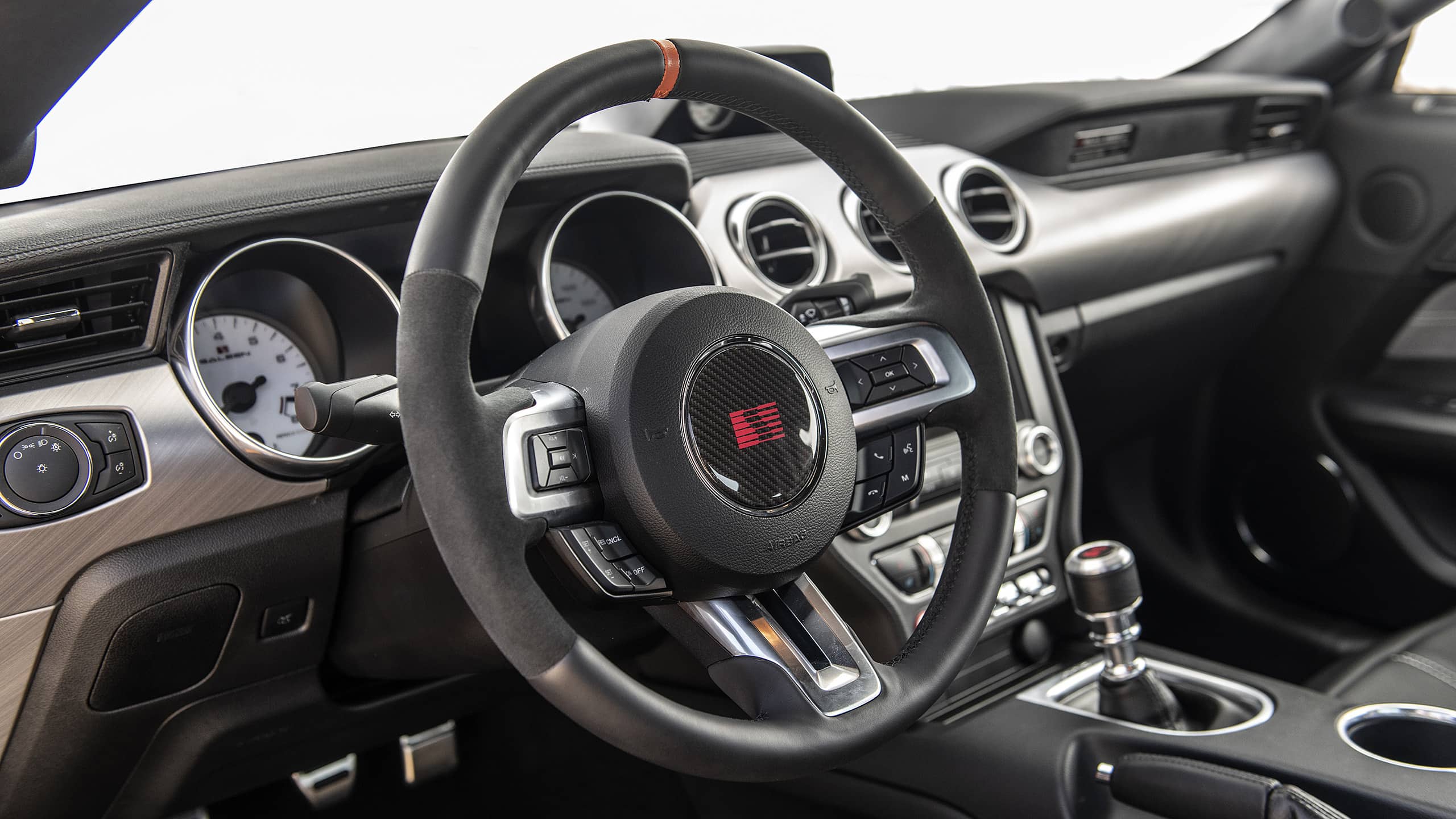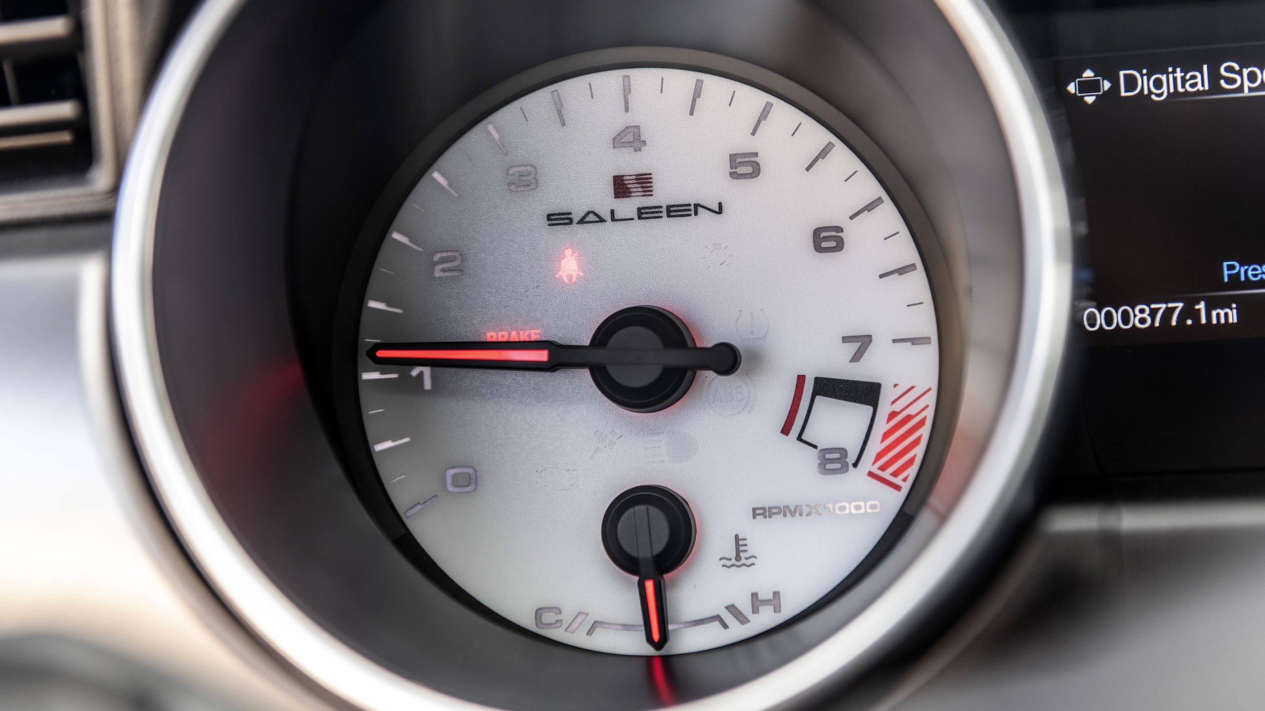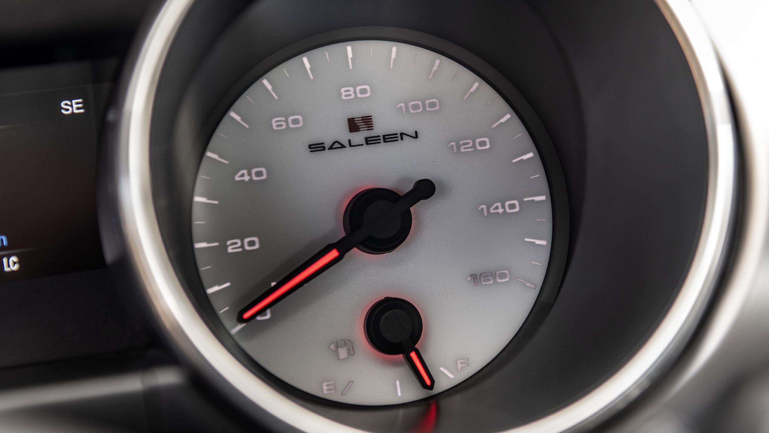 Saleen habille l’intérieur en ajoutant sa propre tapisserie en Alcantara, un volant Billet en cuir, des jauges auxiliaires…, mais pas de pression et de température d’huile comme la Shelby GT500, l’information est importante !