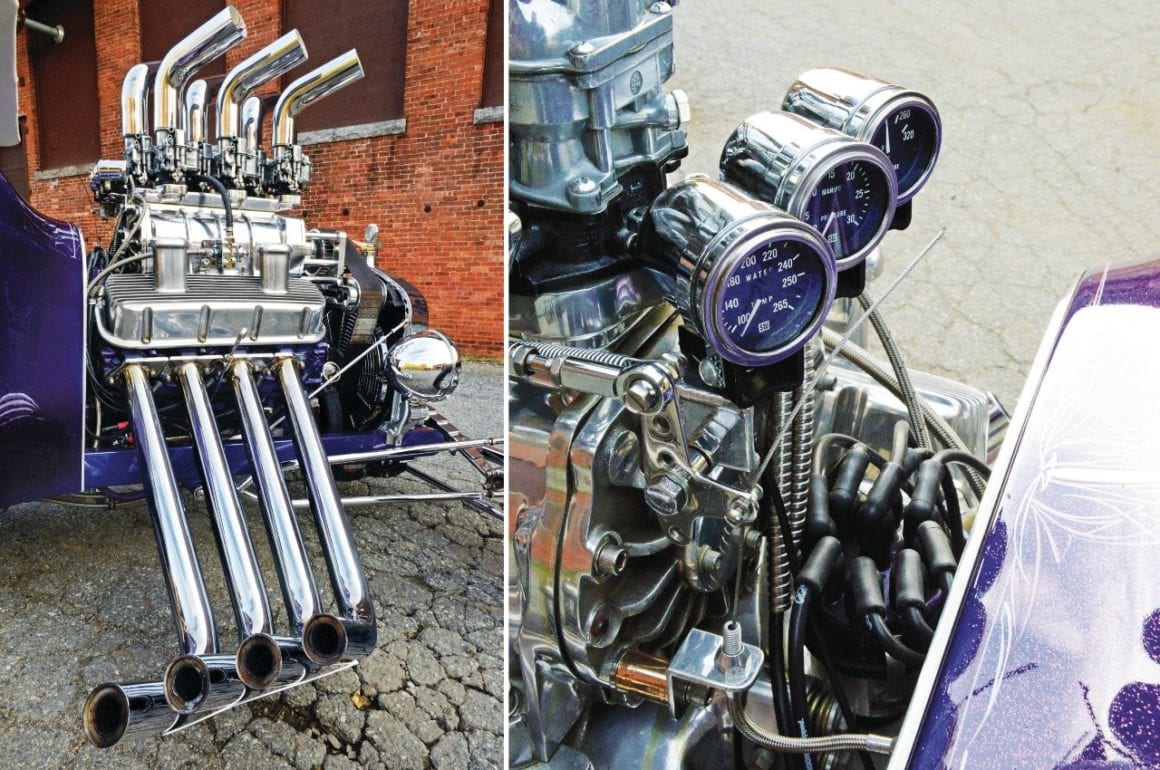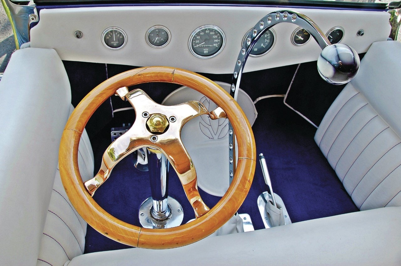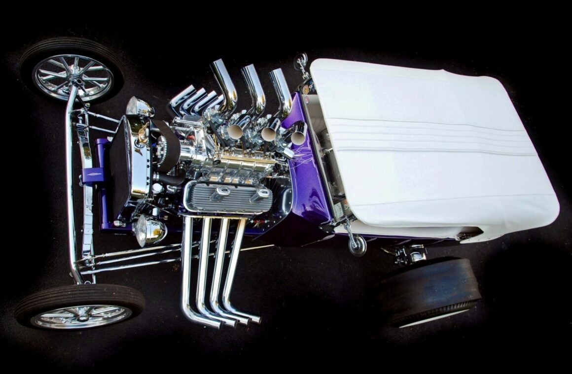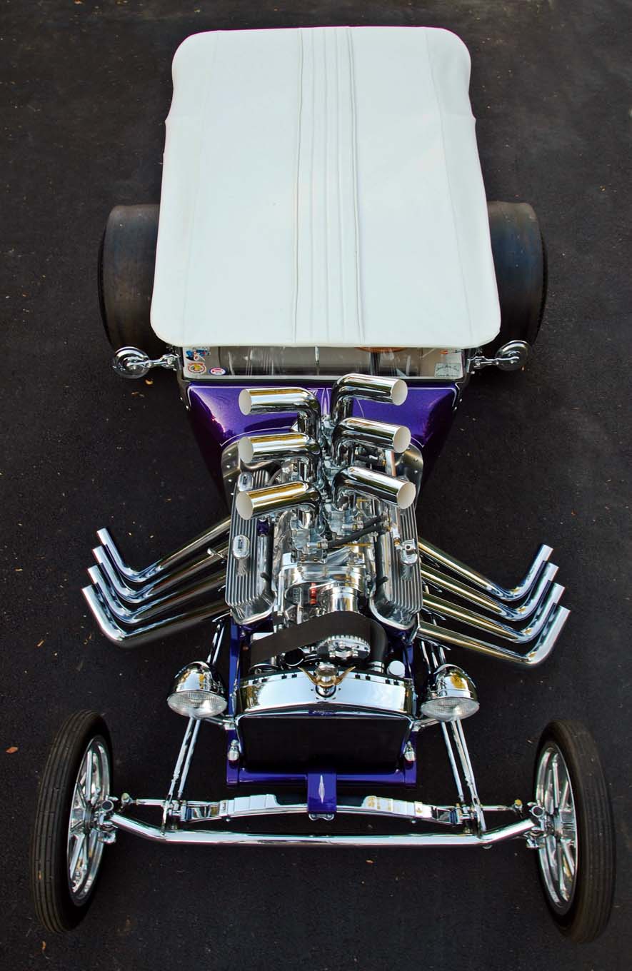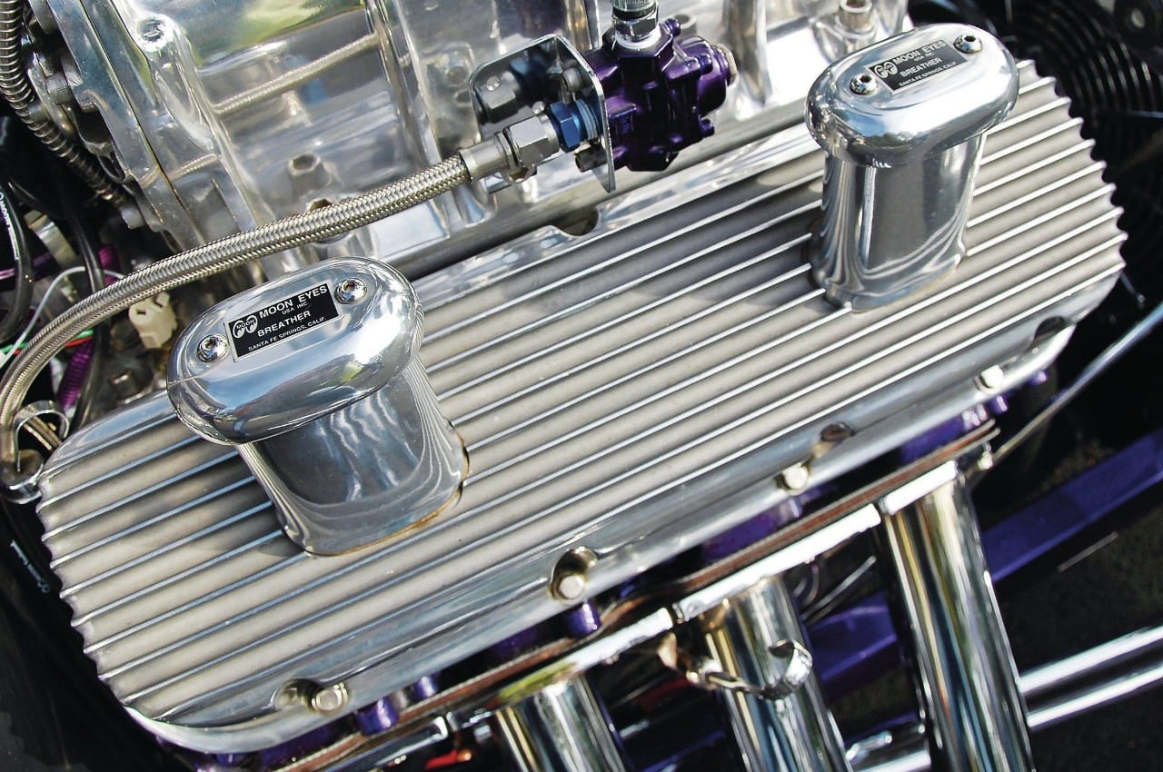 D’ailleurs, en “bon” rital-américain, durant l’hiver 1997, il a voulu reconstruire le Rod et a préparé (seul) la voiture pour cela. Étonnamment, ses deux amis ont laissé faire… et, la première chose qui a été changée fut le moteur : “J’ai acheté un 402ci Chevy big-block et ajouté un blower 6-71”…, m’a dit Mario, ajoutant qu’il avait acheté des pièces Dean Moon… La touche finale étant la couleur, Mario ayant choisi un “Kolor candy UK-17 violet” vaporisé sur une couche de base “BC-04 Shimrin bleu”. La voiture fut prête juste à temps pour assister au deuxième Goodguys annuel à Columbus, en Ohio, en 1999, où il a obtenu le premier prix.