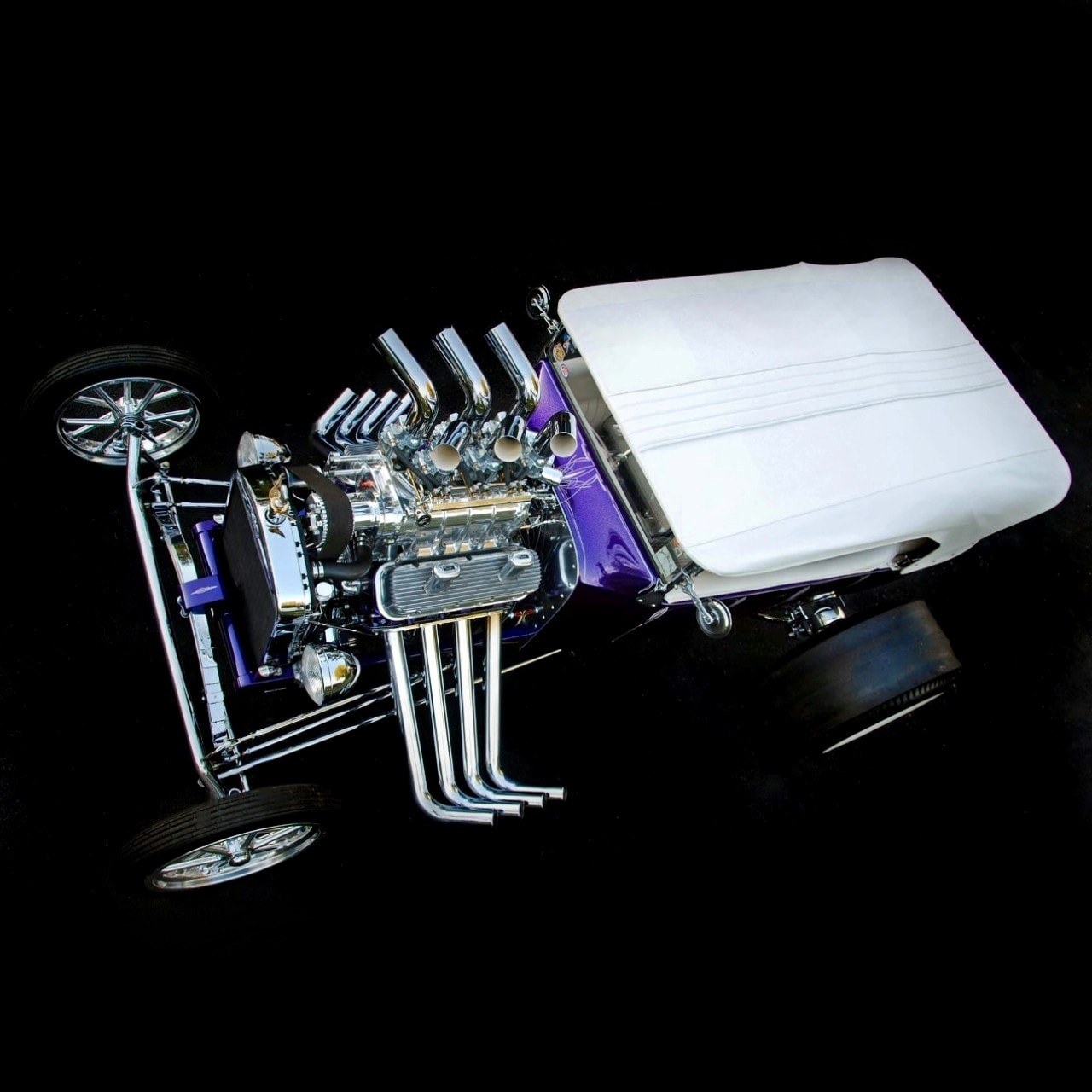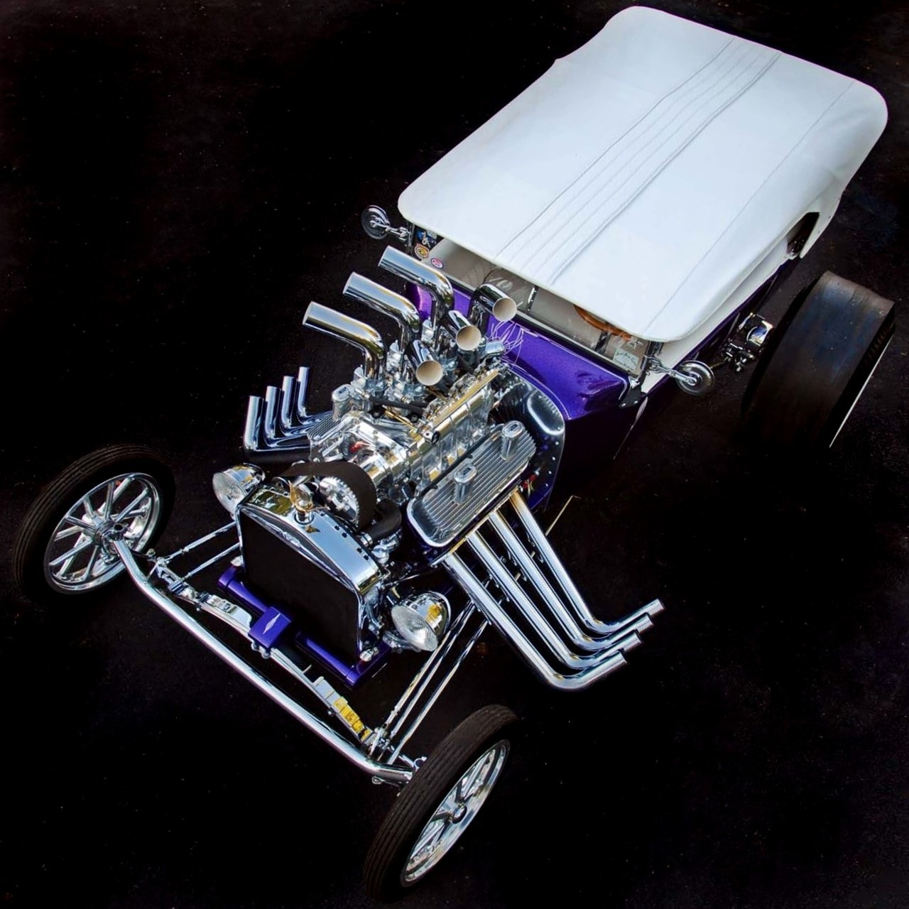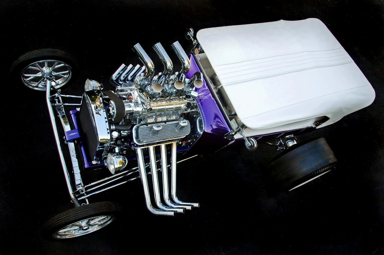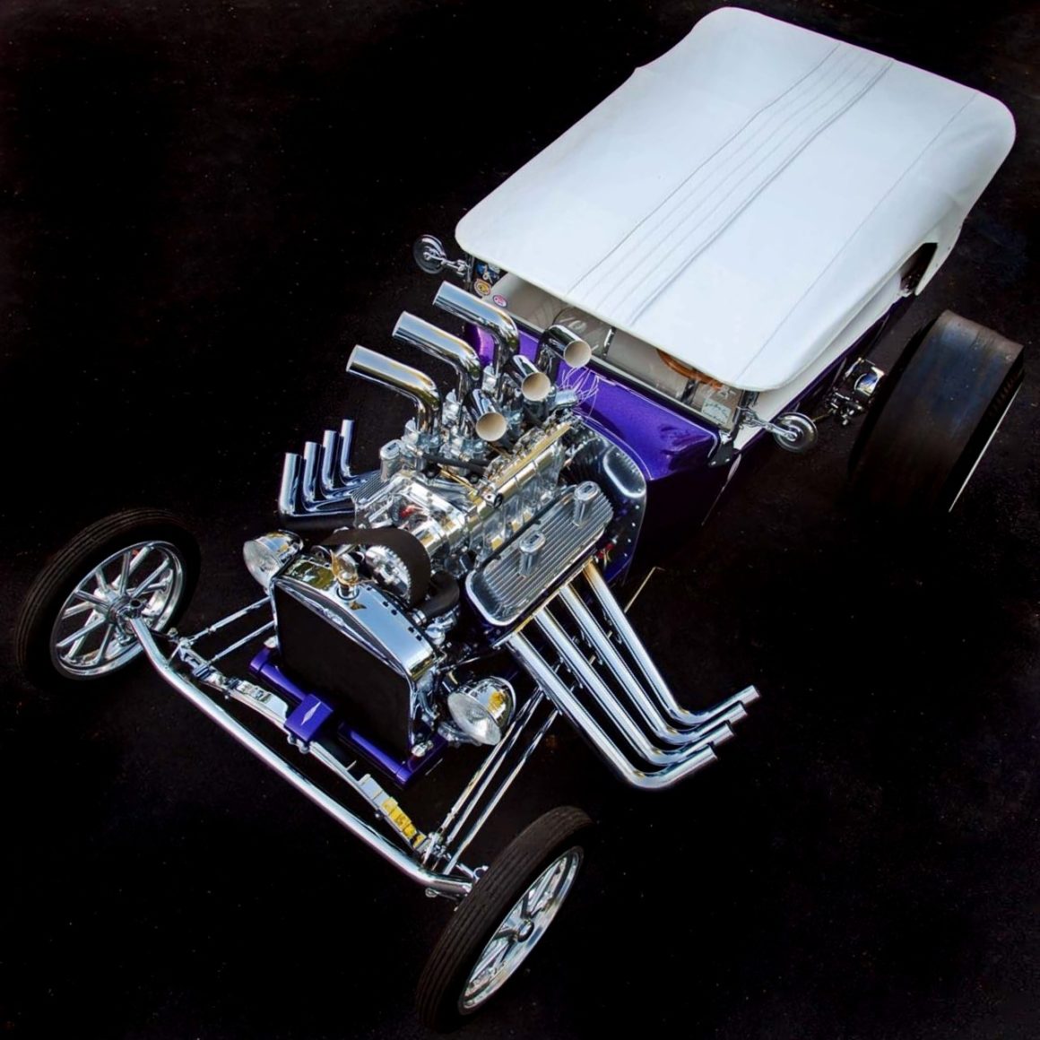 D’ailleurs, en “bon” rital-américain, durant l’hiver 1997, il a voulu reconstruire le Rod et a préparé (seul) la voiture pour cela. Étonnamment, ses deux amis ont laissé faire… et, la première chose qui a été changée fut le moteur : “J’ai acheté un 402ci Chevy big-block et ajouté un blower 6-71”…, m’a dit Mario, ajoutant qu’il avait acheté des pièces Dean Moon… La touche finale étant la couleur, Mario ayant choisi un “Kolor candy UK-17 violet” vaporisé sur une couche de base “BC-04 Shimrin bleu”. La voiture fut prête juste à temps pour assister au deuxième Goodguys annuel à Columbus, en Ohio, en 1999, où il a obtenu le premier prix.