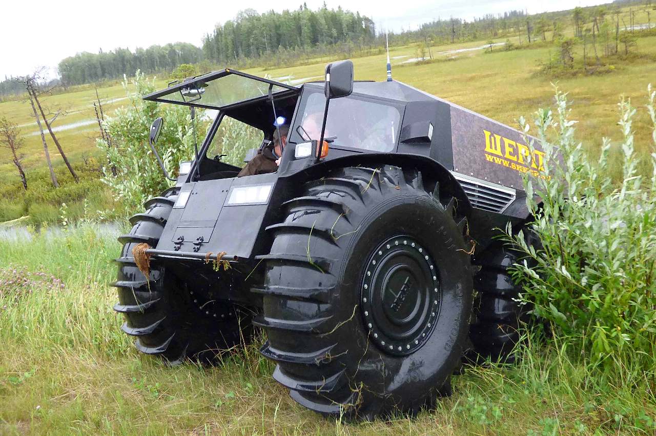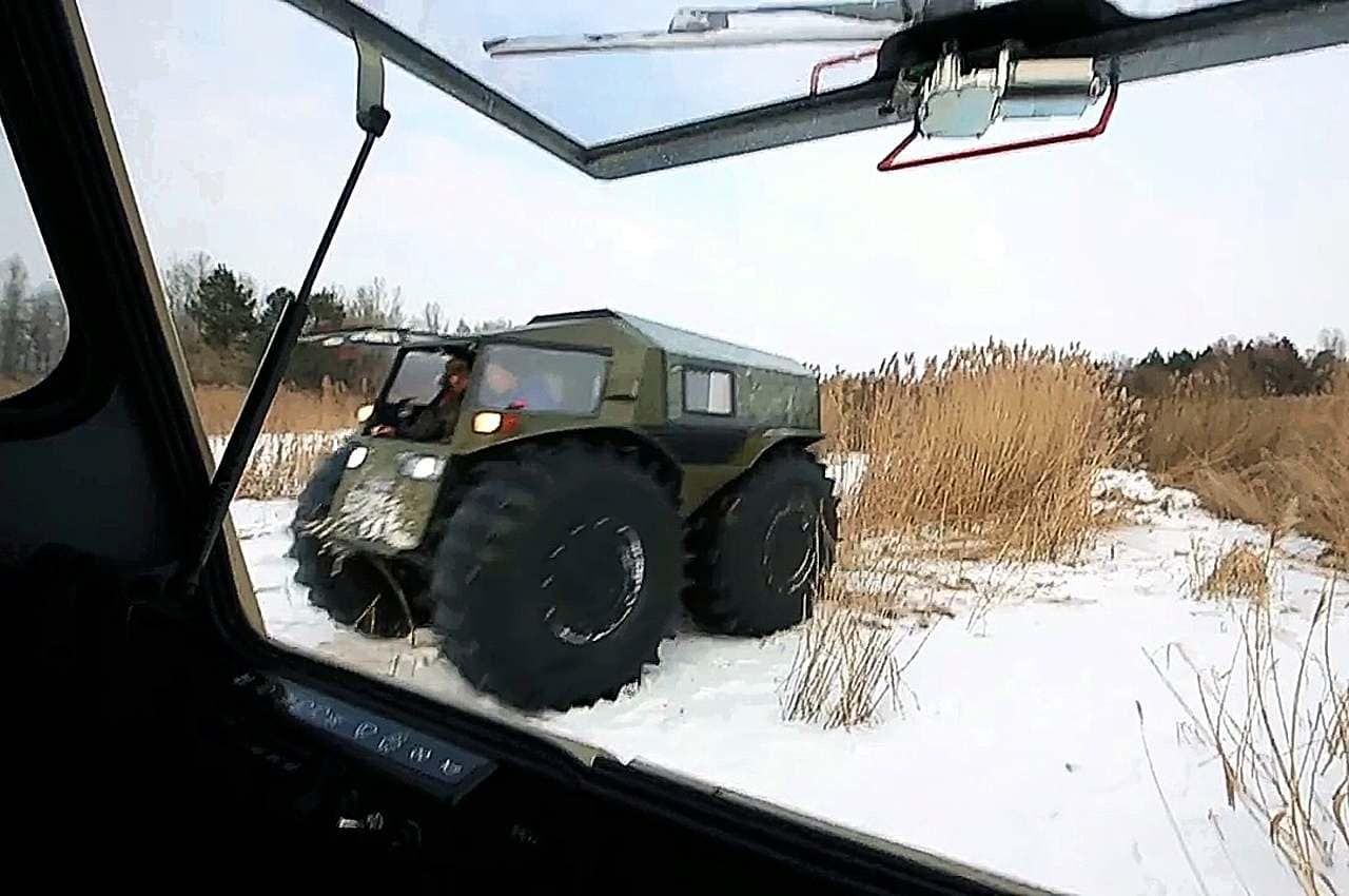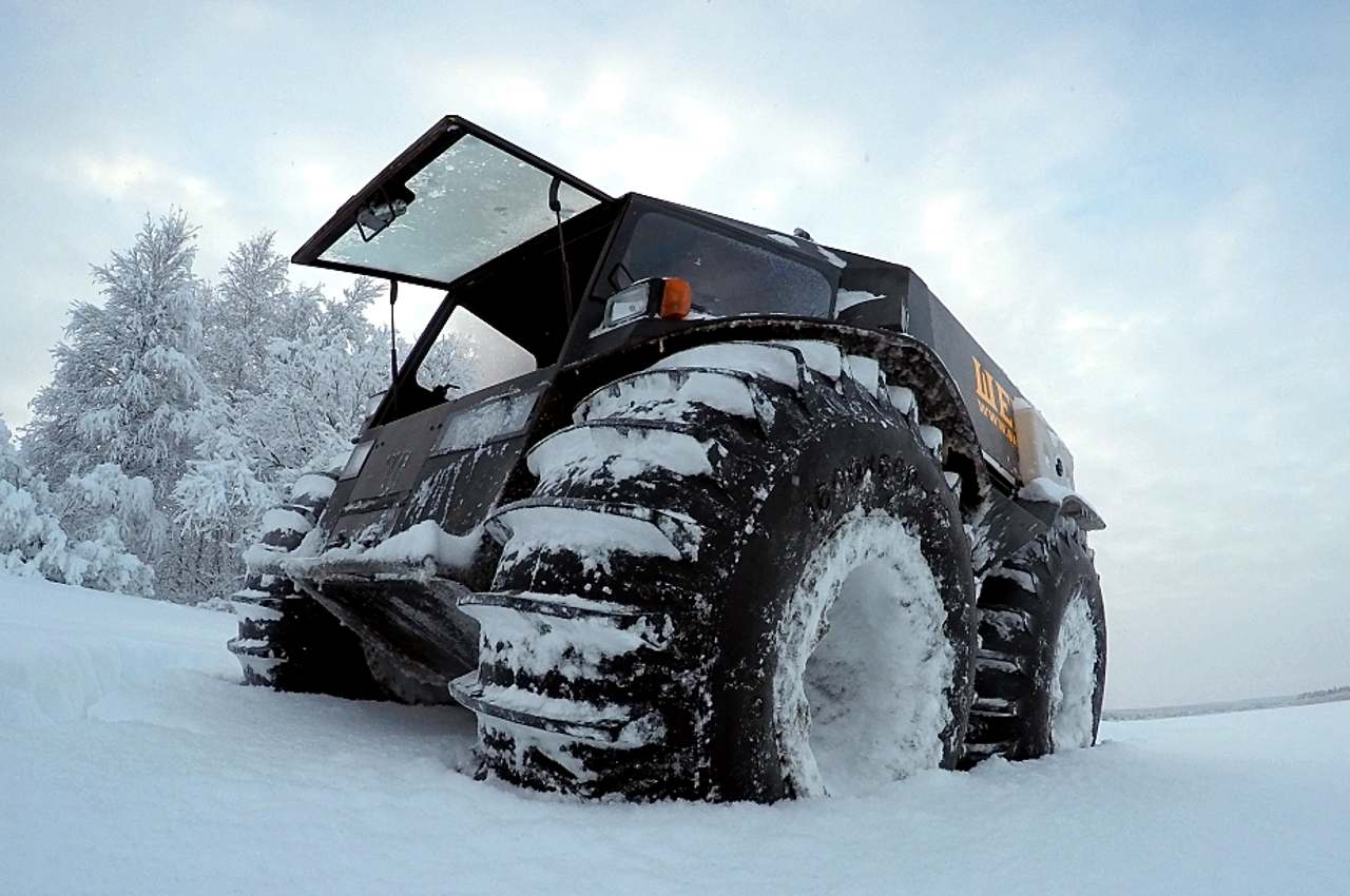 -“La caractéristique principale de ce type de véhicules est leurs pneus”, m’a expliqué Alexeï Garagachian.. “Plus ils sont gros, plus les capacités de franchissement sont importantes et mieux il flottera. Mais je n’ai jamais vu de tout-terrain pouvant faire autant de choses que le nôtre”…