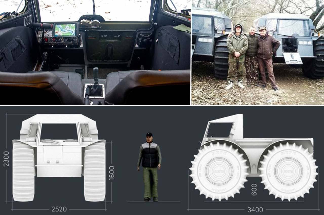 Conçu par le designer Alexeï Garagachian, le véhicule, tout droit sorti d’un film de science-friction (sic !), se présente comme un cube compact, monté sur des pneus extra-basse-pression de 1600 х 600 х 25.