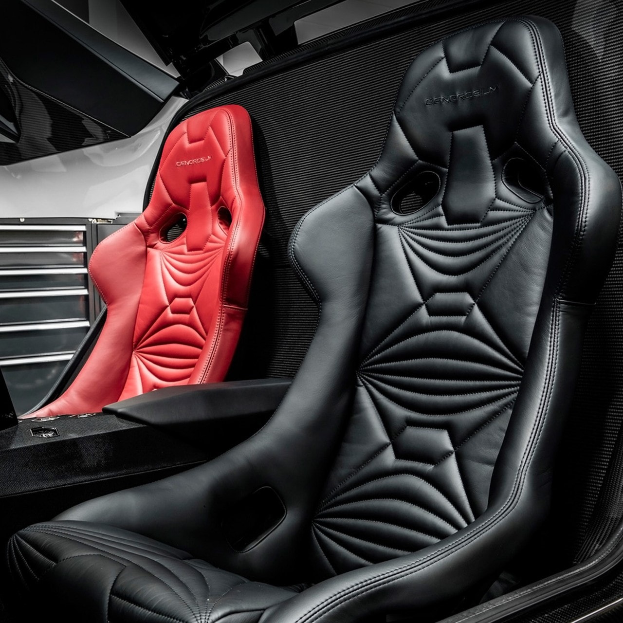 – Les deux occupants profitent d’une atmosphère rappelant celle de la course, avec un siège rouge pour le conducteur et noir pour le passager, tous deux installés au plus près du sol, l’instrumentation étant constituée de petits écrans digitaux…