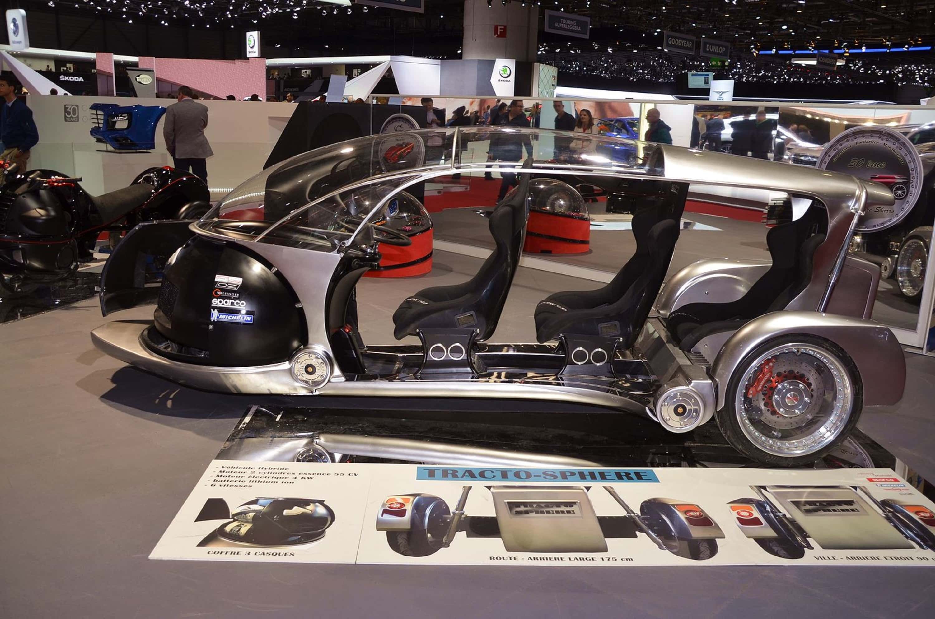 A l’occasion du dernier salon de Genève, je n’ai pas été déçu de ma visite, outre une création personnelle de l’Espace Sbarro, la Tracto Sphère, sorte de moto à trois roues, capable d’emmener trois passagers assis l’un derrière l’autre avec pour l’entraînement un bloc Kawasaki (hybride) 300 cm3 de 55 chevaux agissant sur la roue avant coiffée d’un sphère où il est possible d’y entreposer les trois casques occupants. Mais ce n’est pas du tout car les deux roues arrière peuvent via un système assez ingénieux passer de 90 à 170 cm de large, rendant ainsi possible la remontée de files pour se faufiler entre les voitures.
